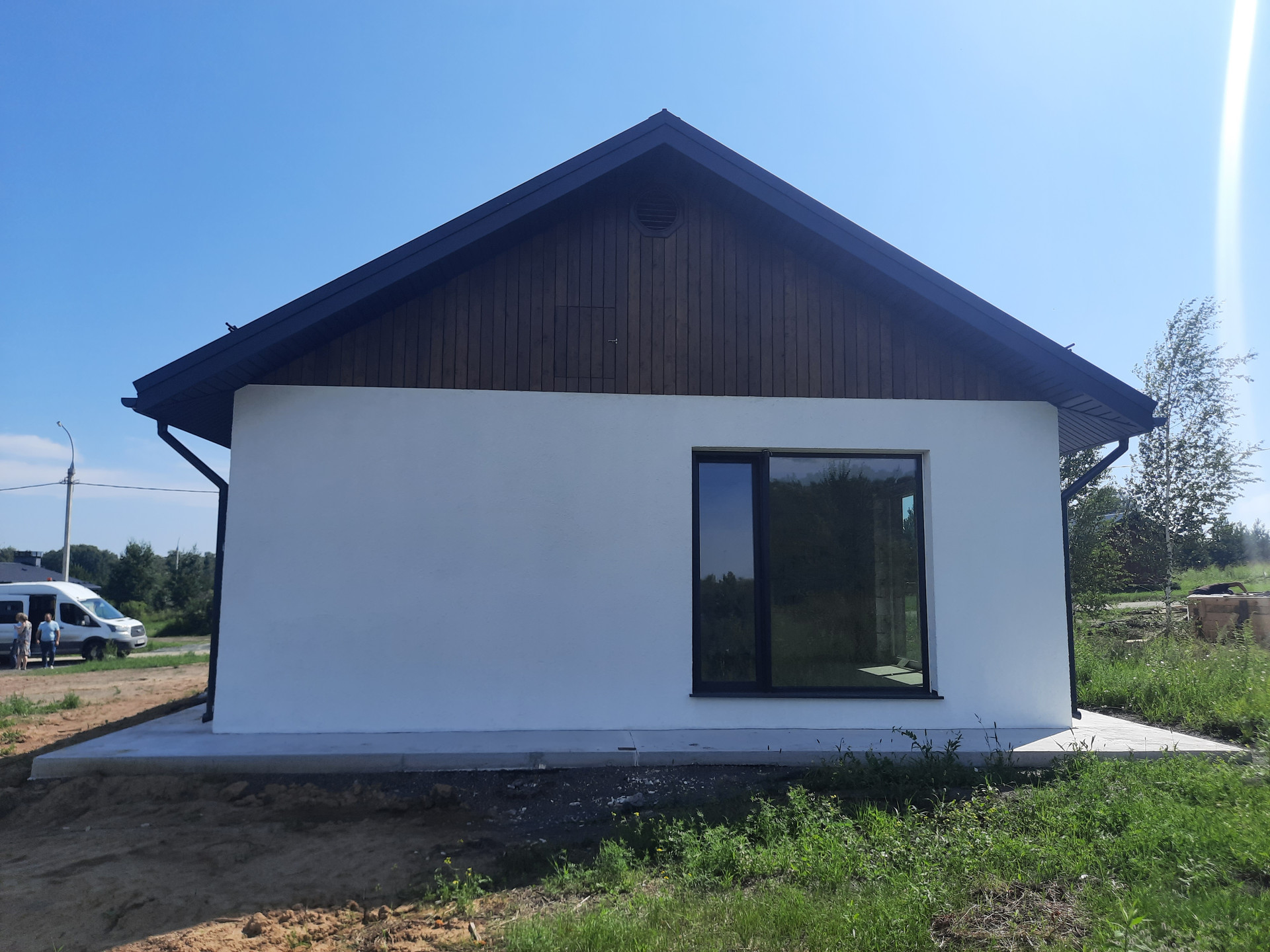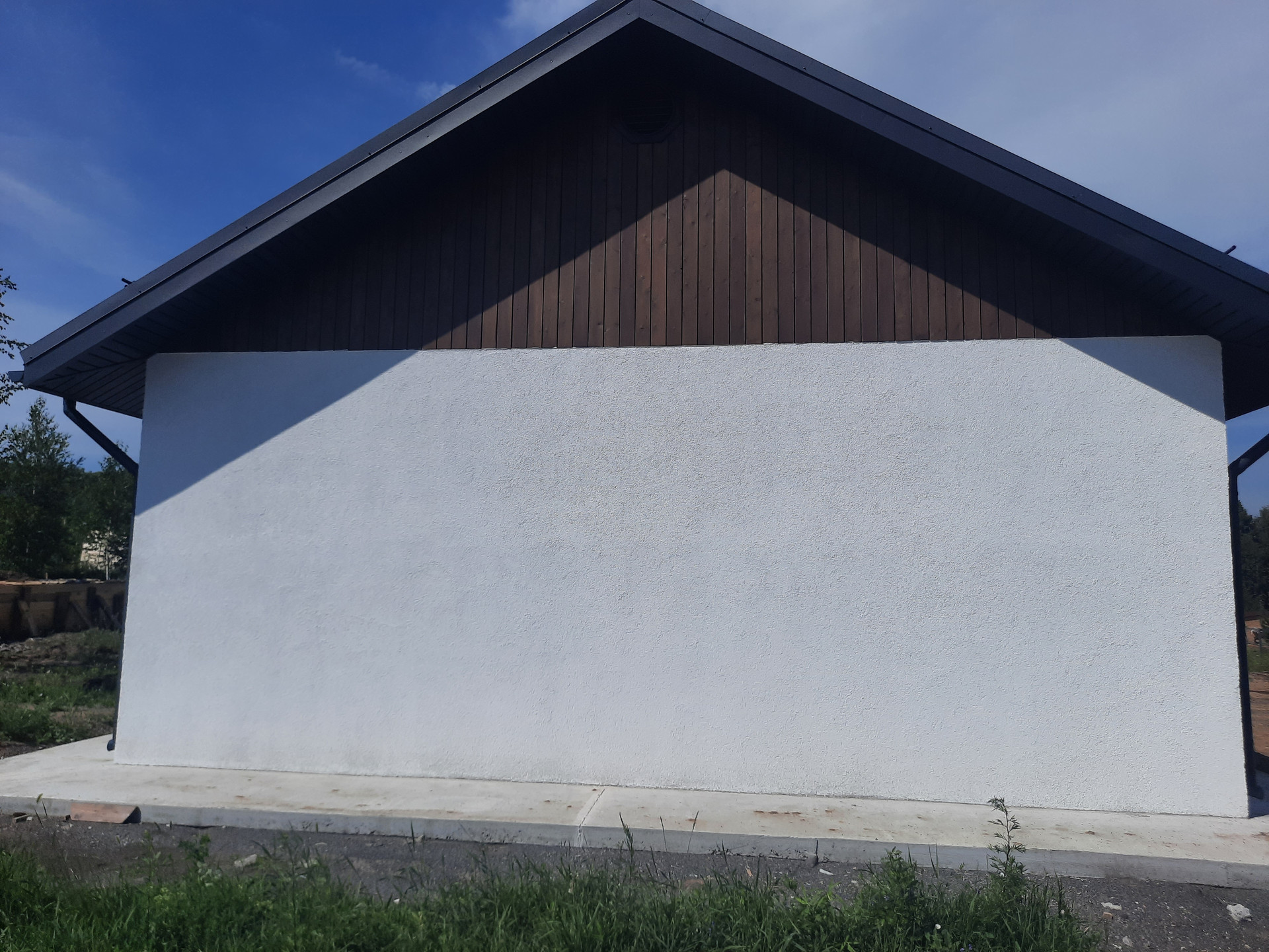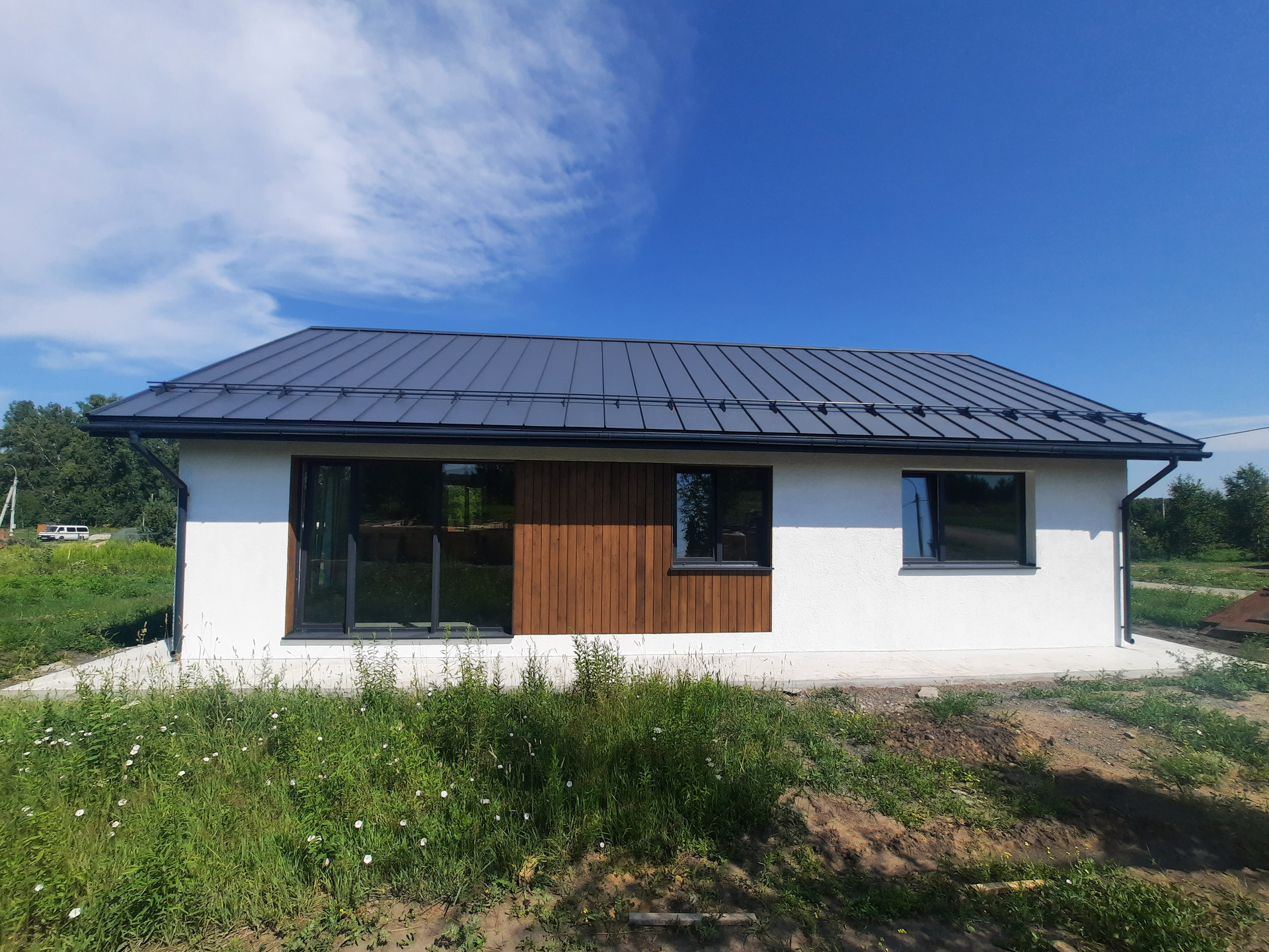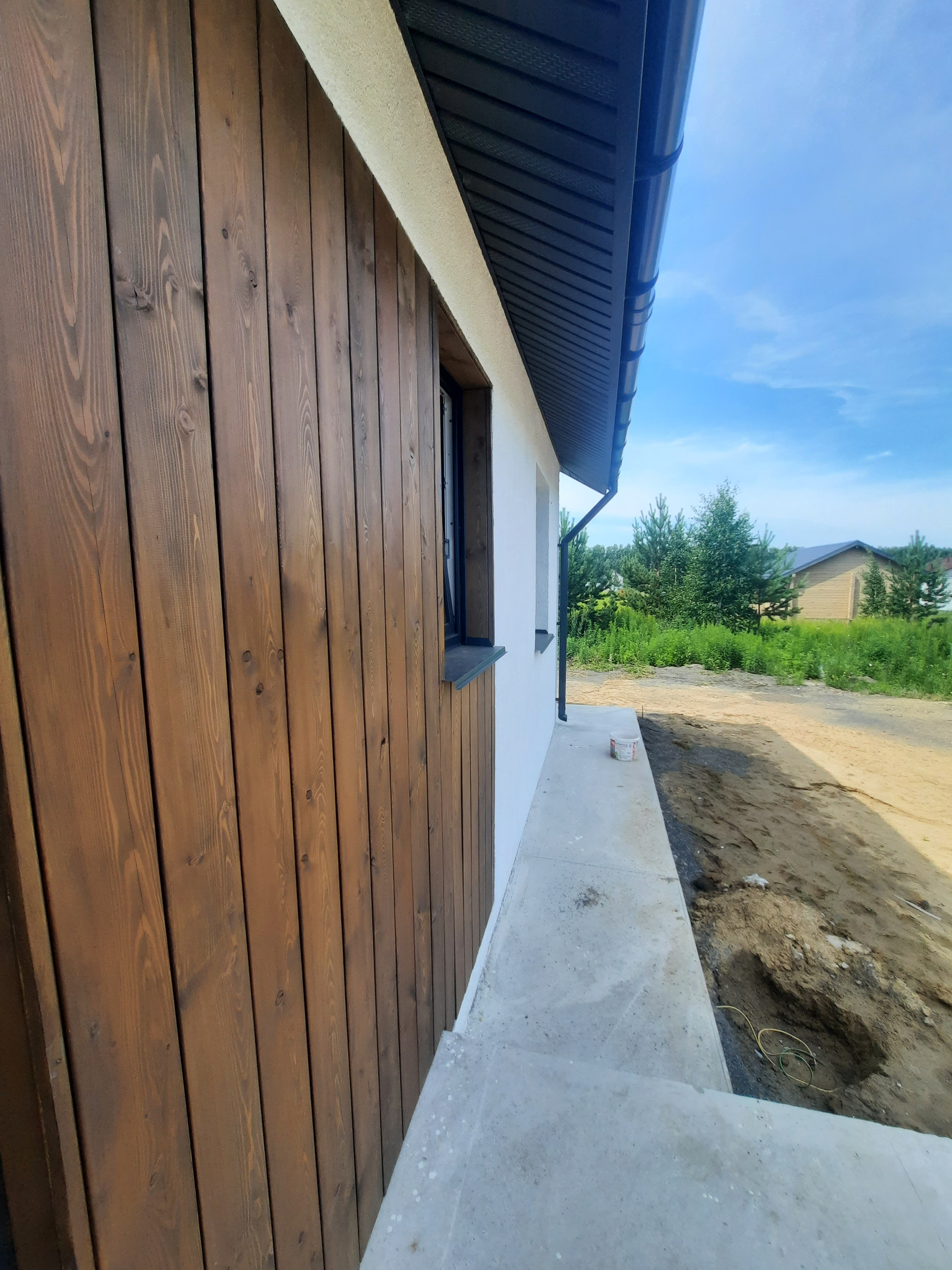 - Фасад: мокрая штукатурка и планкен;