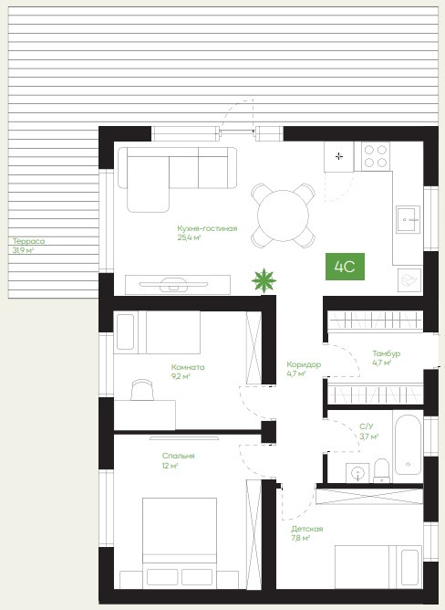 Дом имеет рациональную планировку - 3 спальни + кухня гостиная 25,4 м²