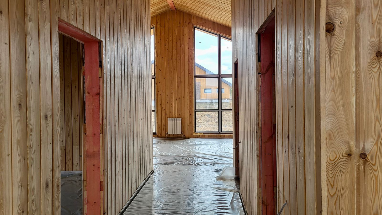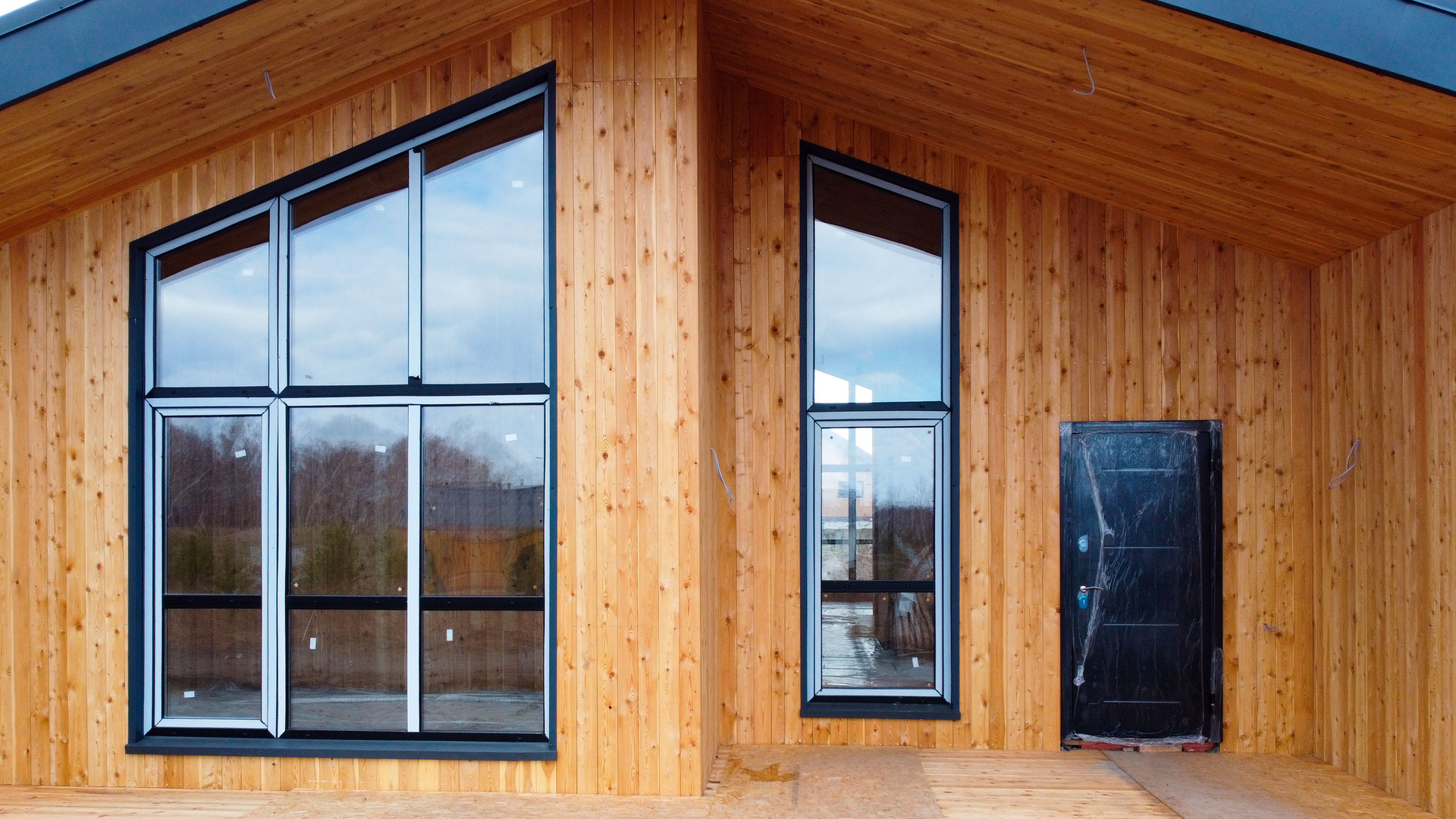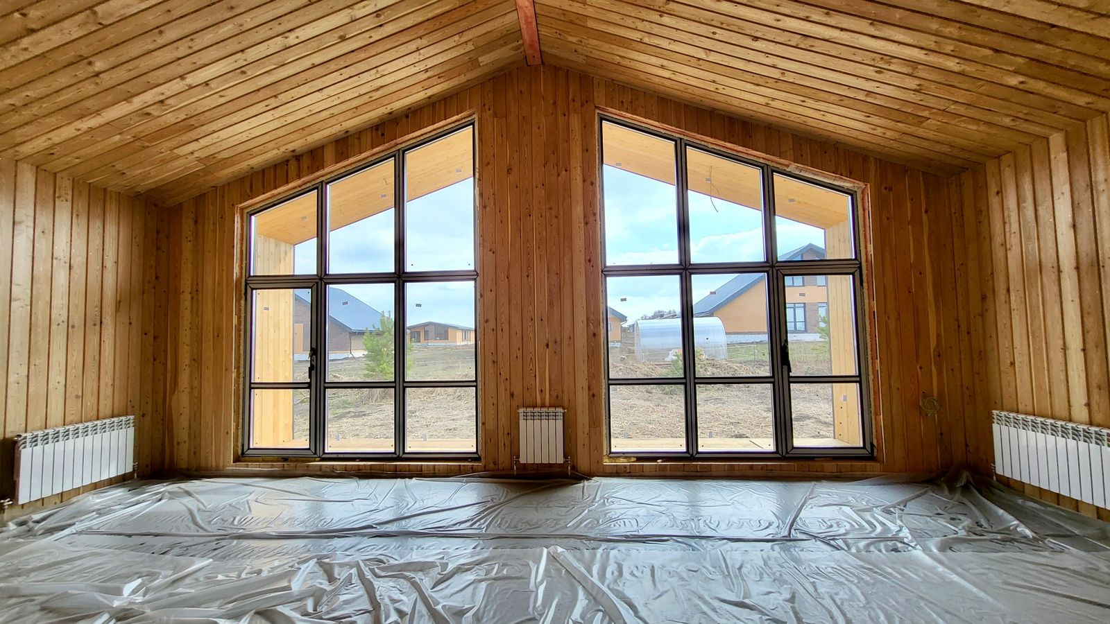 составной деревянный каркас (доска 150*50 мм; брус 150*150 мм), утепление 200 мм, разводка электрики, отделка гипсокартонном.