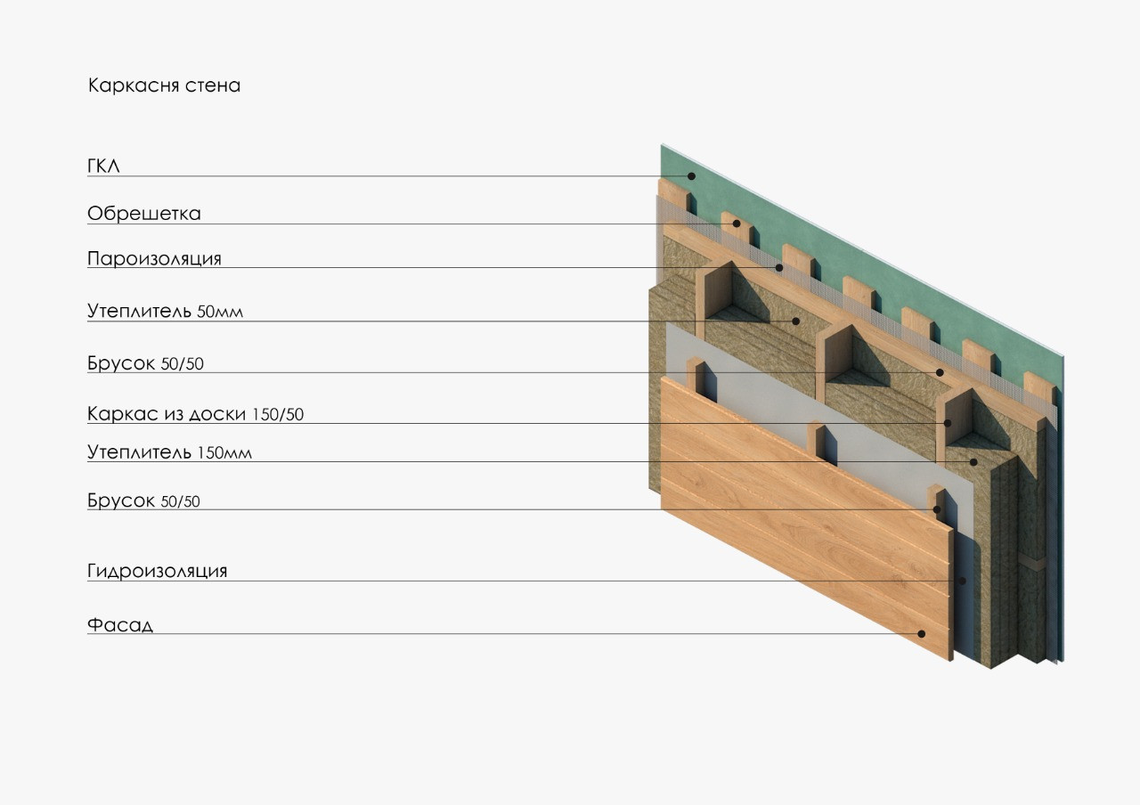 - каркас: (доска 150*50 мм; брус 150*150 мм), утепление минеральная вата 150 мм (три слоя внахлест)⠀