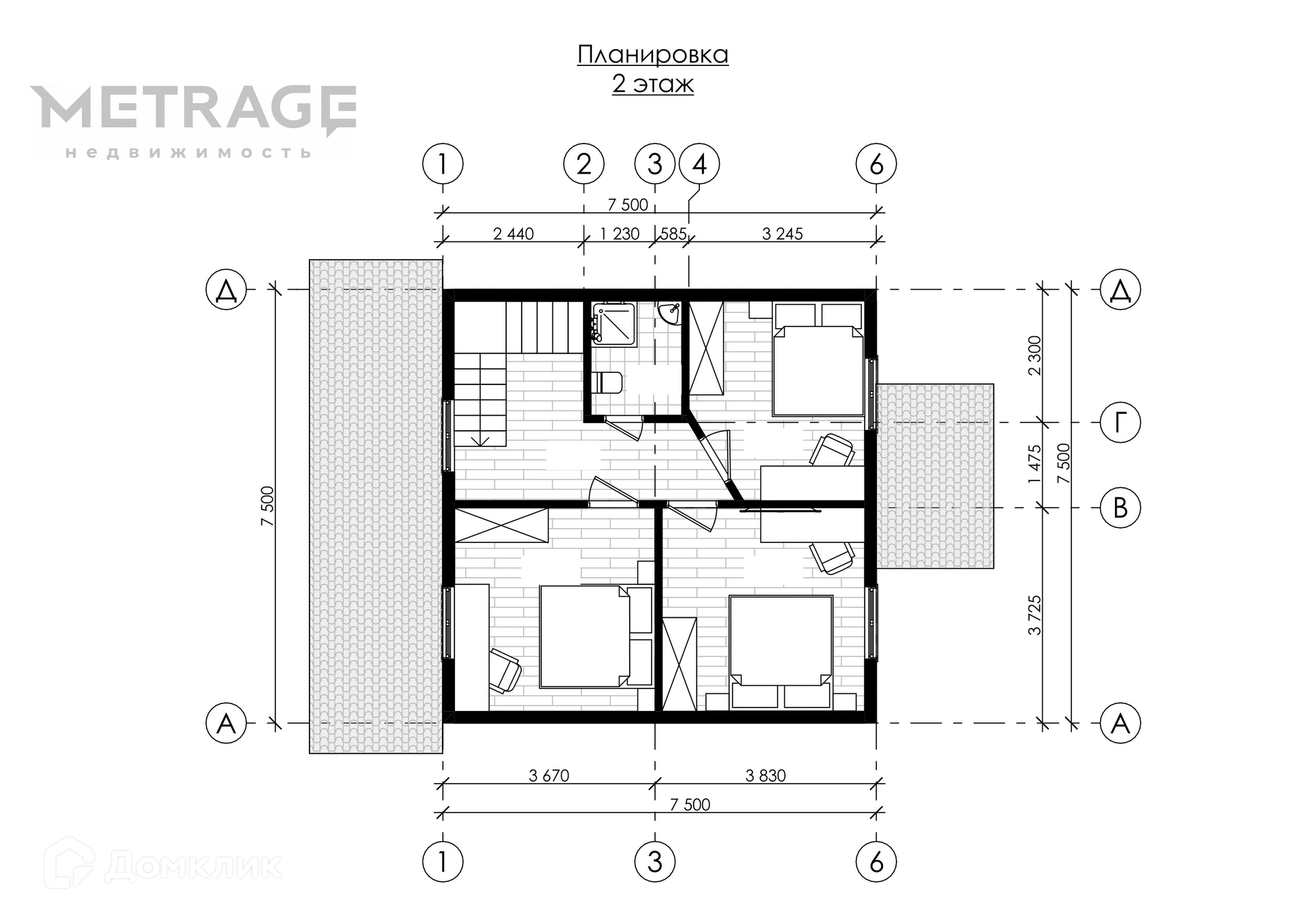 Арт. 22774 Каркасный двухэтажный дом 7.5 на 7.5 м2, полезной площадью 112.5м2 с бойлерной, террасой, кухней-гостиной и одной спальней на первом этаже и тремя спальнями на втором этаже.