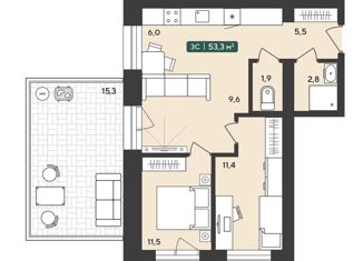 Общая площадь: 53.3 м2