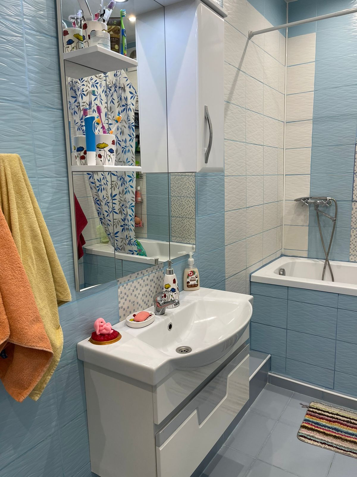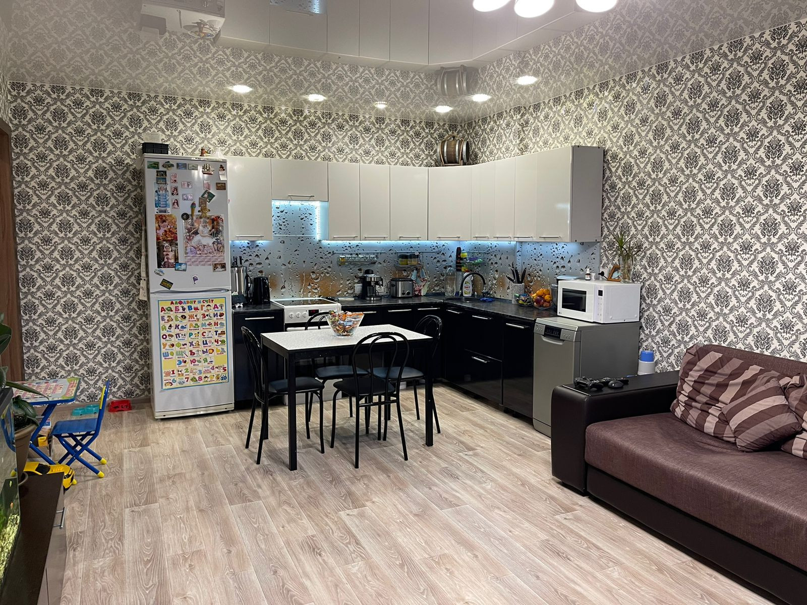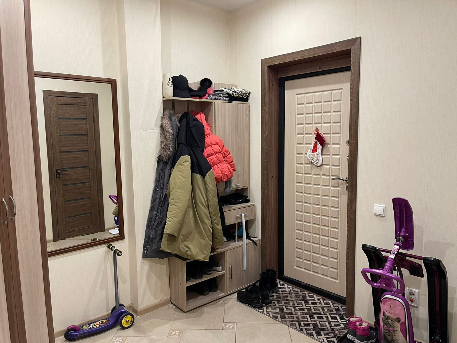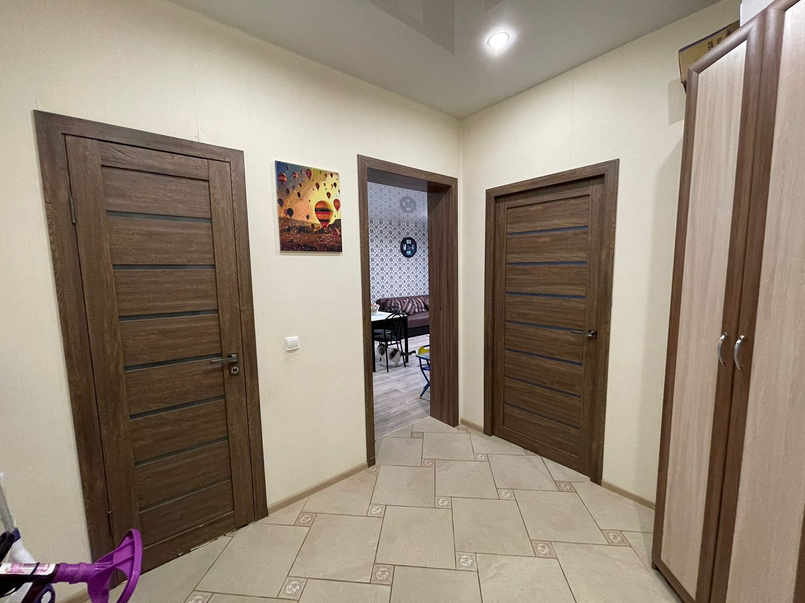 В коридоре и ванной комнате теплые полы . Во всей квартире натяжные потолки . Балкон не застеклен . Радиаторы все заменены на биметалические радиаторы . Вся проводка сделана дорогими проф.материалами . Квартира теплая, на данный момент даже отключены батареи , потому что тепла хватает .  В микрорайоне работают 3 садика,  новая школа . Из крупных магазинов  магнит , Мария-ра, магнит косметик , фармакопейка и очень много маленьких частный магазинов с различной продукцией . В поселке есть фитнес клуб, стоматология , фельдшерский пункт , также можно сдать анализы . Для детей различные секции (танцы, пение , гимнастика и т.д)