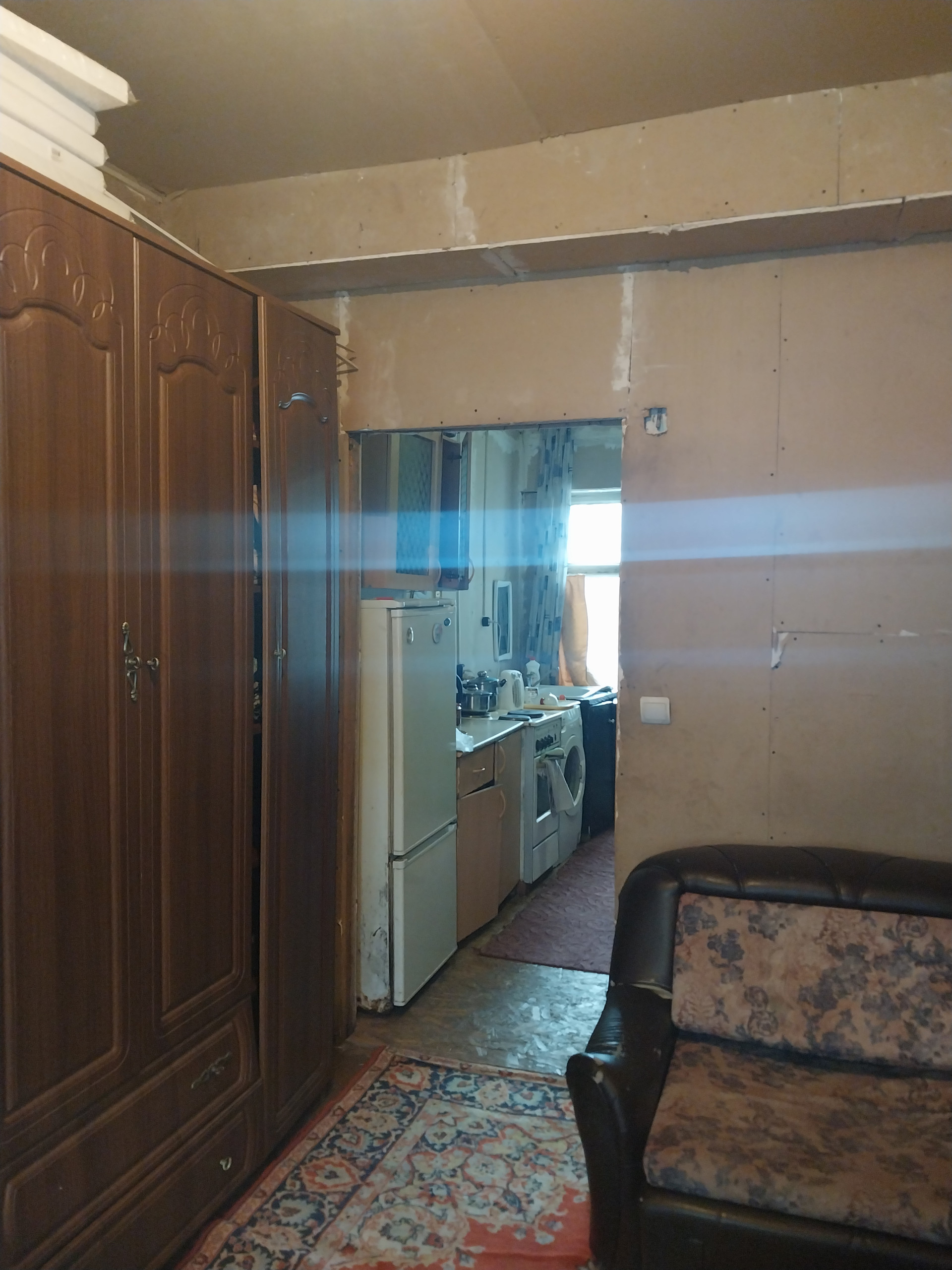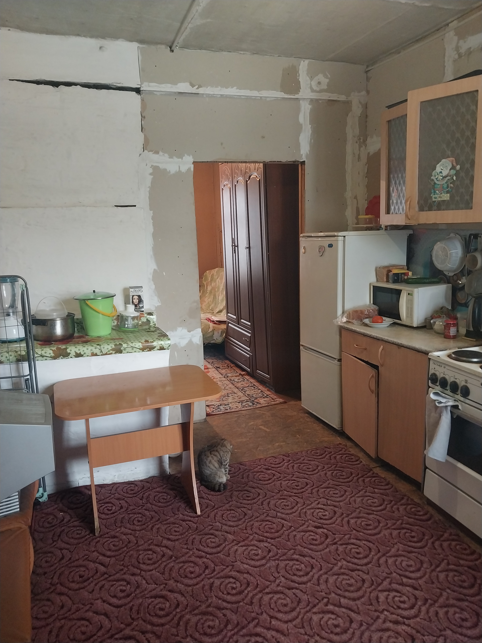 Новая проводка,новая печь( отопление печное), стены выровнены гипсокортоном. Требуется косметический ремонт, центральный водопровод