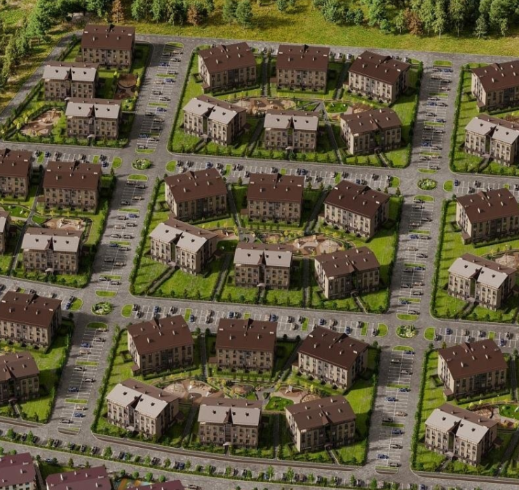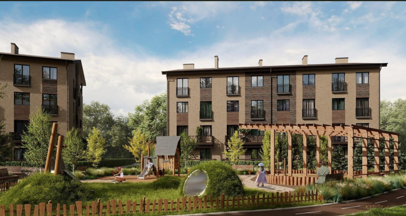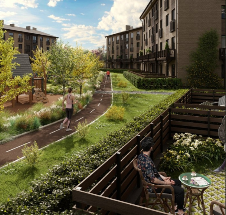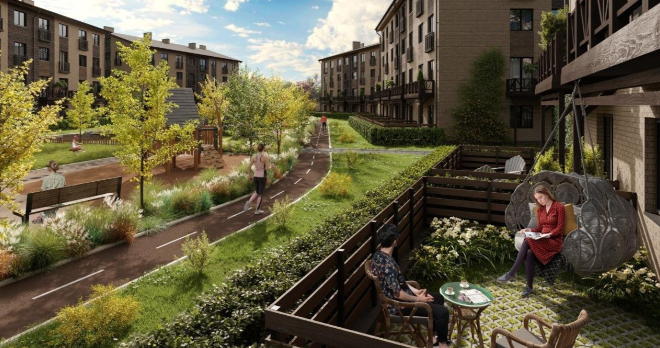 В квартале строятся малоэтажные дома в стиле «шале», спроектированные по образцу европейских городков района Альп. Комбинированная отделка из светлого и темного-коричневого кирпича, элементы из натуральной древесины, крыша с длинными и пологими скатами — весь экстерьер переносит в уютную, немного праздничную атмосферу дворика, который можно найти в пригородах Австрии или Швейцарии.