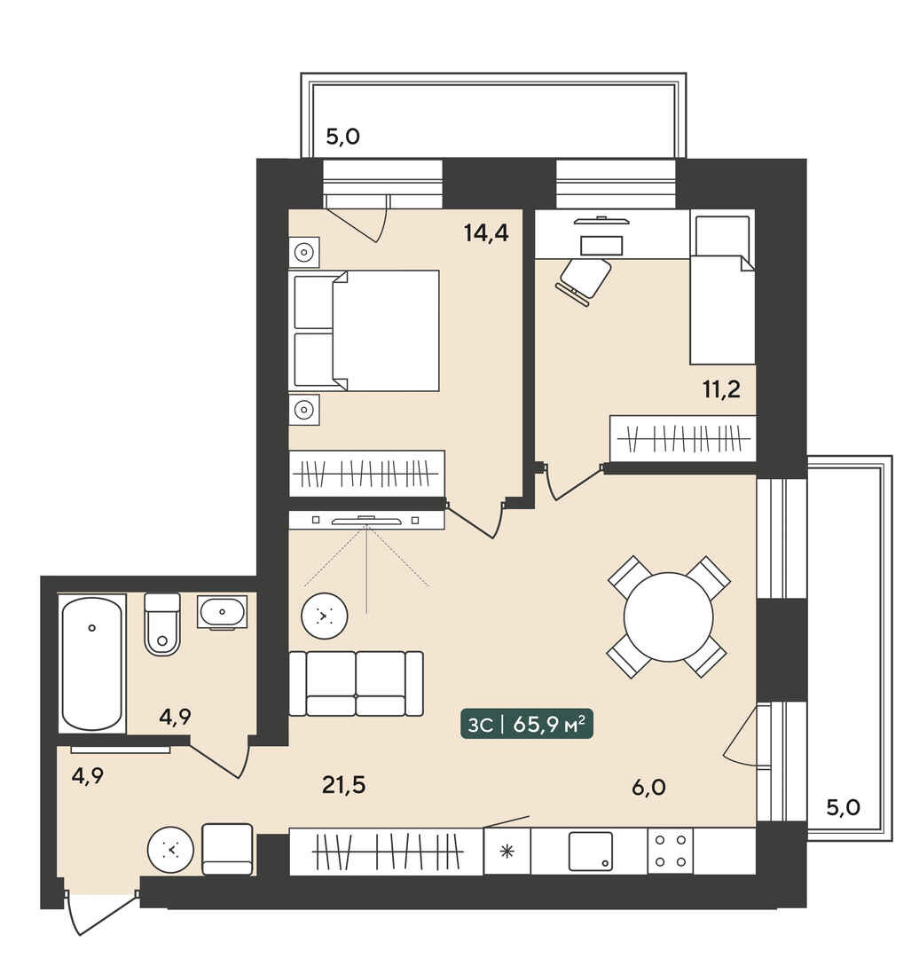 Общая площадь 65.9 м2