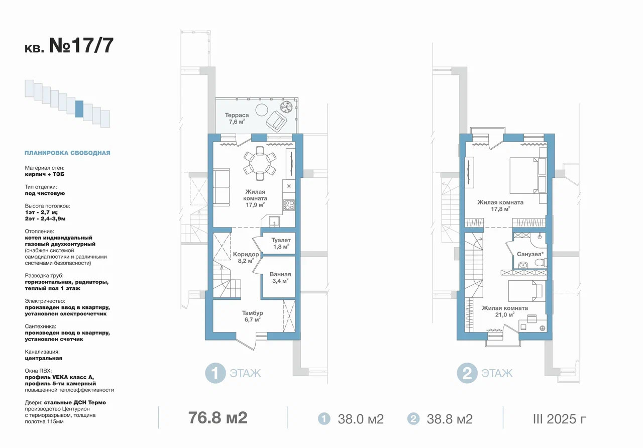 Имеются все коммуникации. На 1 этаже теплый пол. 2 этаж свободная планировка. Готовая лестница.