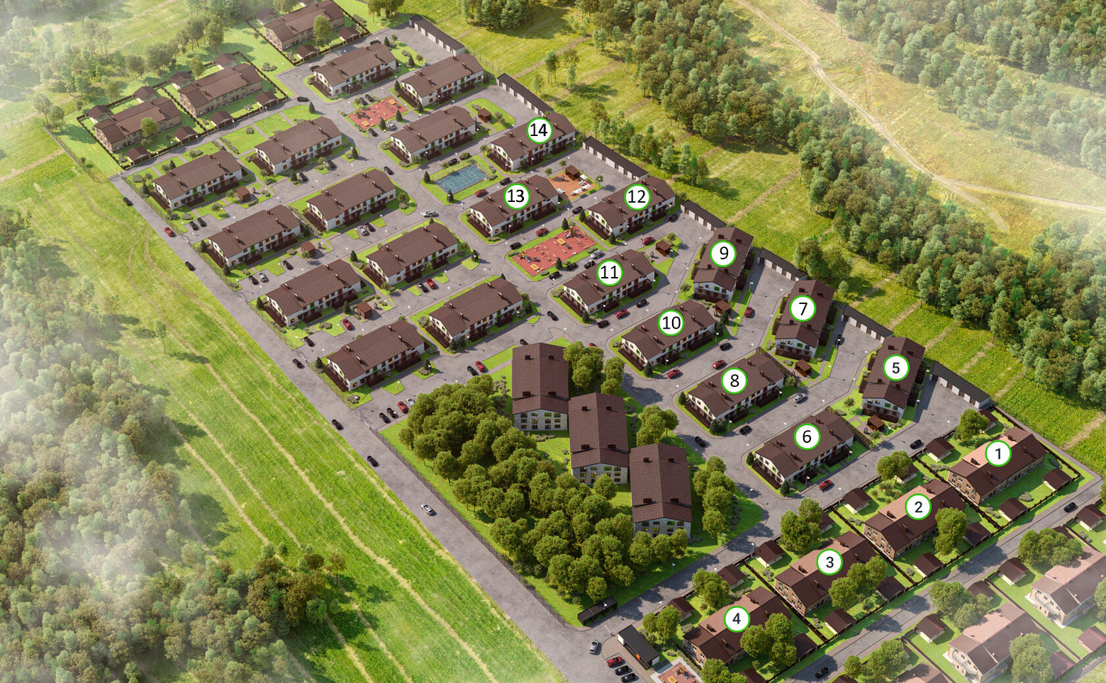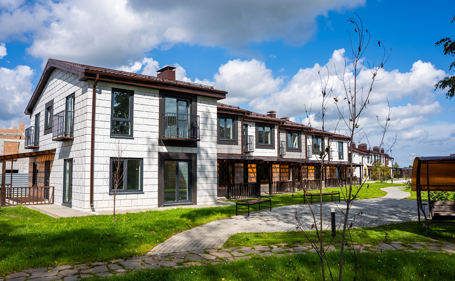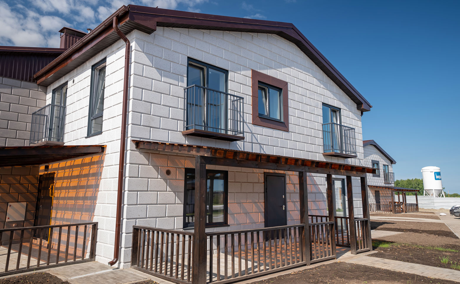 Квартал рассчитан на 28 двухуровневых дома с террасами, собственными участками и гаражами. В оформлении фасадов используется облицовочный кирпич.