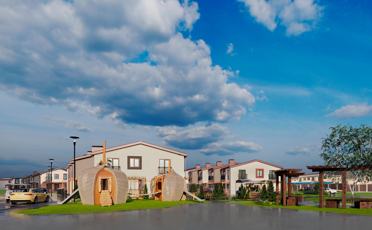 На закрытой территории расположены детские площадки, зоны отдыха с беседками, детский сад и школа. В шаговой доступности магазины, медицинские учреждения,  аптеки, фитнес клуб, площадка для выгула собак.