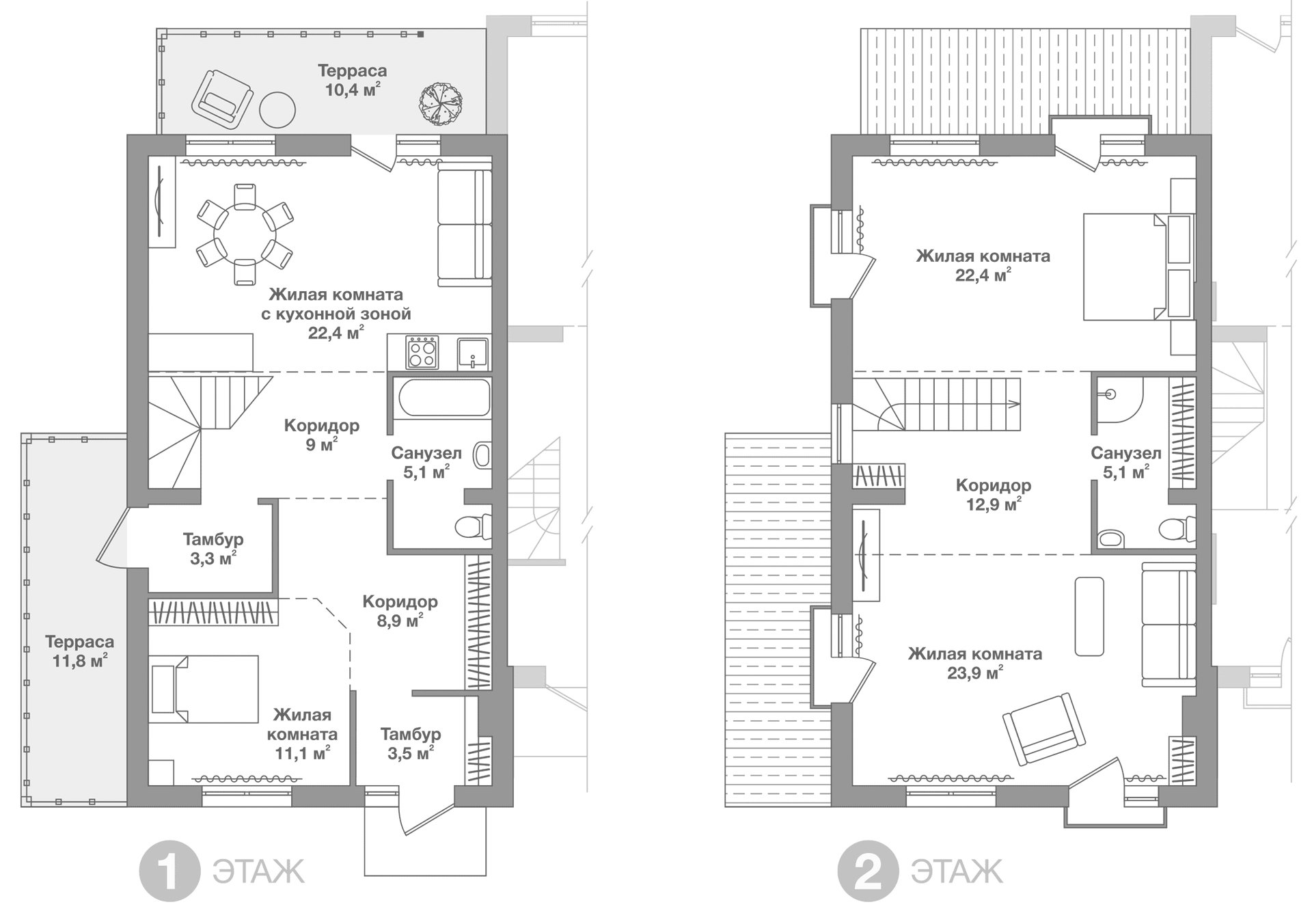Пол: 1 этаж — бетонное основание, подготовленное (с выравниванием и шлифованием) без стяжки, 2 этаж — выравнивающая стяжка, 60 мм