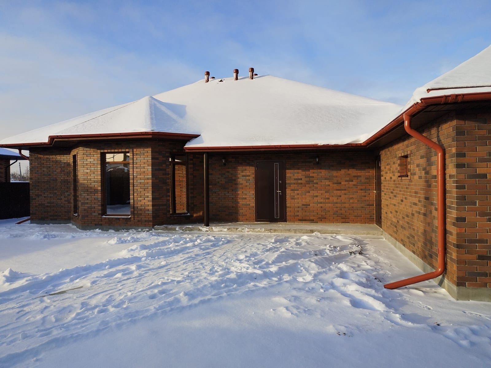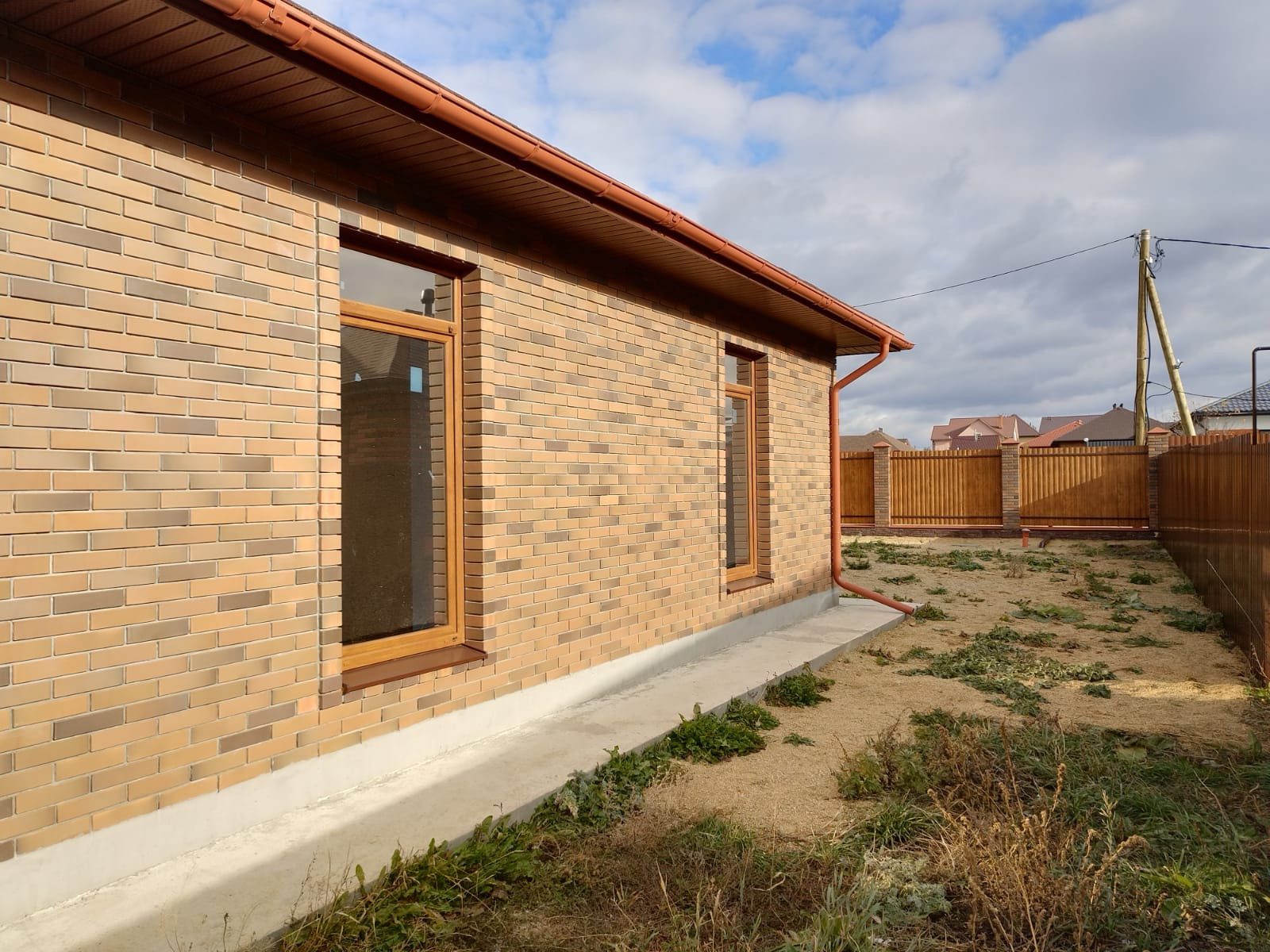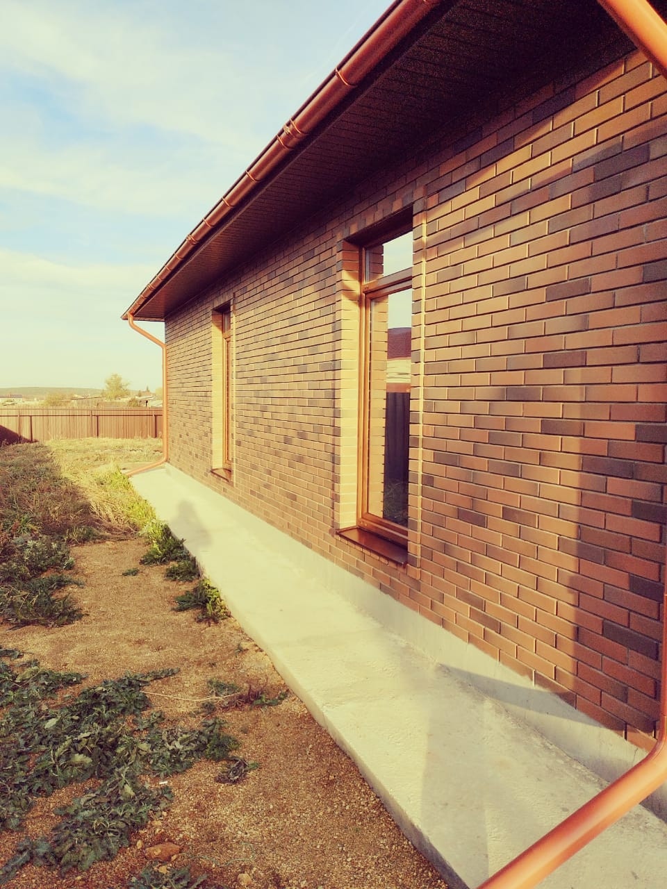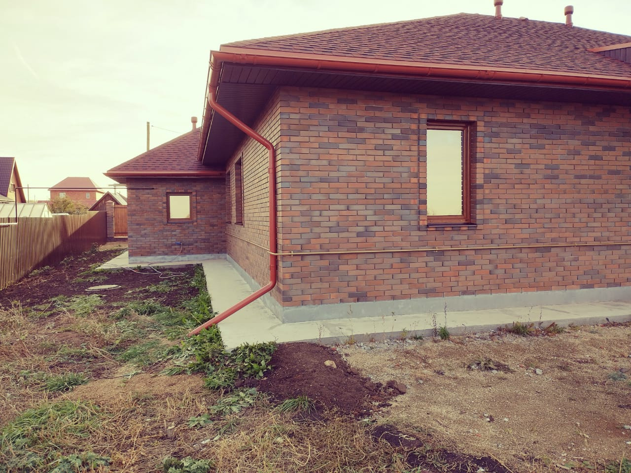 Дизайнерская кирпичная кладка. Крыша, окна, забор - в единой цветовой гамме.