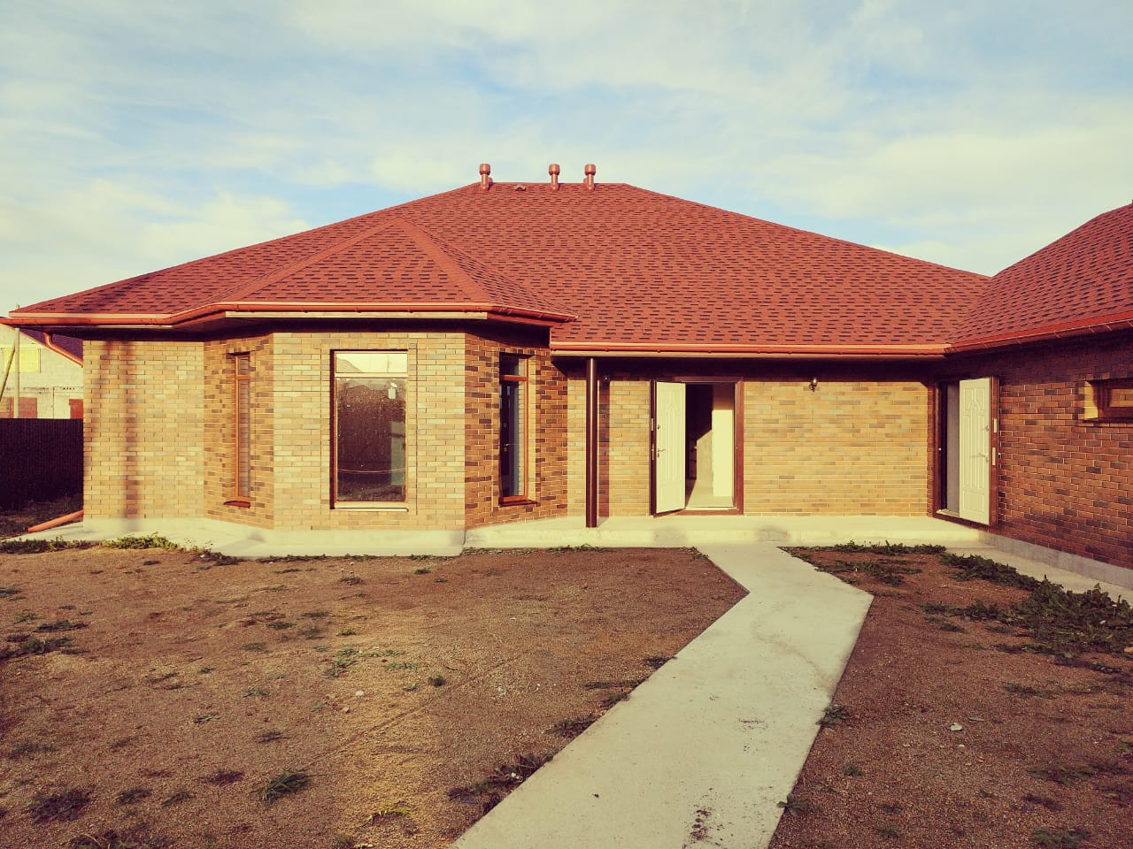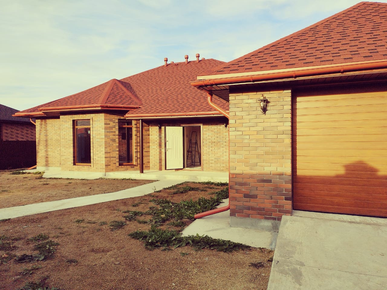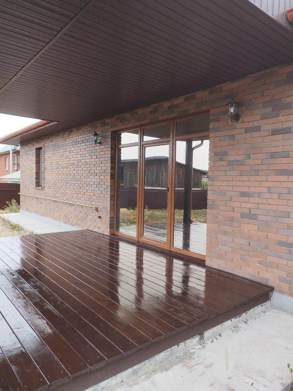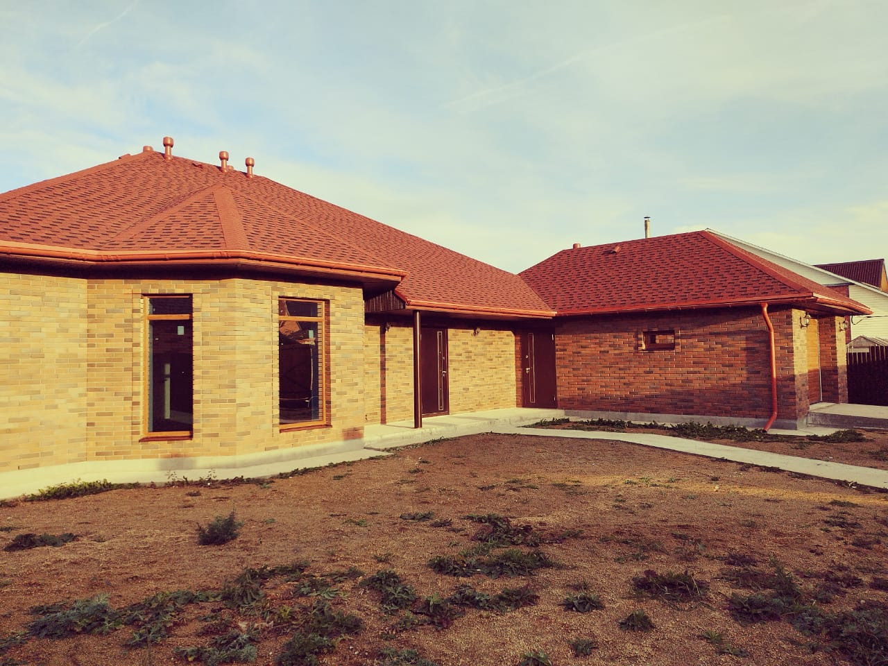 Дизайнерская кирпичная кладка. Крыша, окна, забор - в единой цветовой гамме.