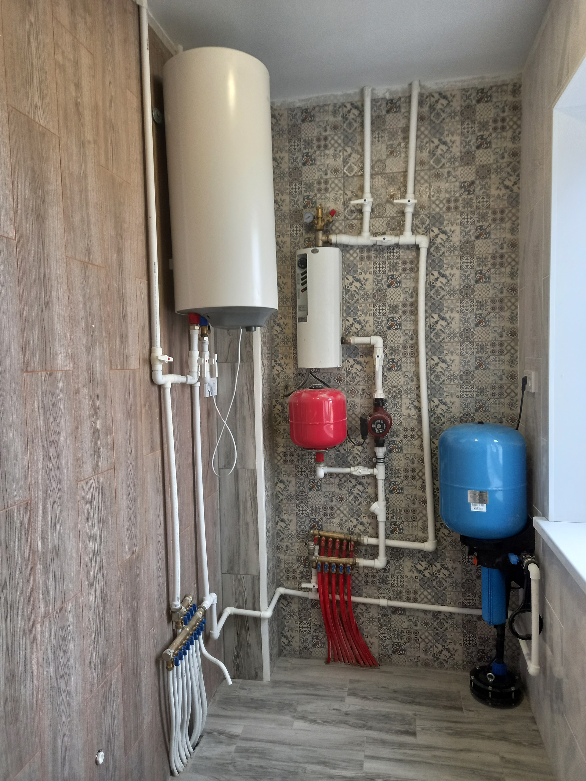 Теплый пол водяной во всех помещениях первого этажа, на втором - радиаторы.
