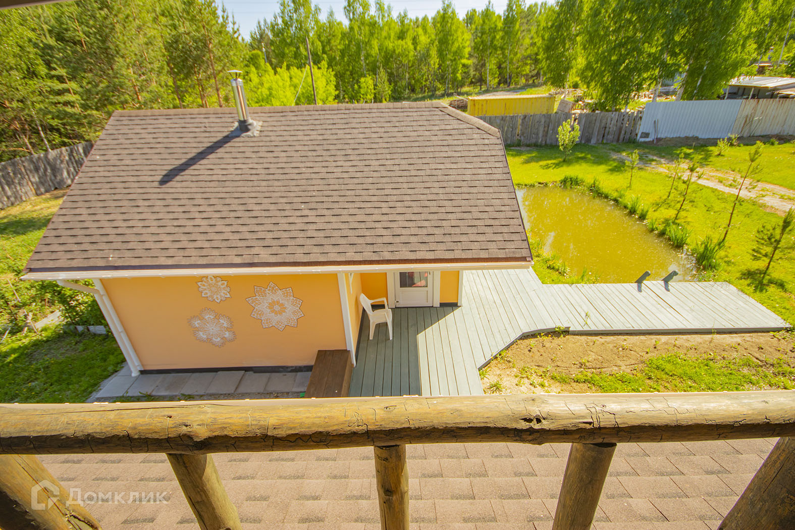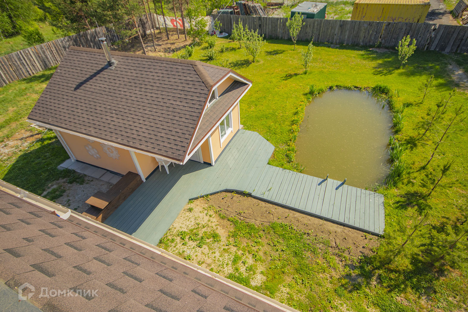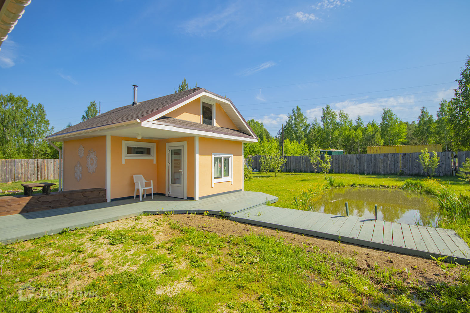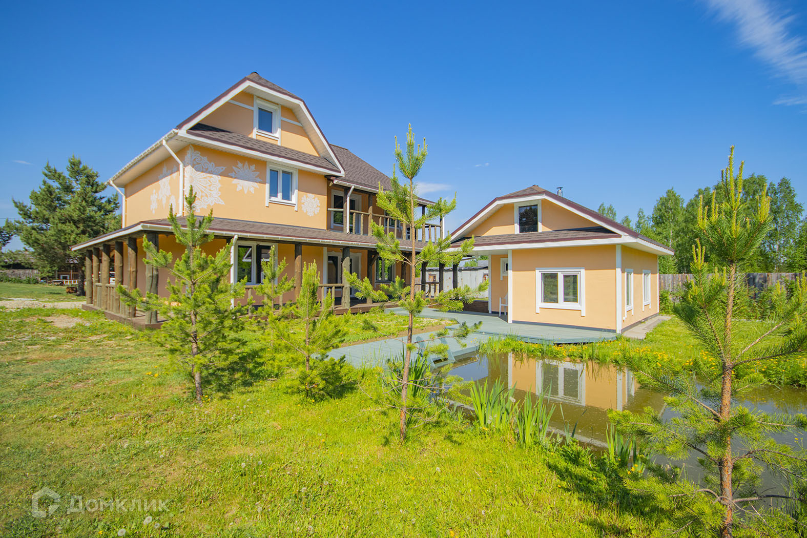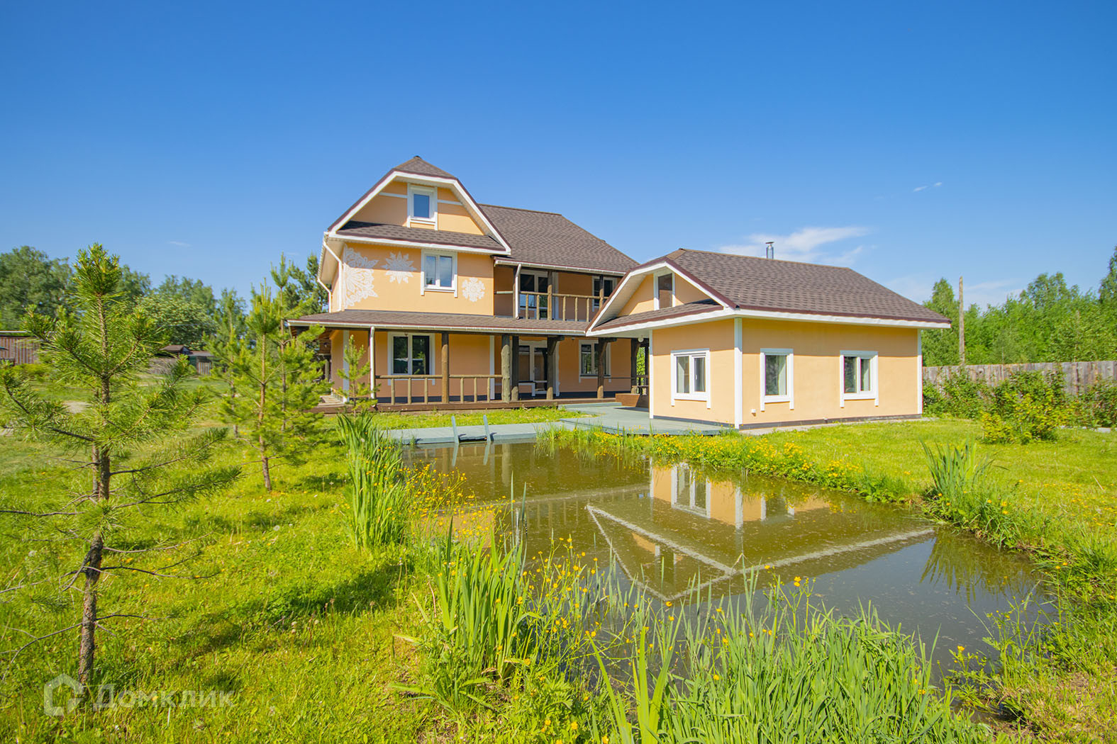 На участке в 20 соток есть водоем, елки, яблони, малина, смородина, зеленая лужайка.