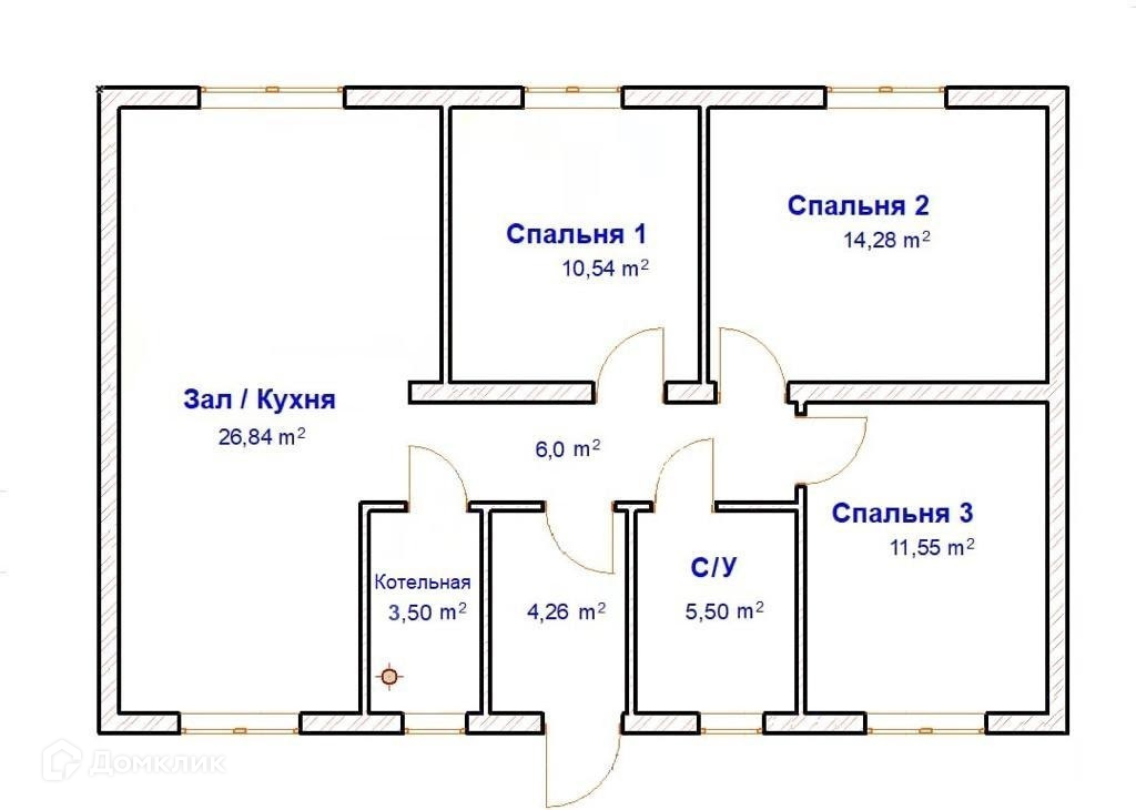 - 1й этаж: просторный холл, кухня-гостиная, 3 спальни, с/у, котельная.