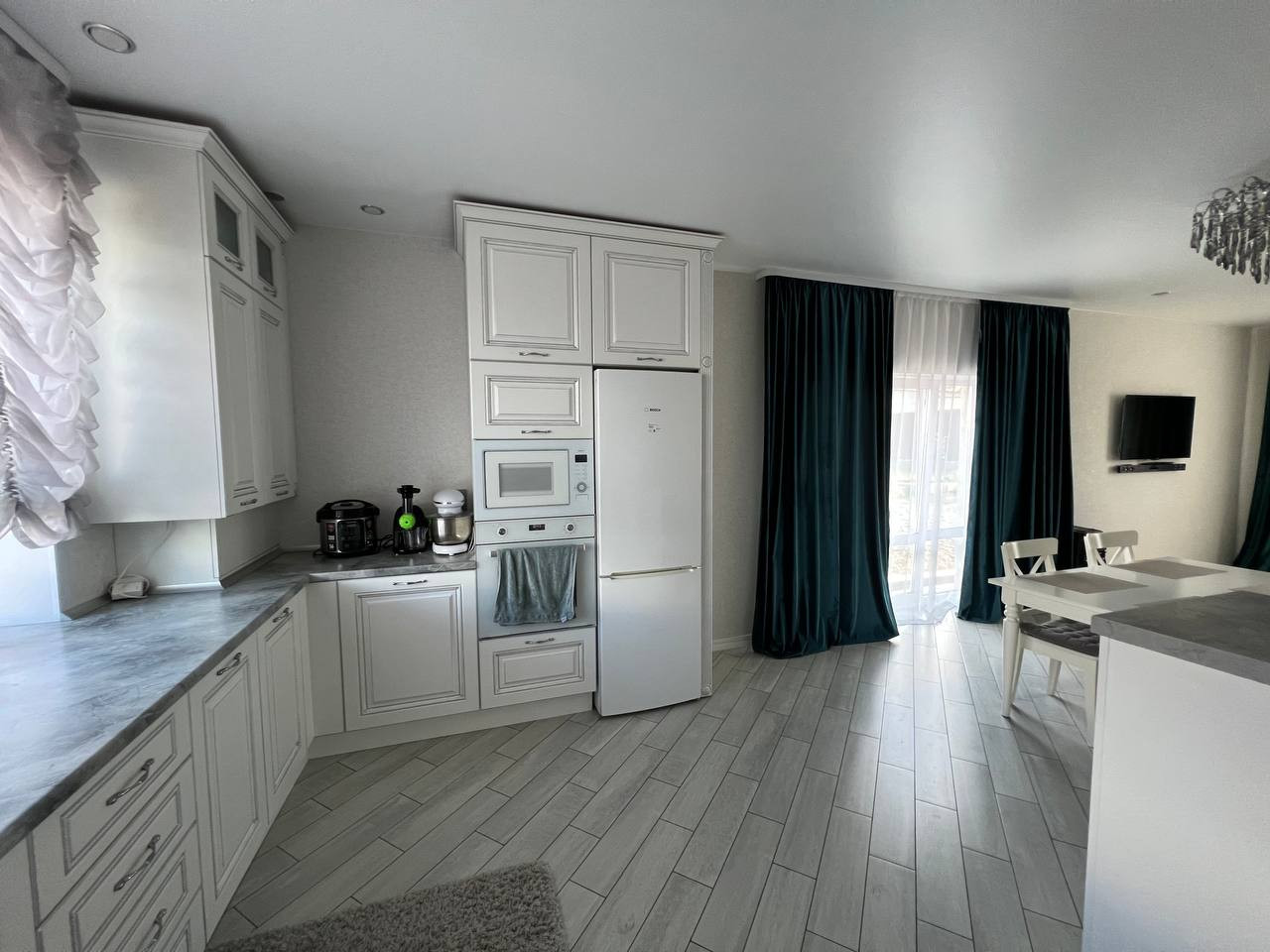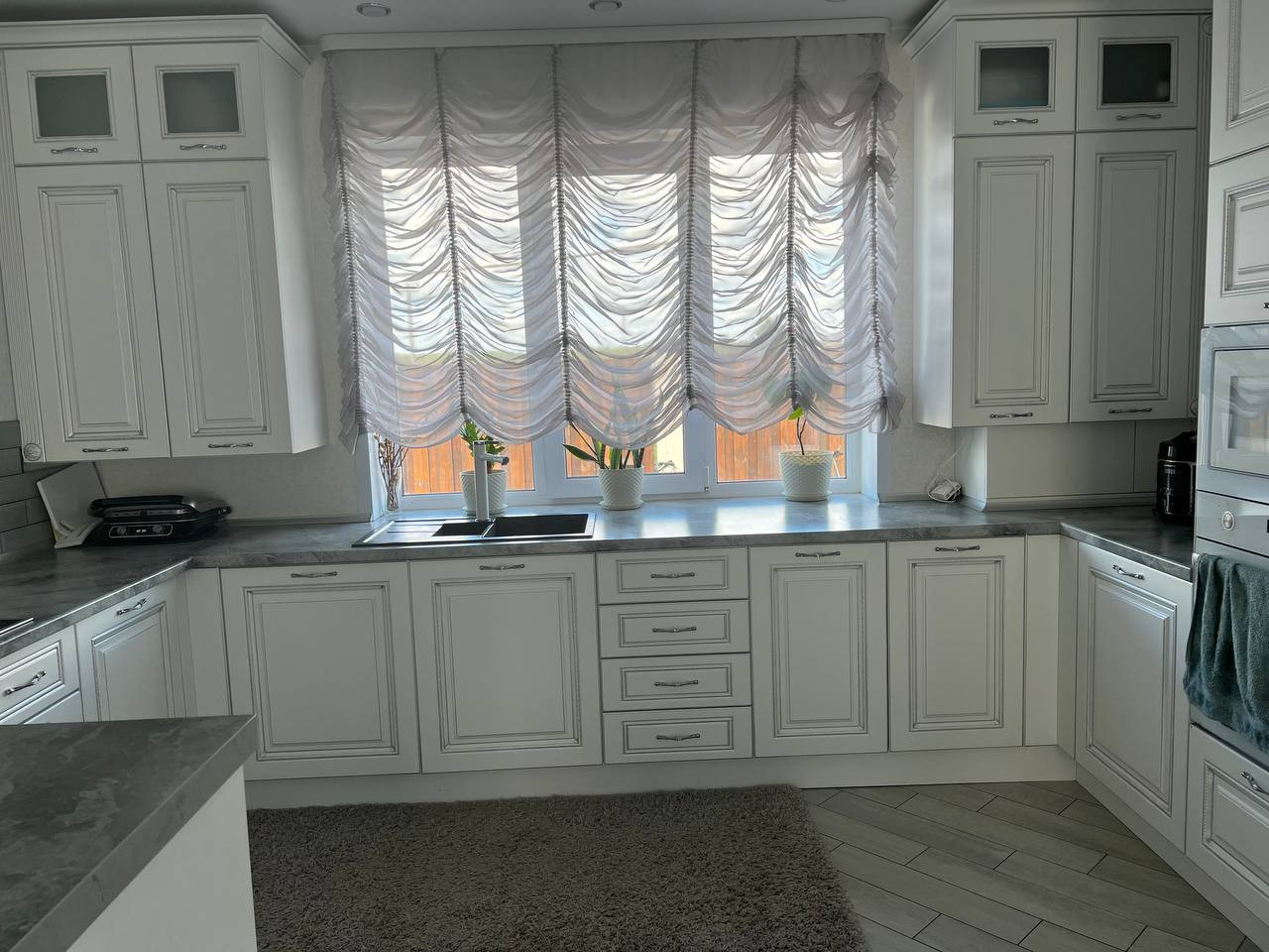 Большой кухонный гарнитур длиной 10 м, с барной стойкой в классическом стиле, и всей необходимой встроенной техникой (посудомоечная машина, варочная панель, духовой шкаф, СВЧ печь).