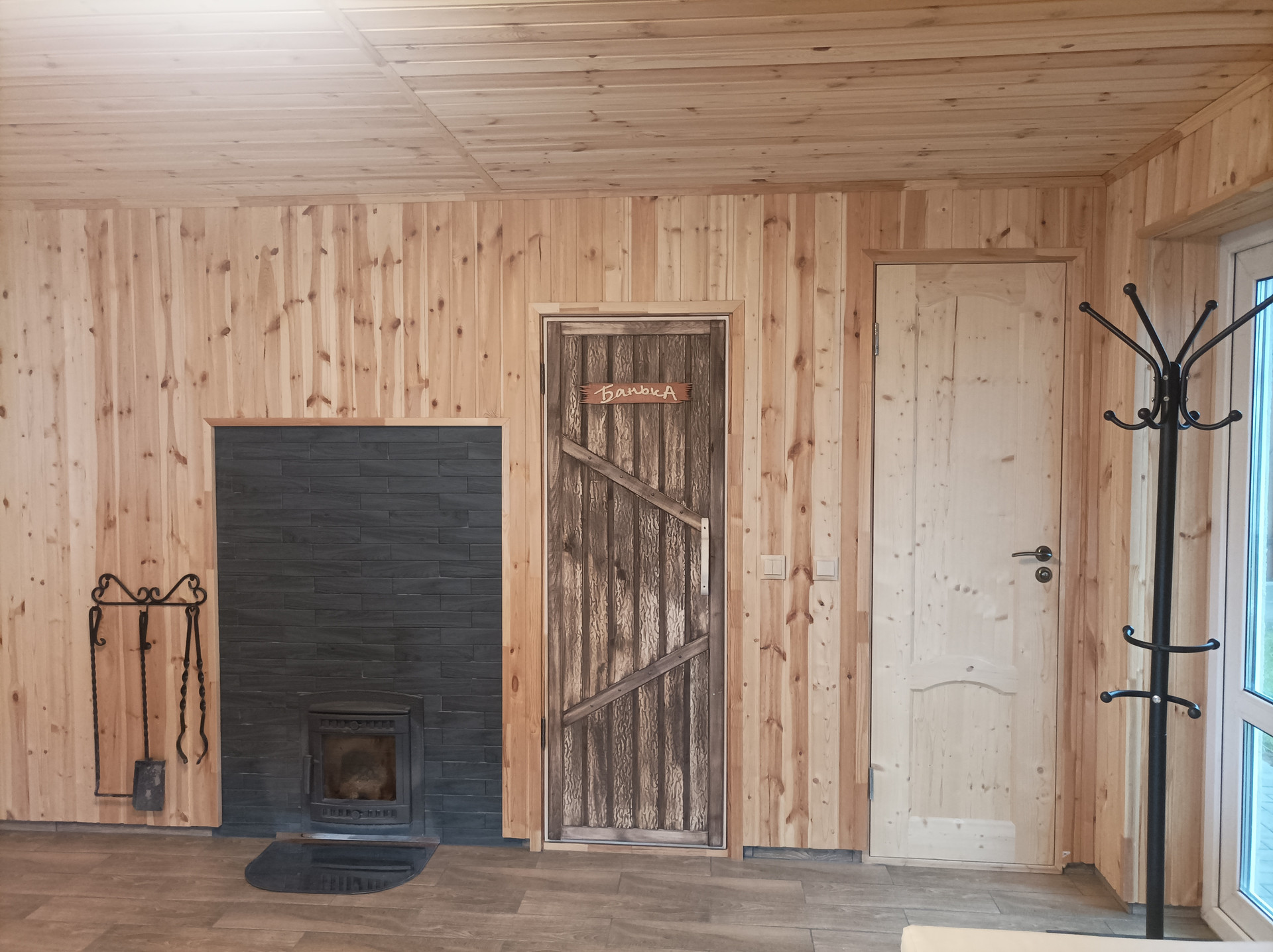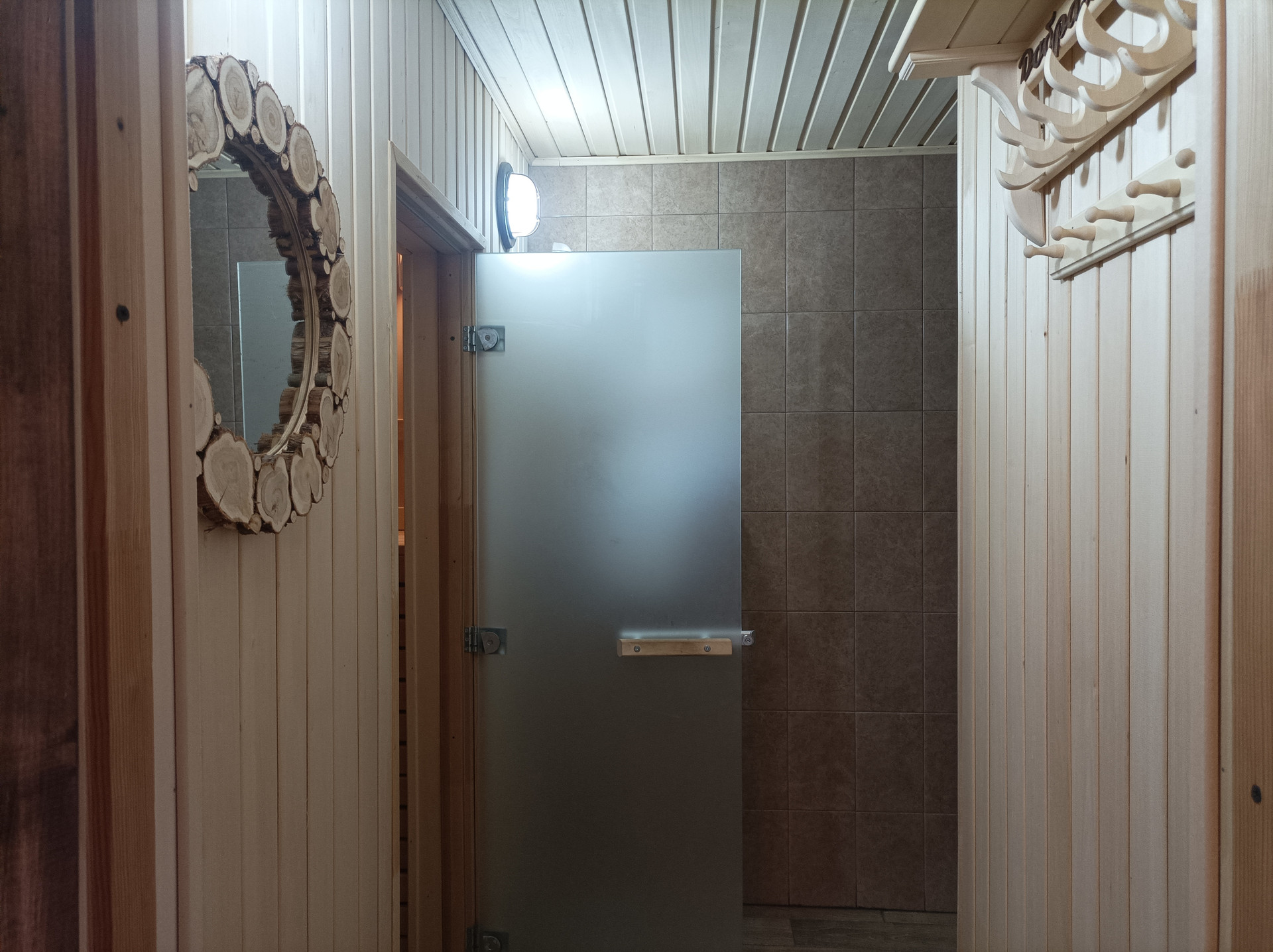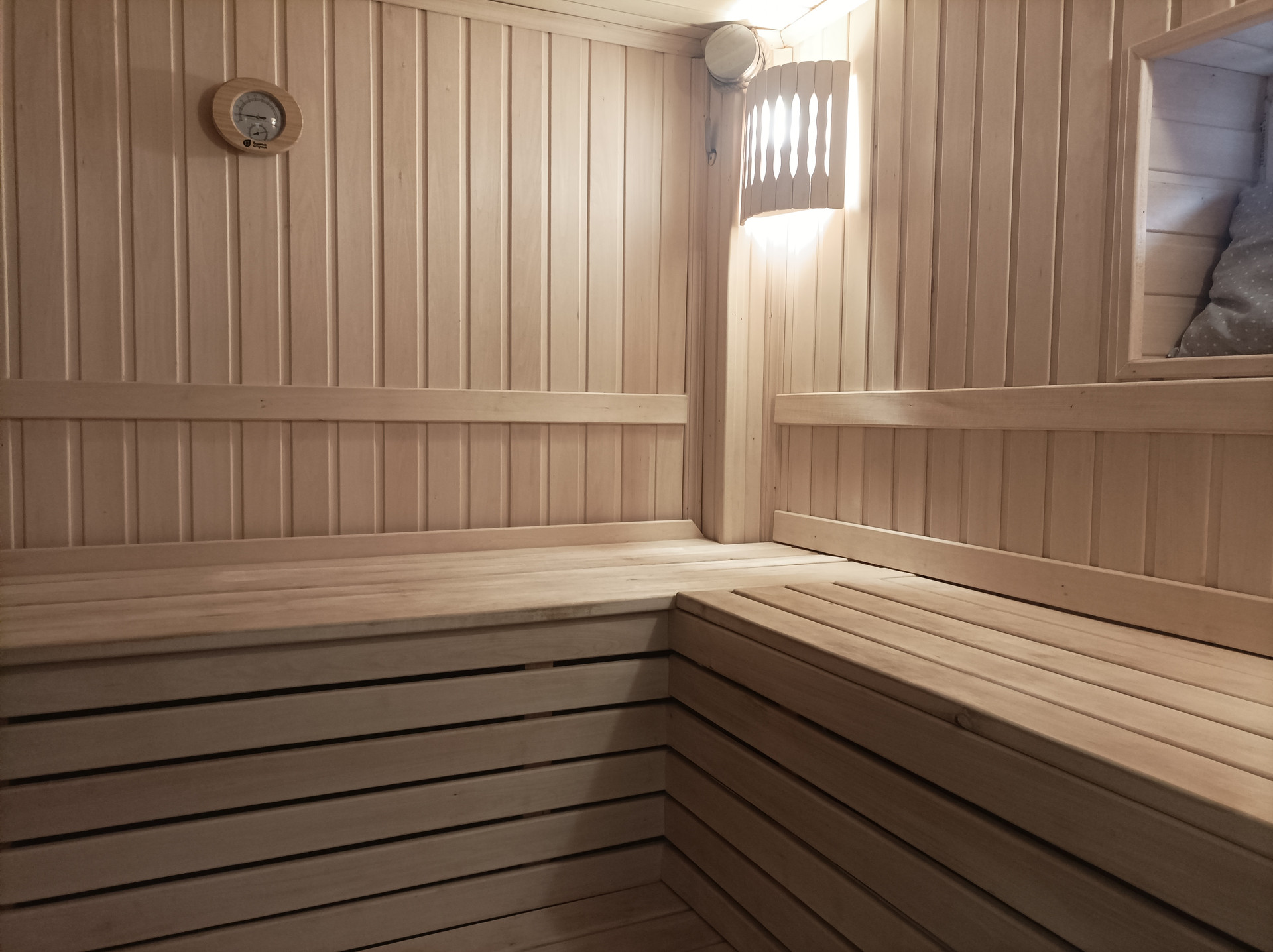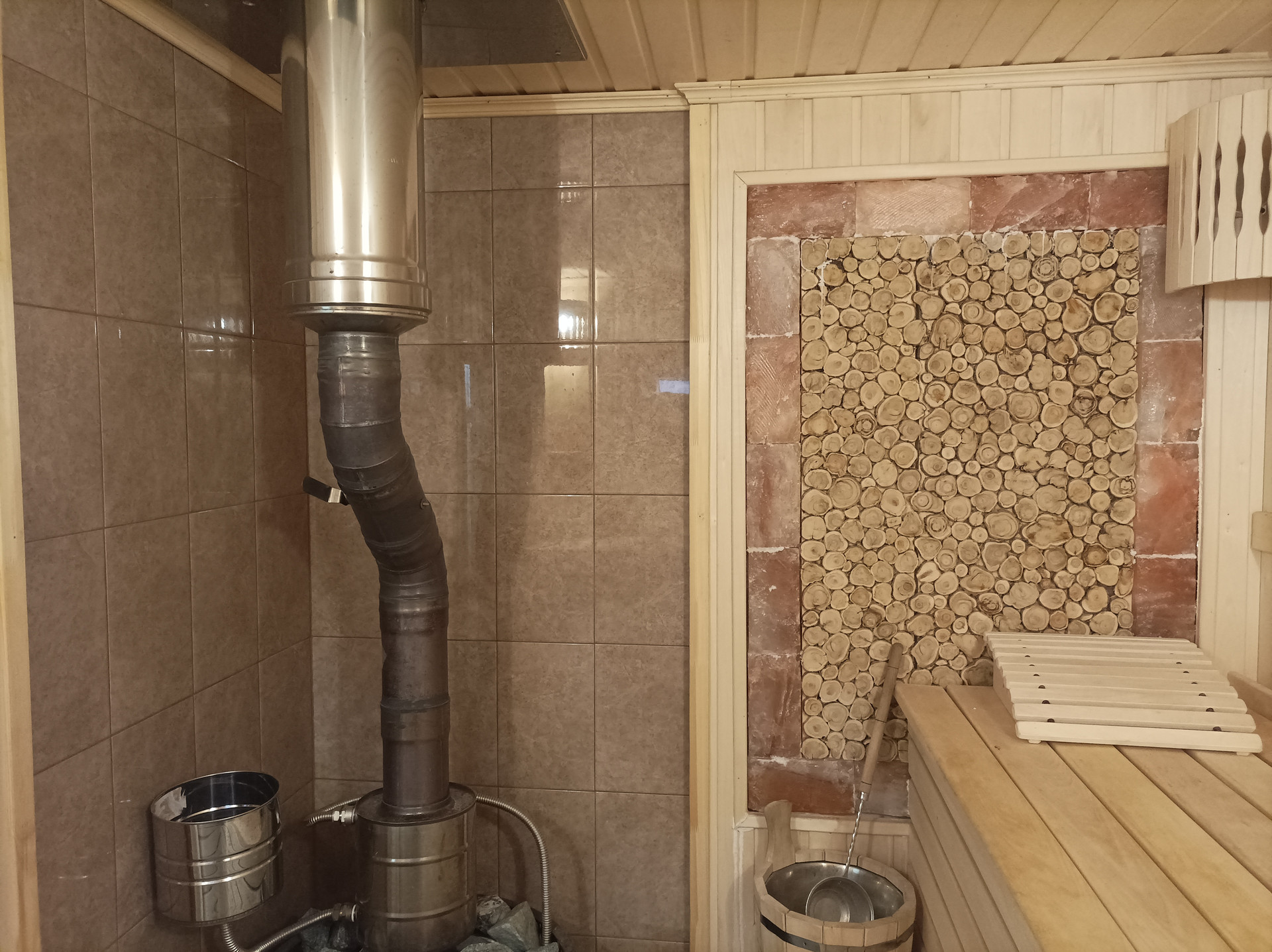 Парилка и мойка отделаны липой, установлены соляные блоки и панно из можжевельника. Печка чугунная, дорогая, на дровах.
