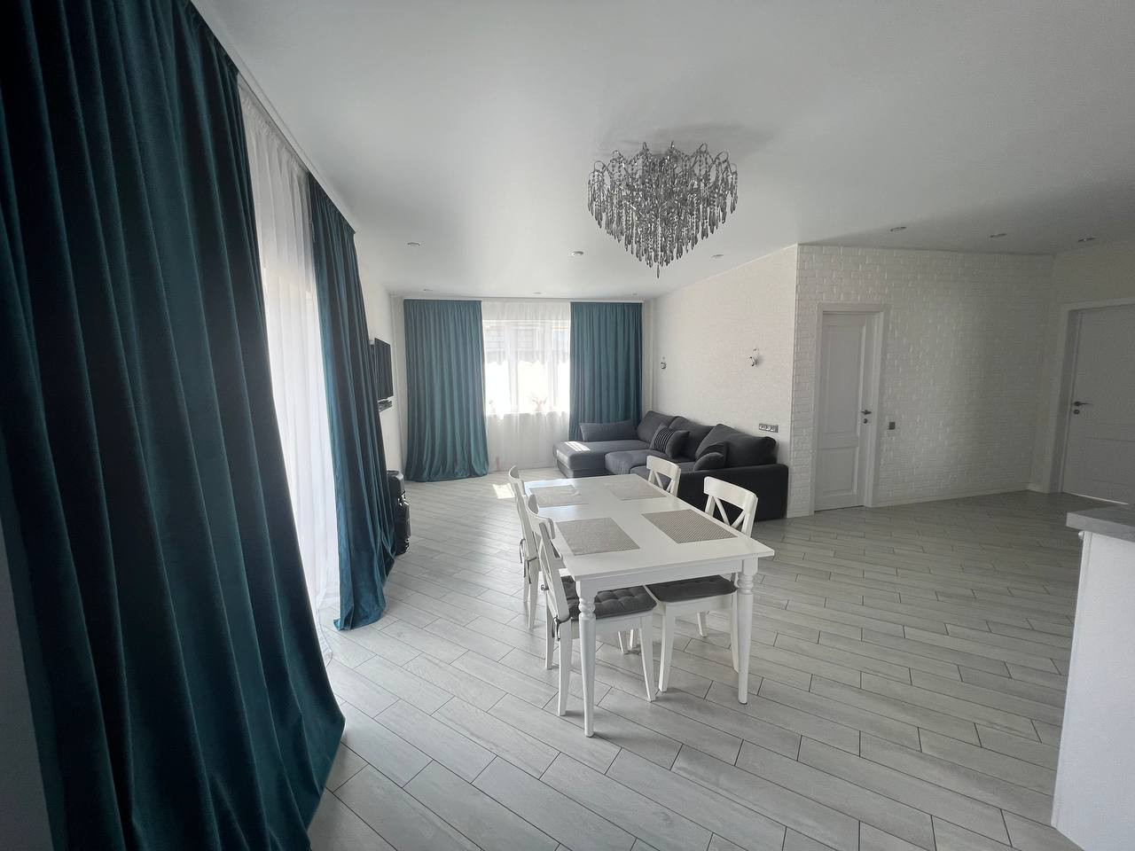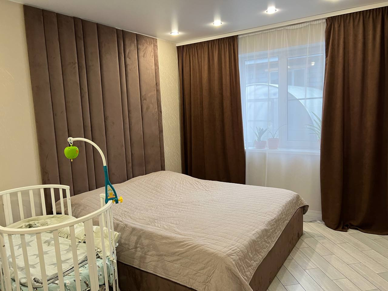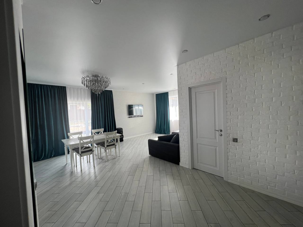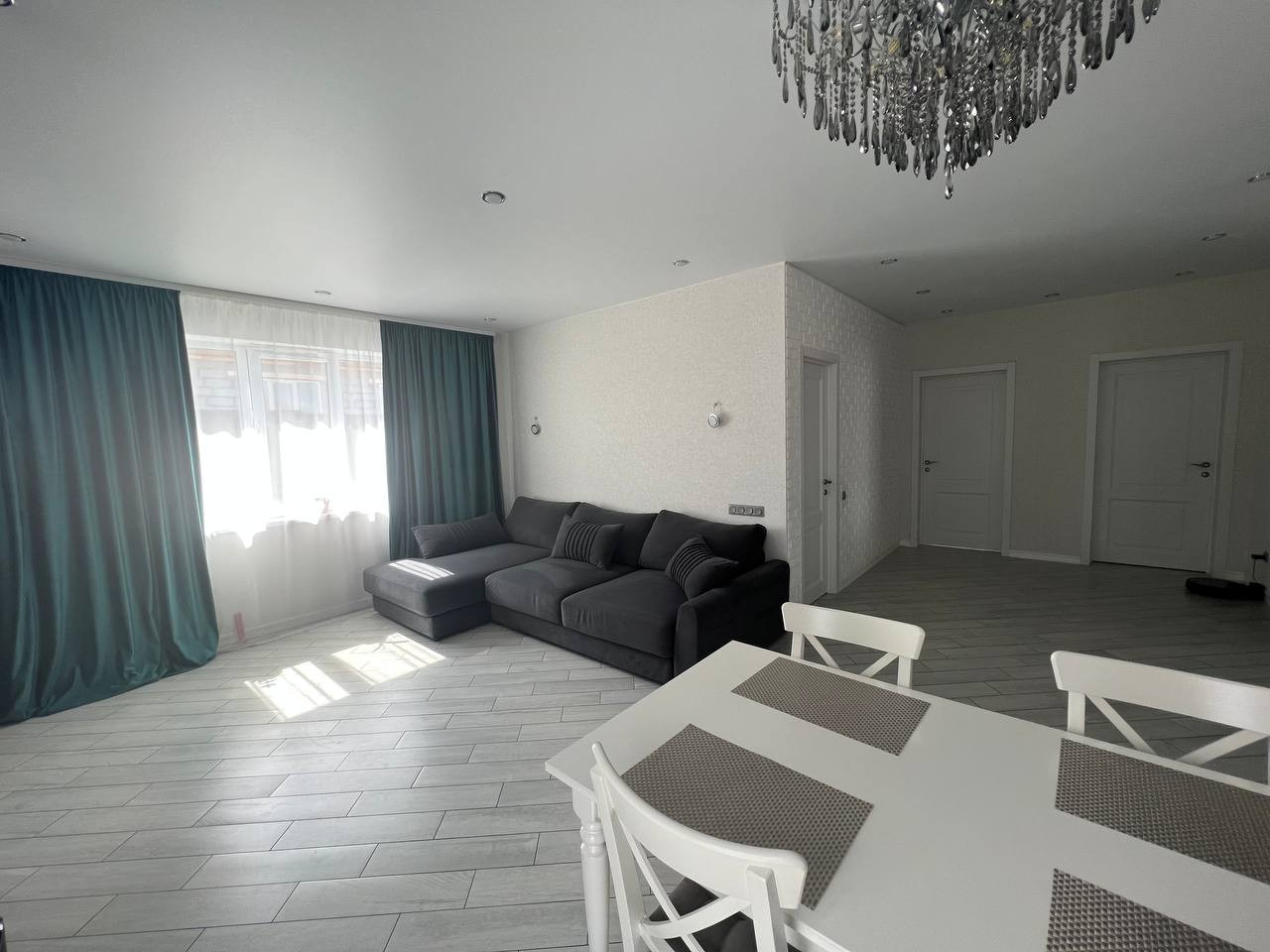 Планировка: прихожая 5 кв.м., кухня-гостиная 38 кв.м., санузел 9 кв.м., 2 спальни по 18 кв.м. Высота потолков 2,7 м.