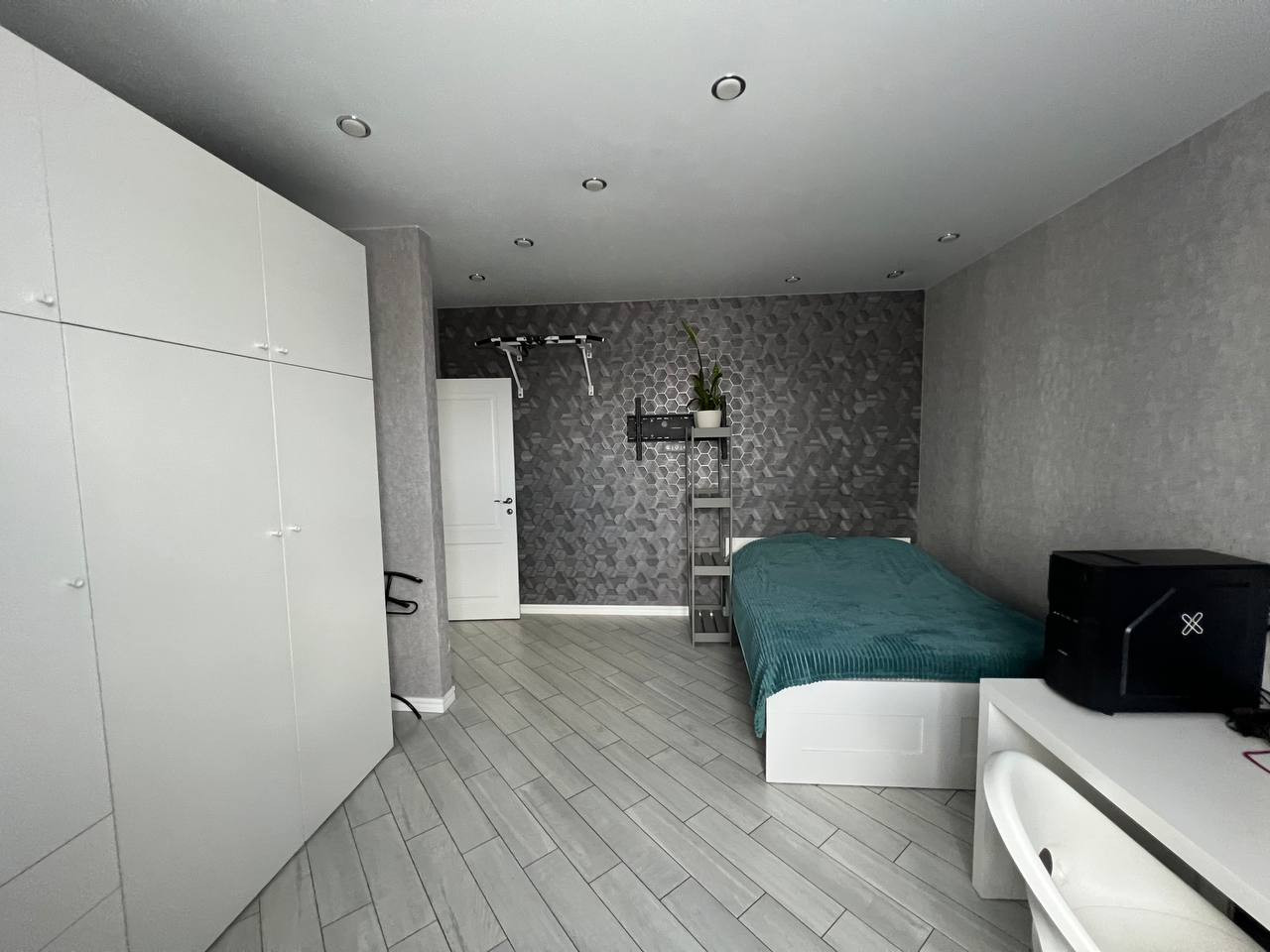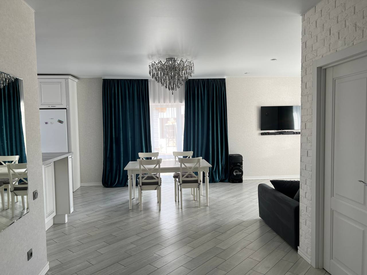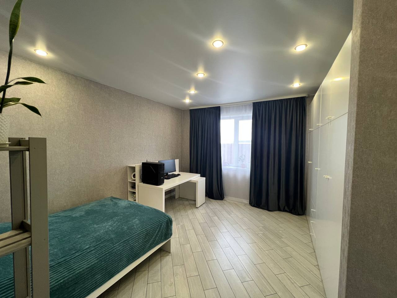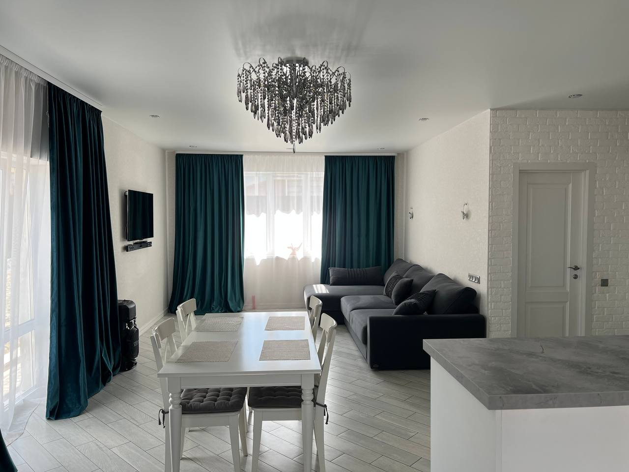 Планировка: прихожая 5 кв.м., кухня-гостиная 38 кв.м., санузел 9 кв.м., 2 спальни по 18 кв.м. Высота потолков 2,7 м.