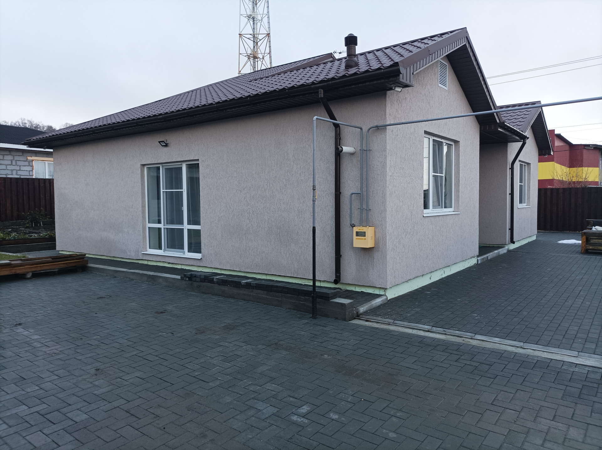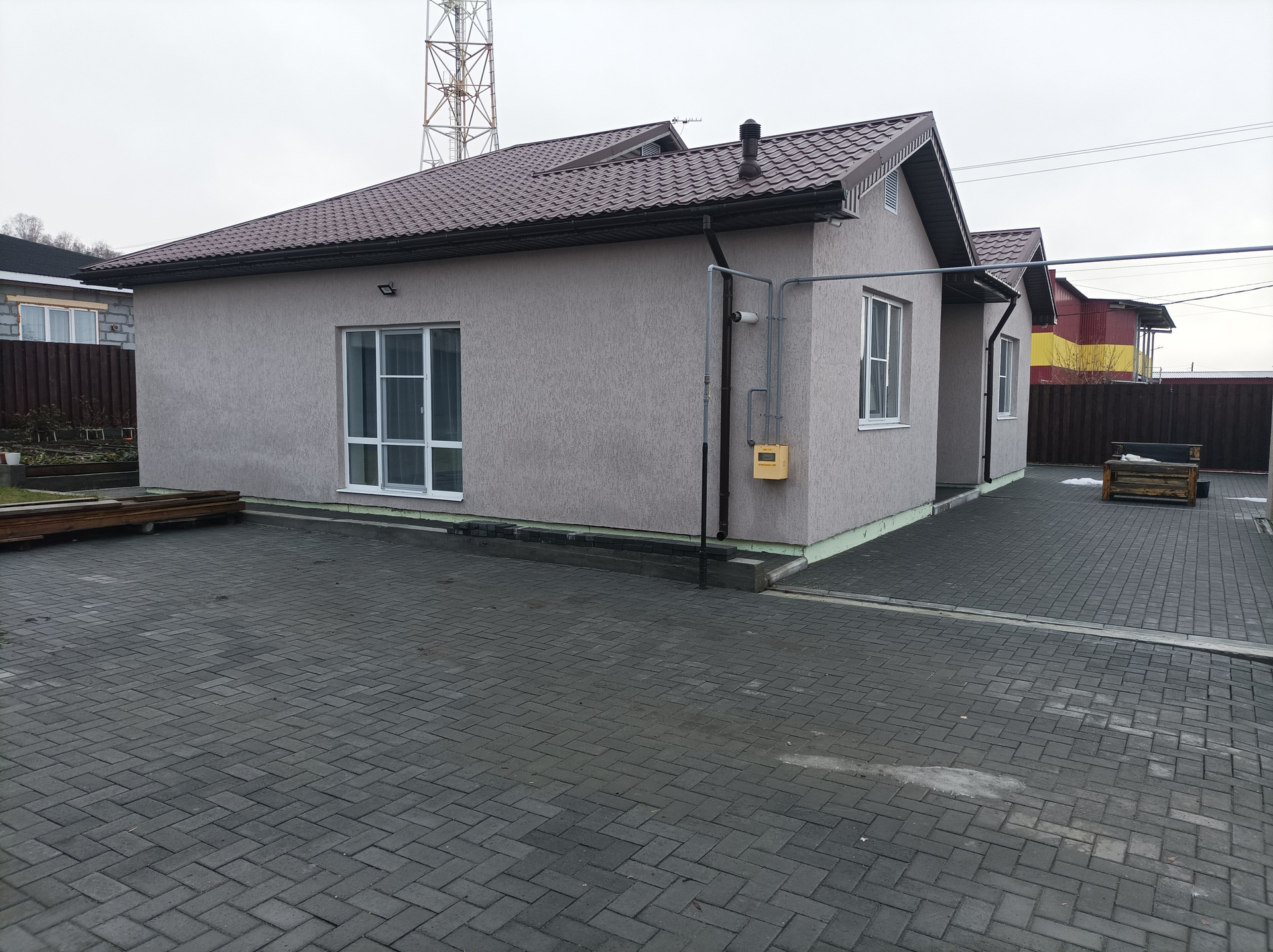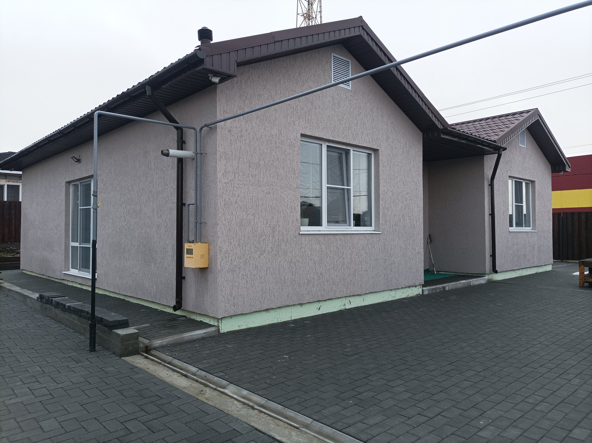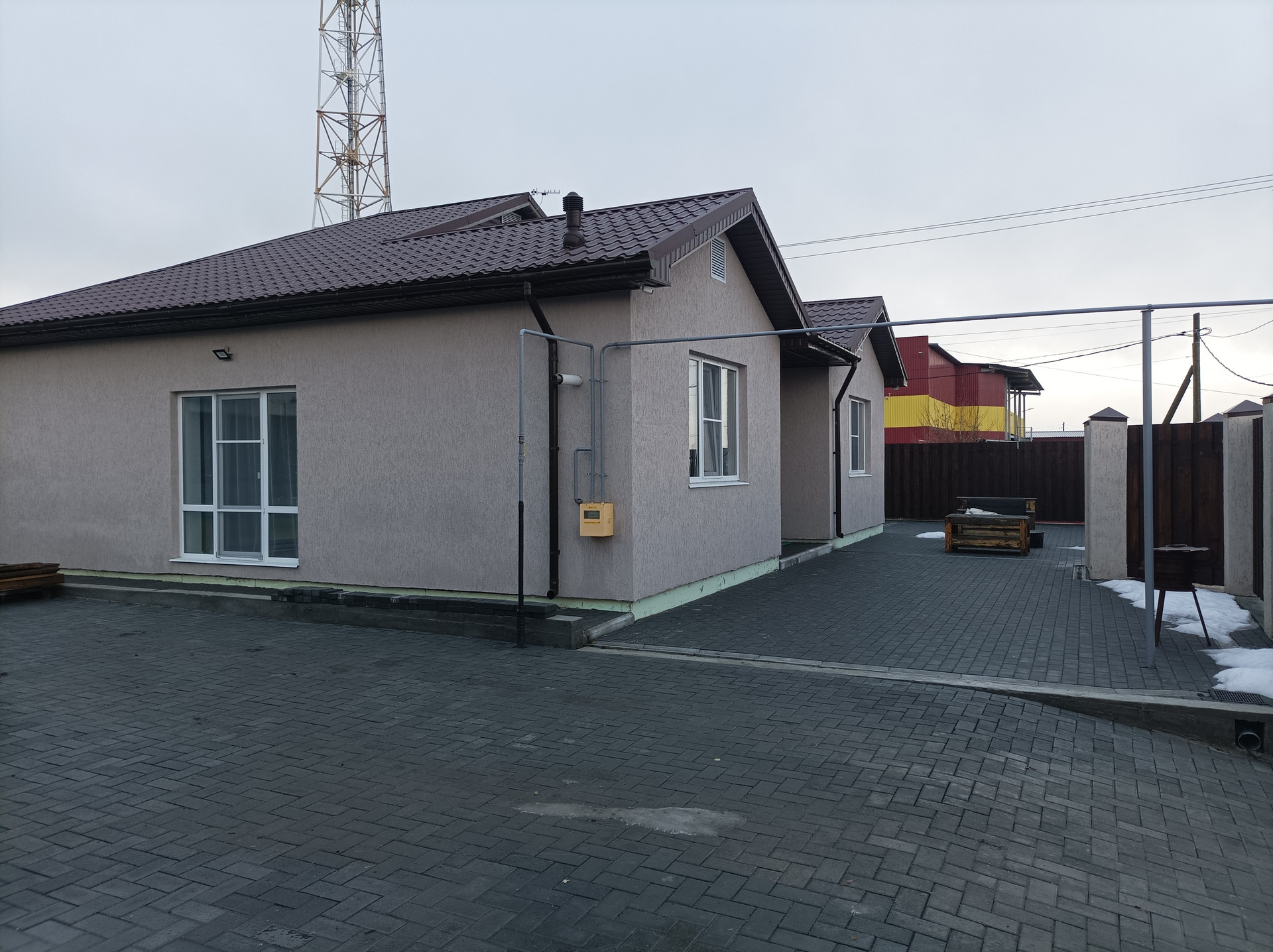 Все фасады, кровля и заборы сделаны в едином стиле из декоративной штукатурки и металлочерепицы.