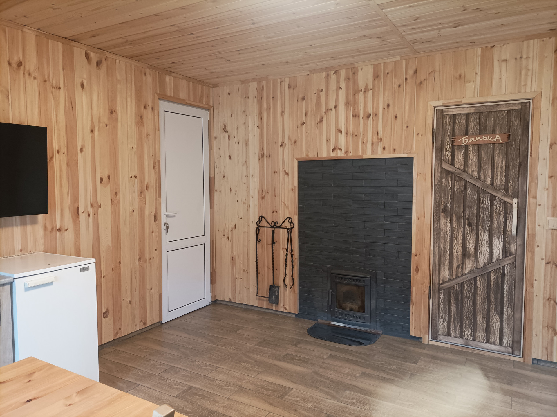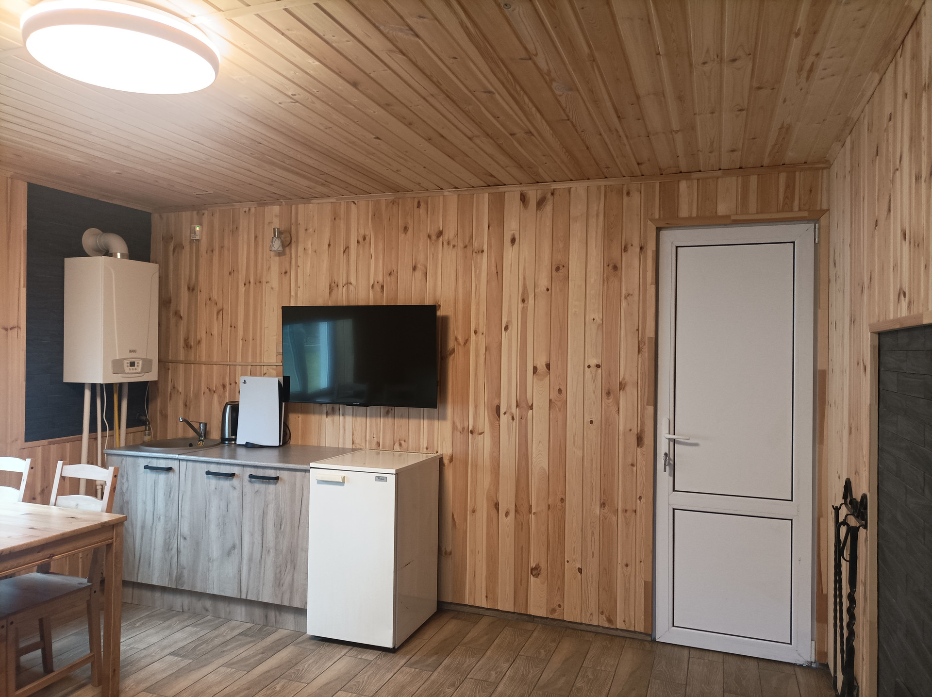Комната отдыха в бане – полноценный жилой объект со своим газовым отоплением, небольшим кухонным гарнитуром, холодной и горячей водой, санузлом и душем. Пол керамогранит, стены и потолок сосна.