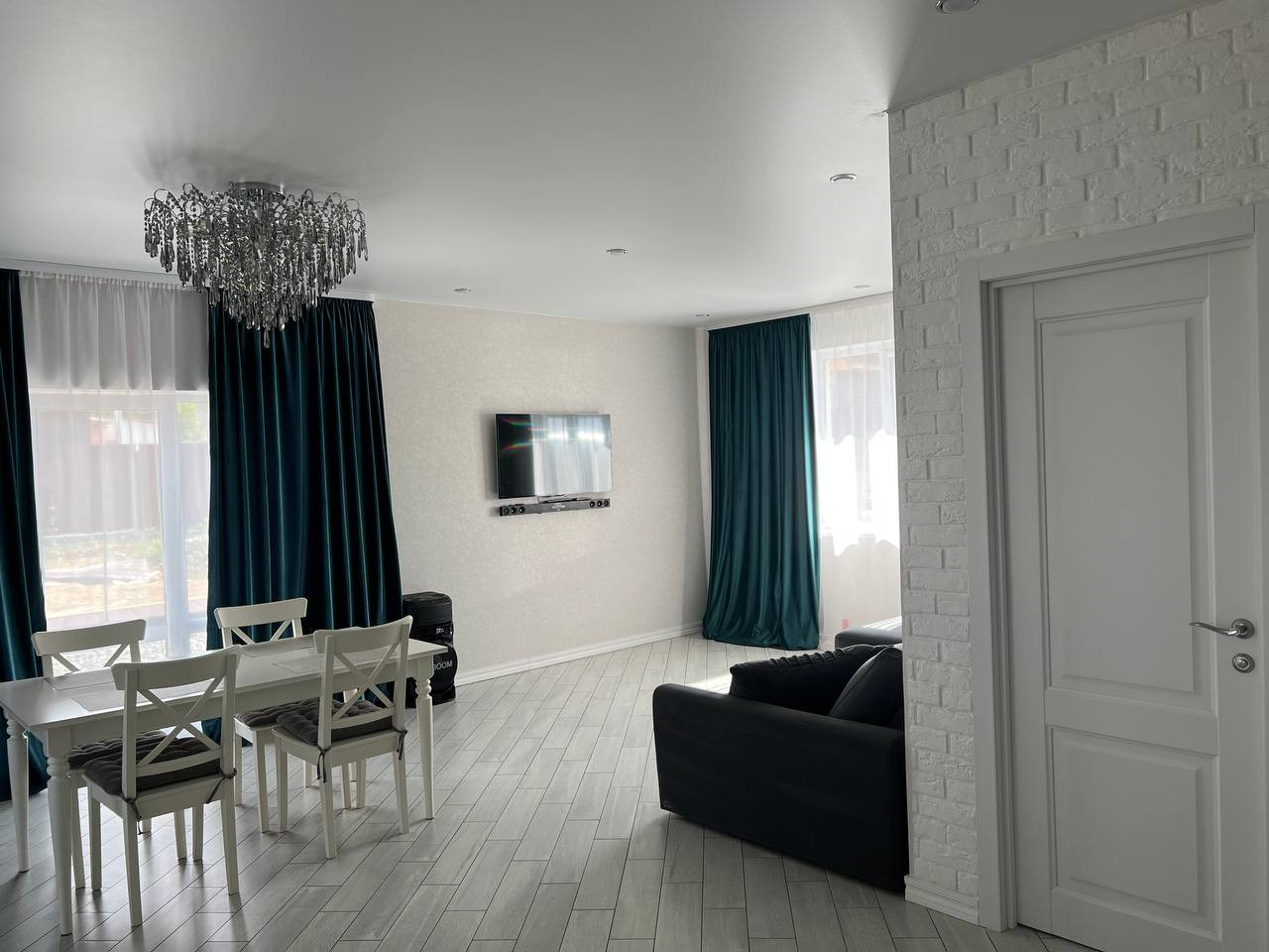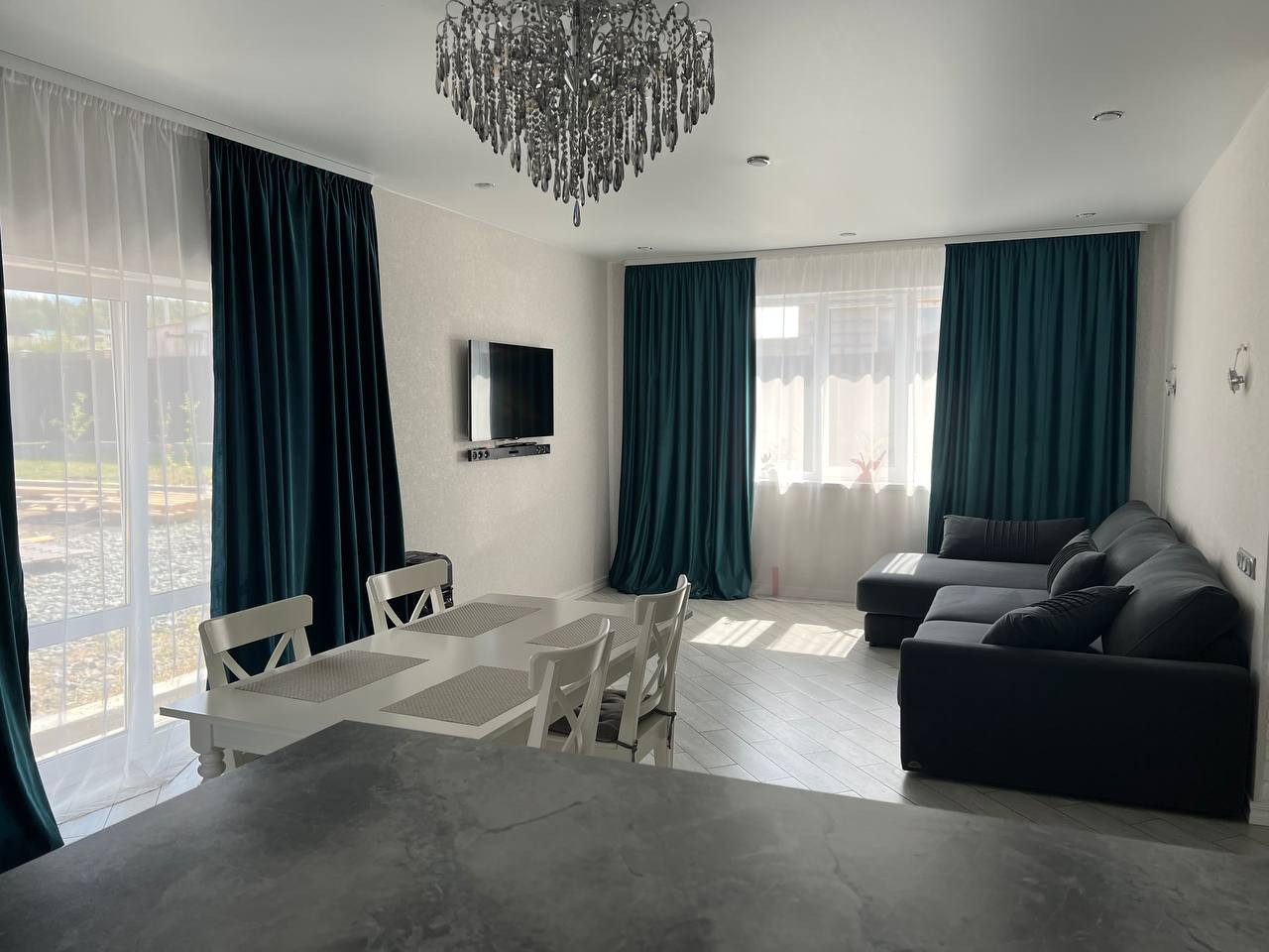 Большая светлая гостиная, с окнами на три стороны, в том числе с остеклением в пол и выходом на участок.