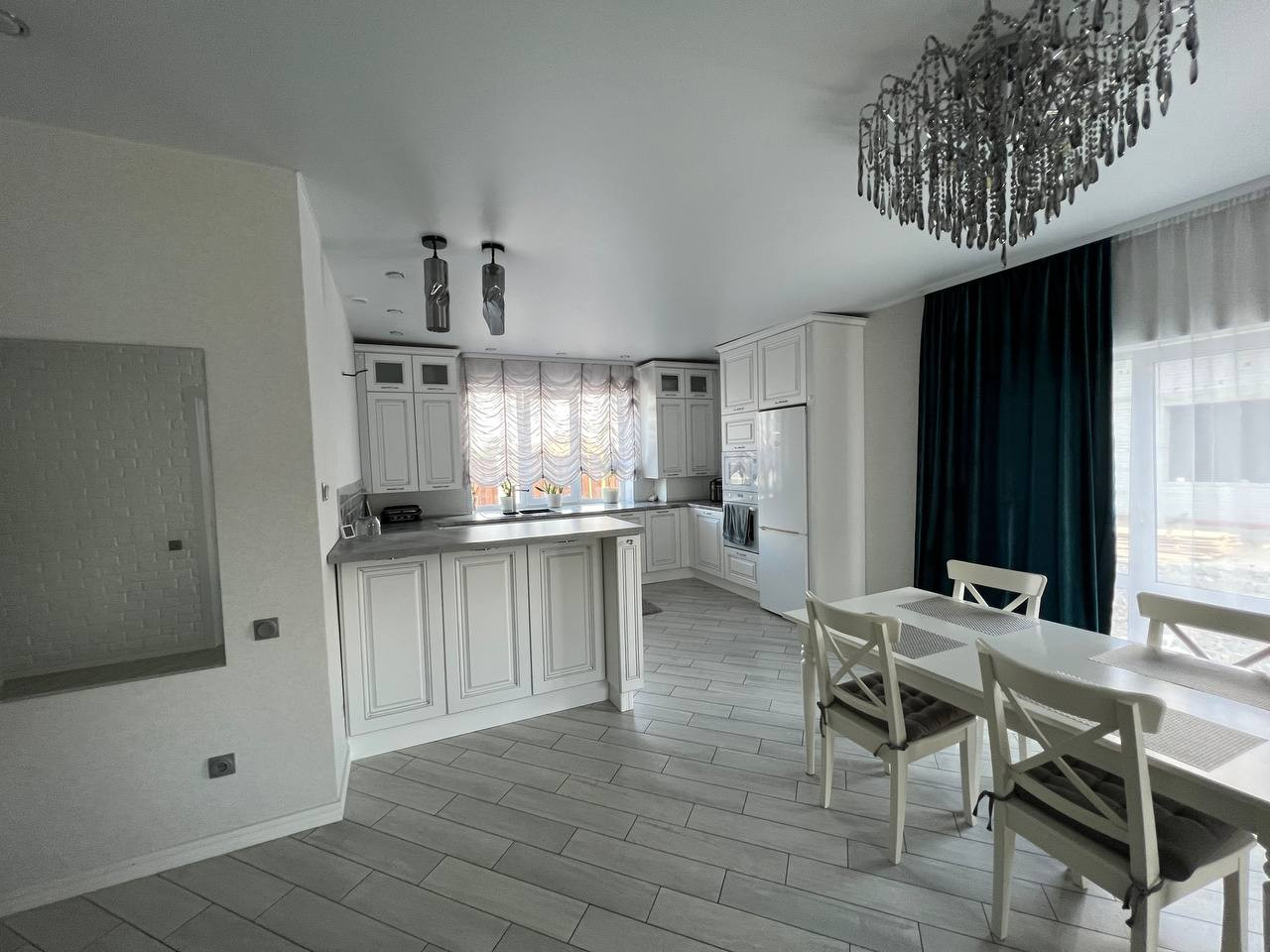 Напольное покрытие во всём доме керамогранит с тёплыми полами, потолки везде натяжные, на стенах обои, в санузле плитка.