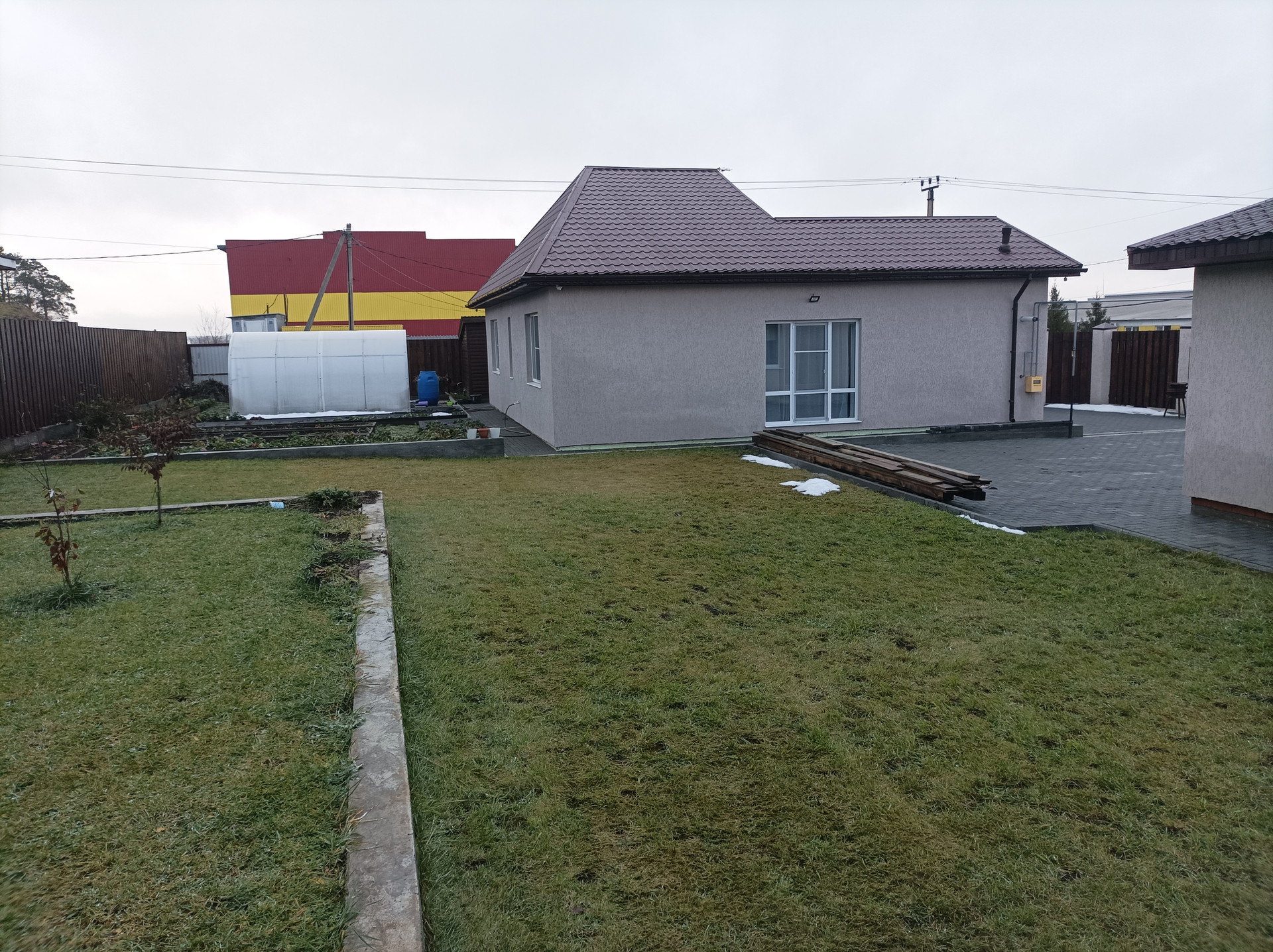 Участок ровный, прямоугольный, полностью обустроен: частично выложен бетонной плиткой 80 мм, частично засеян газонной травой, частично занят огородом и теплицами, с системами полива и отвода дождевой воды. Плодородную землю завозили в 2022 г., растут виктория, крыжовник, смородина, малина, облепиха, голубика, земляника, вишня, яблони, сливы.