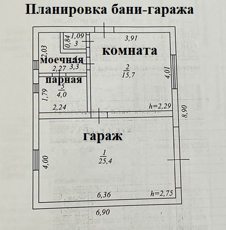 Планировка: гараж 25 кв.м. с окном и полками для хранения, комната отдыха 16 кв.м. с двумя выходами – на участок и в гараж, санузел, моечная с душем, парилка.