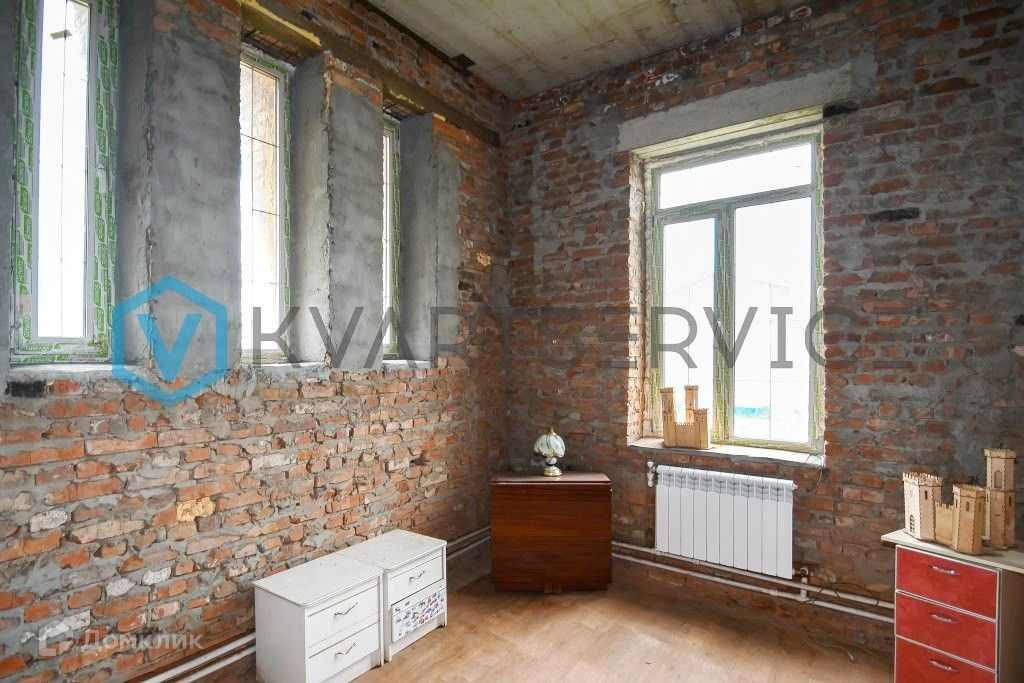 Материал стен - кирпич. По периметру дом утеплен пеной, что представляет возможность будущему владельцу выбрать дизайн фасада самостоятельно.