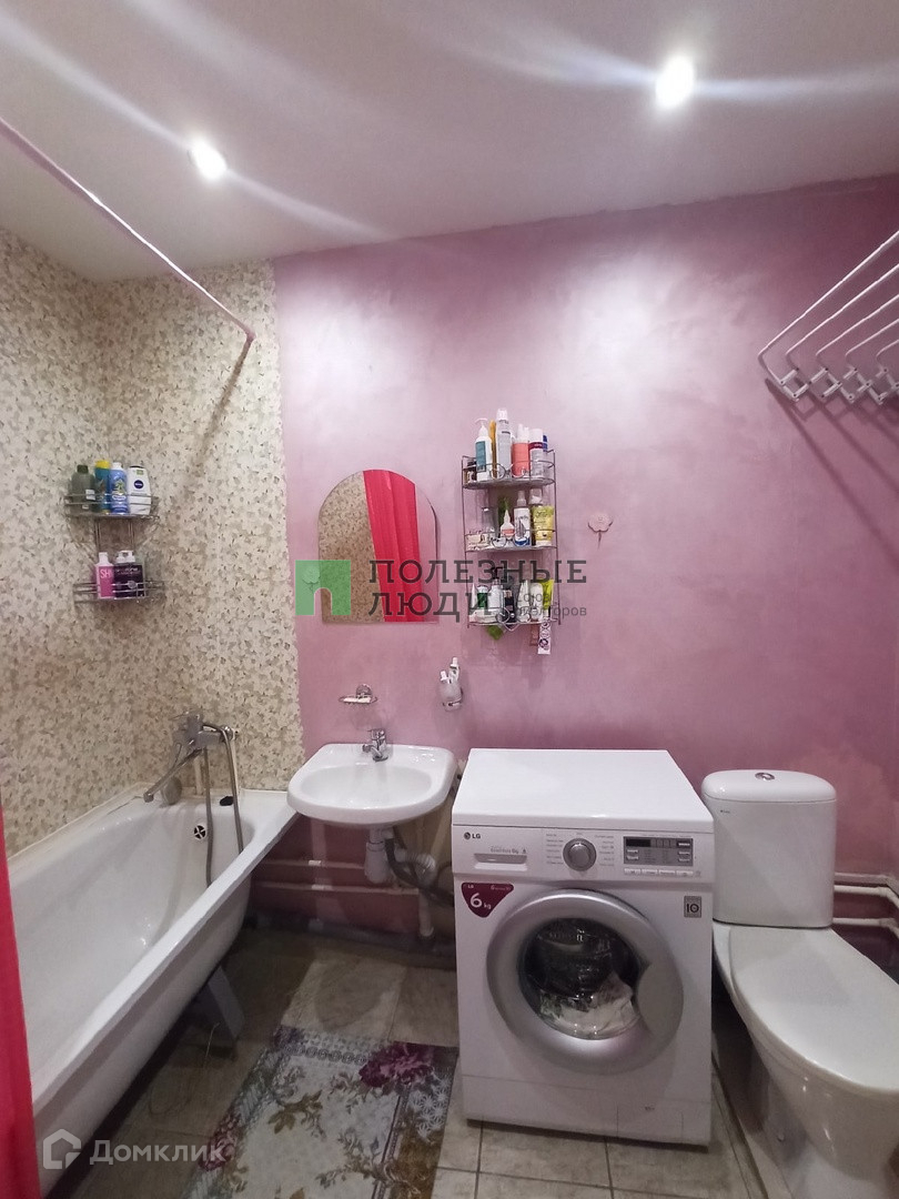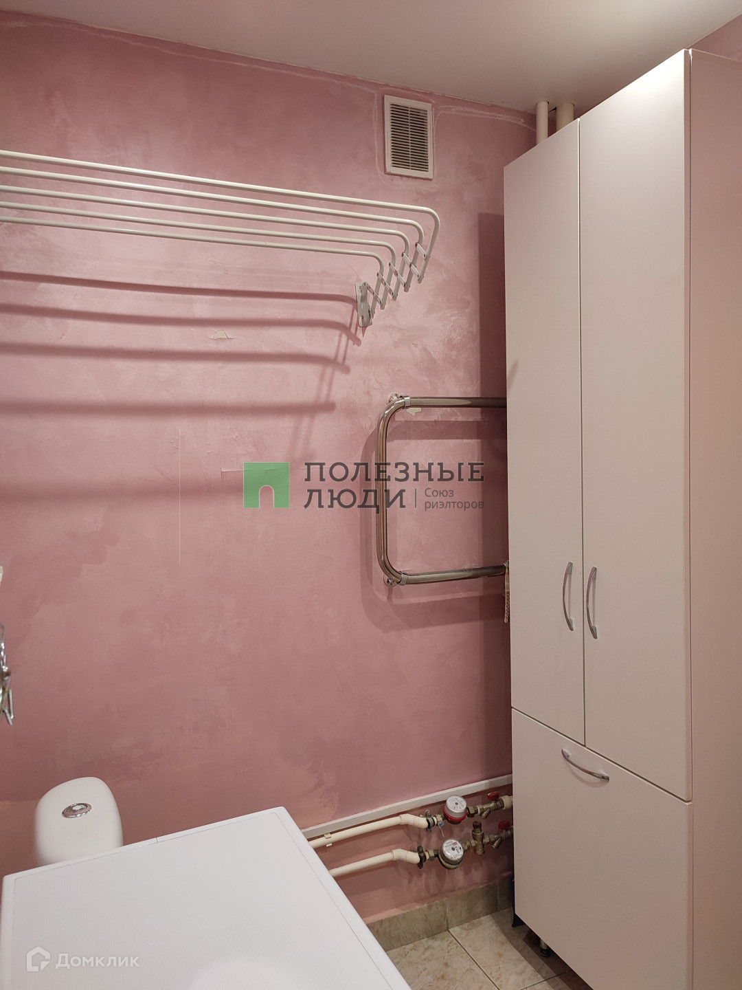 Совмещенный санузел, в котором есть шкаф и место для установки стиральной машины.