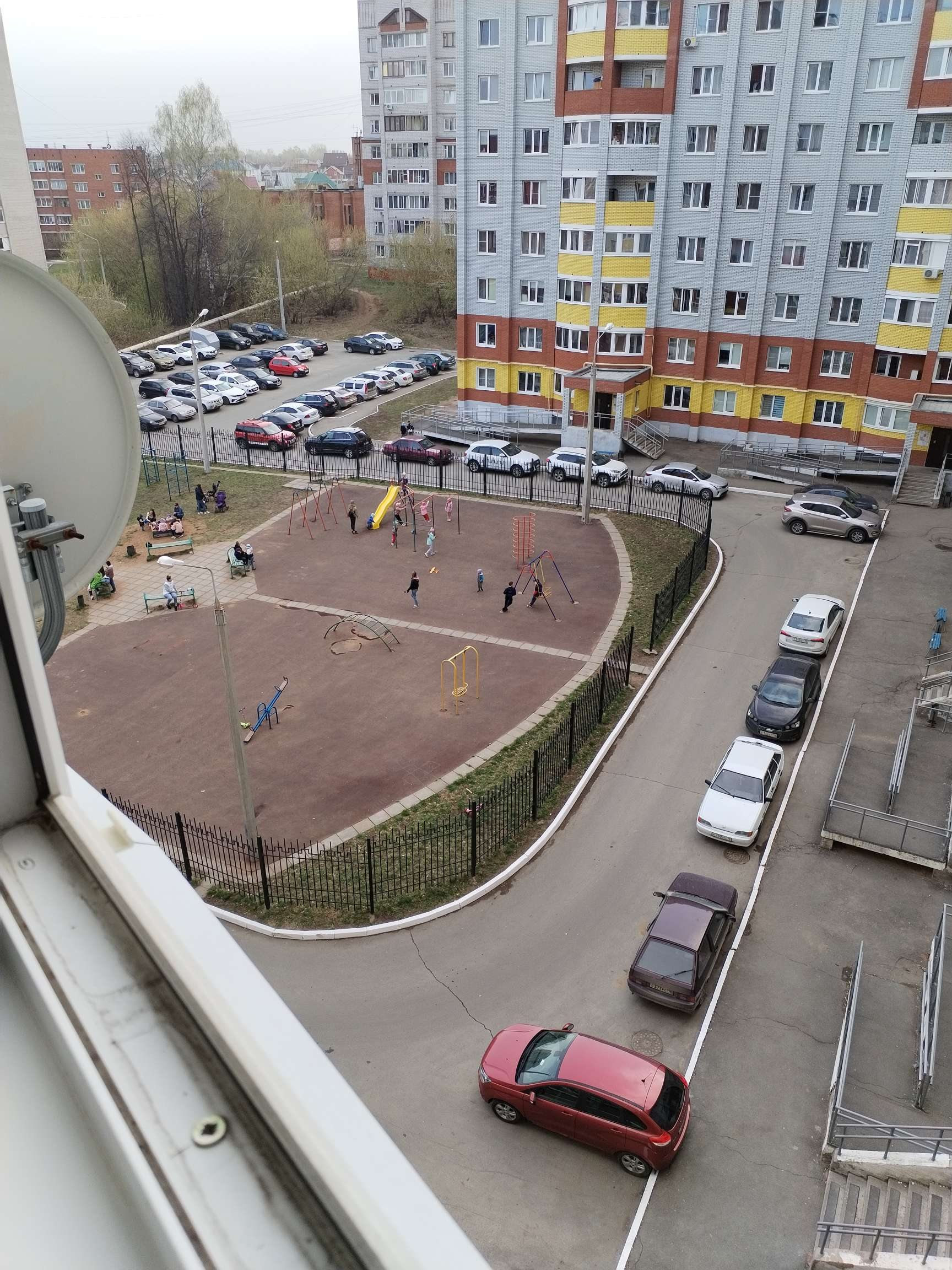 Окна выходят во двор на огороженную большую детскую площадку и на парковку. Шума от дороги не слышно.