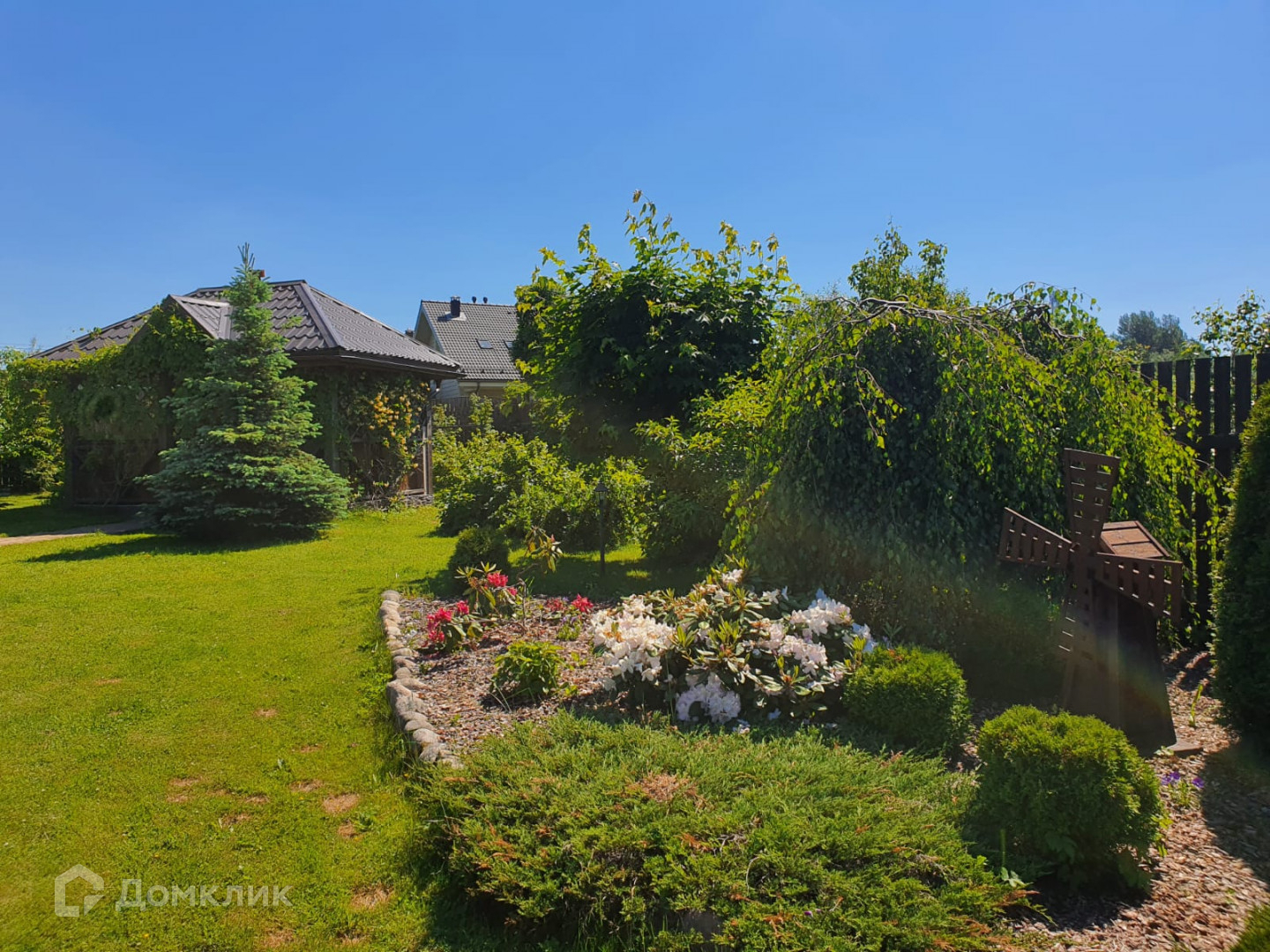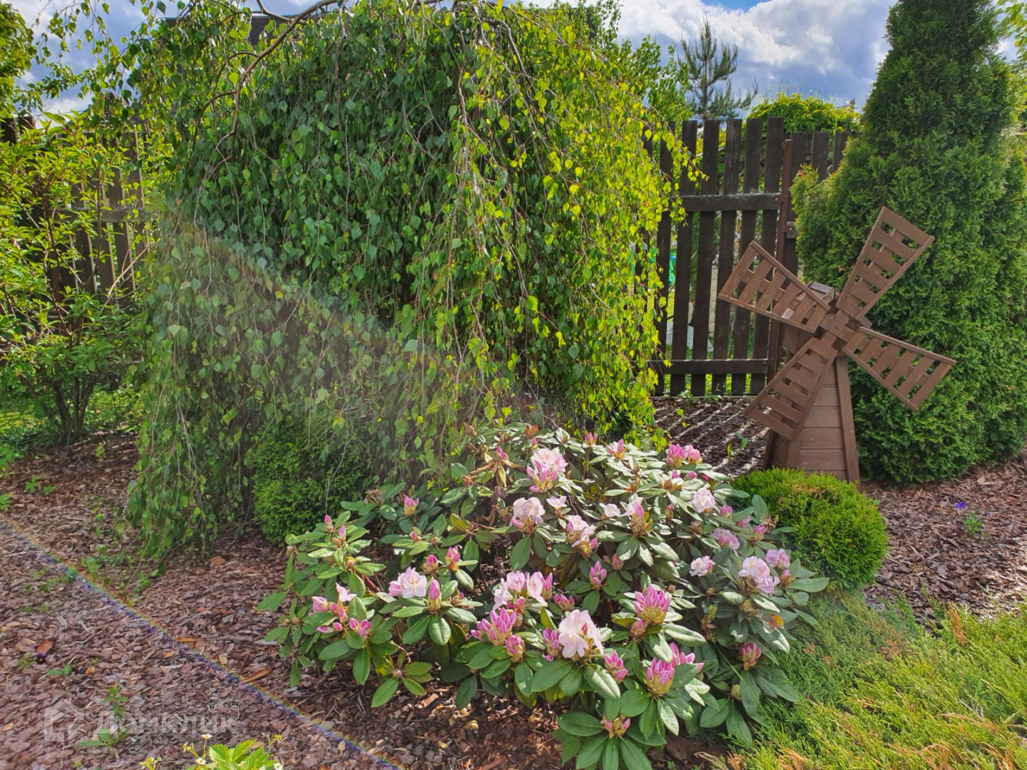 · Выполнено мощение плиткой, использованы природные минеральные камни ,освещение и дорожки из натурального камня. Цветущий плодоносящий сад (вишня, груша, слива, яблони)