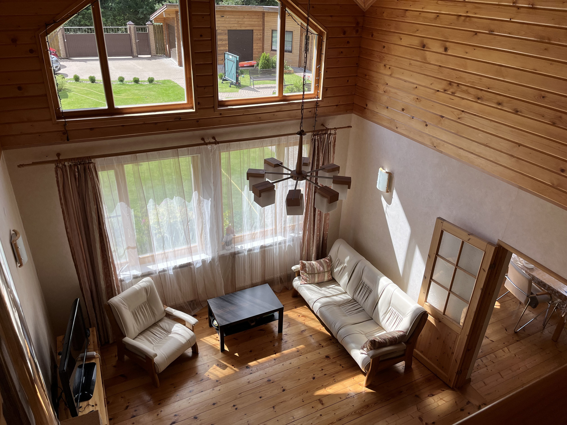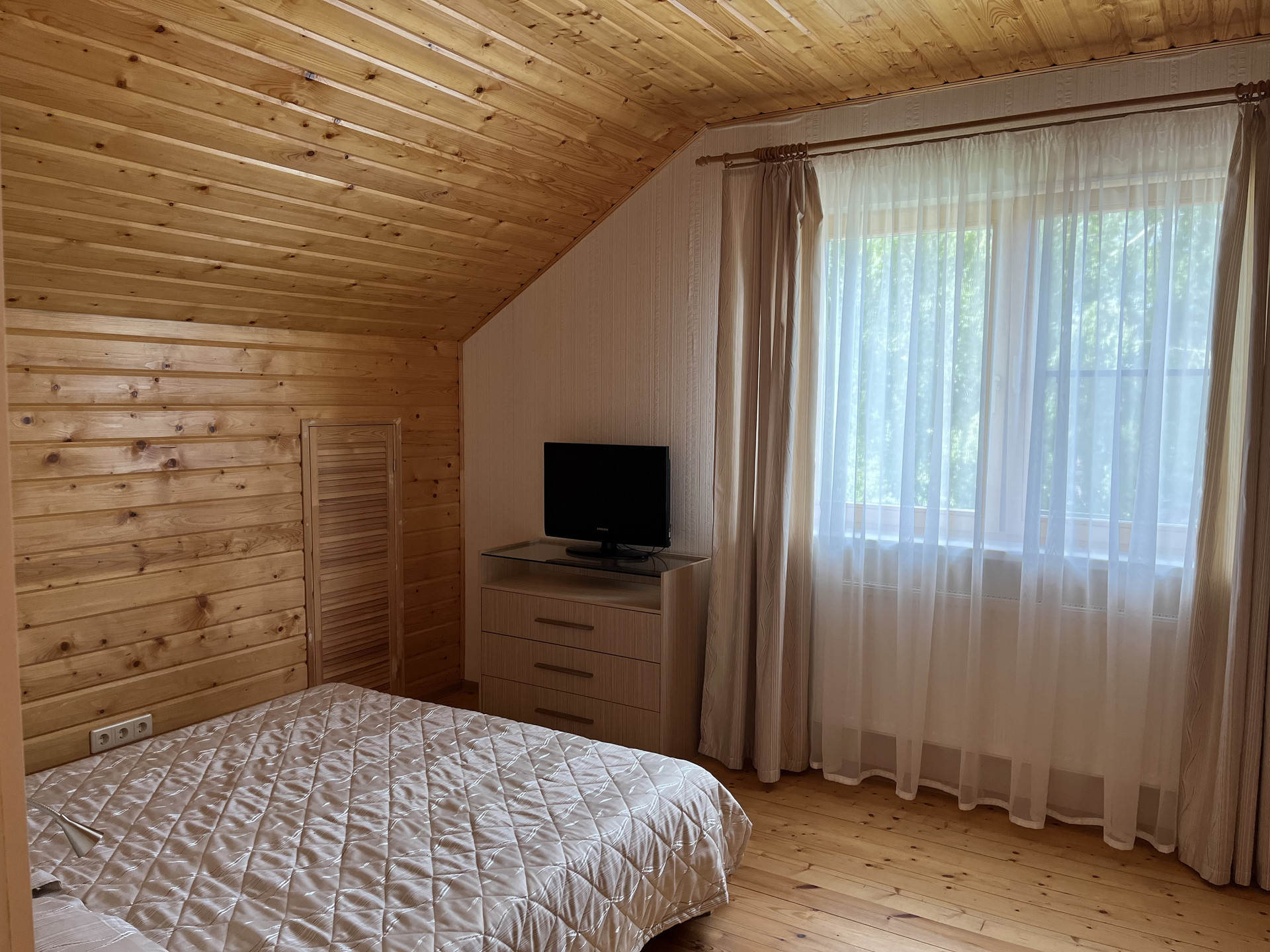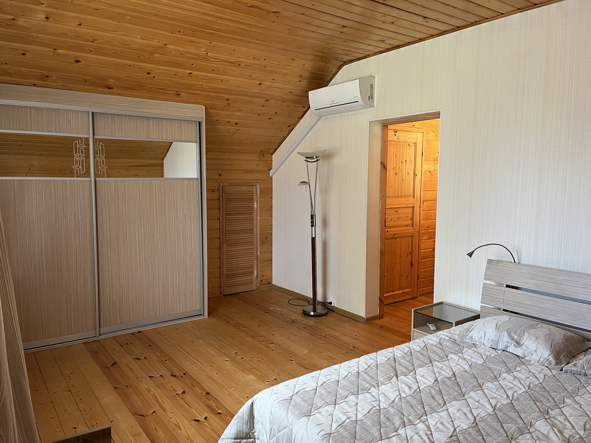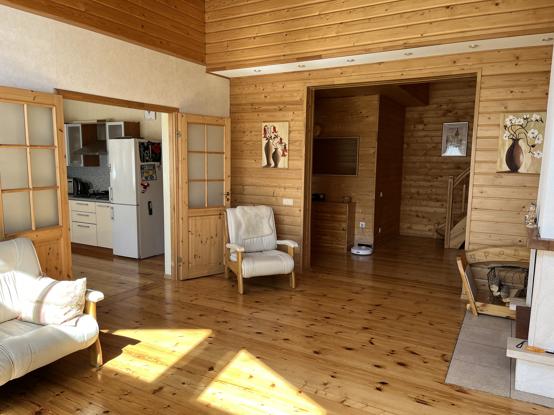 В доме отдельная кухня, гостиная со вторым светом, 2 сан. узла и 4 спальни, второй этаж -полумансардный.