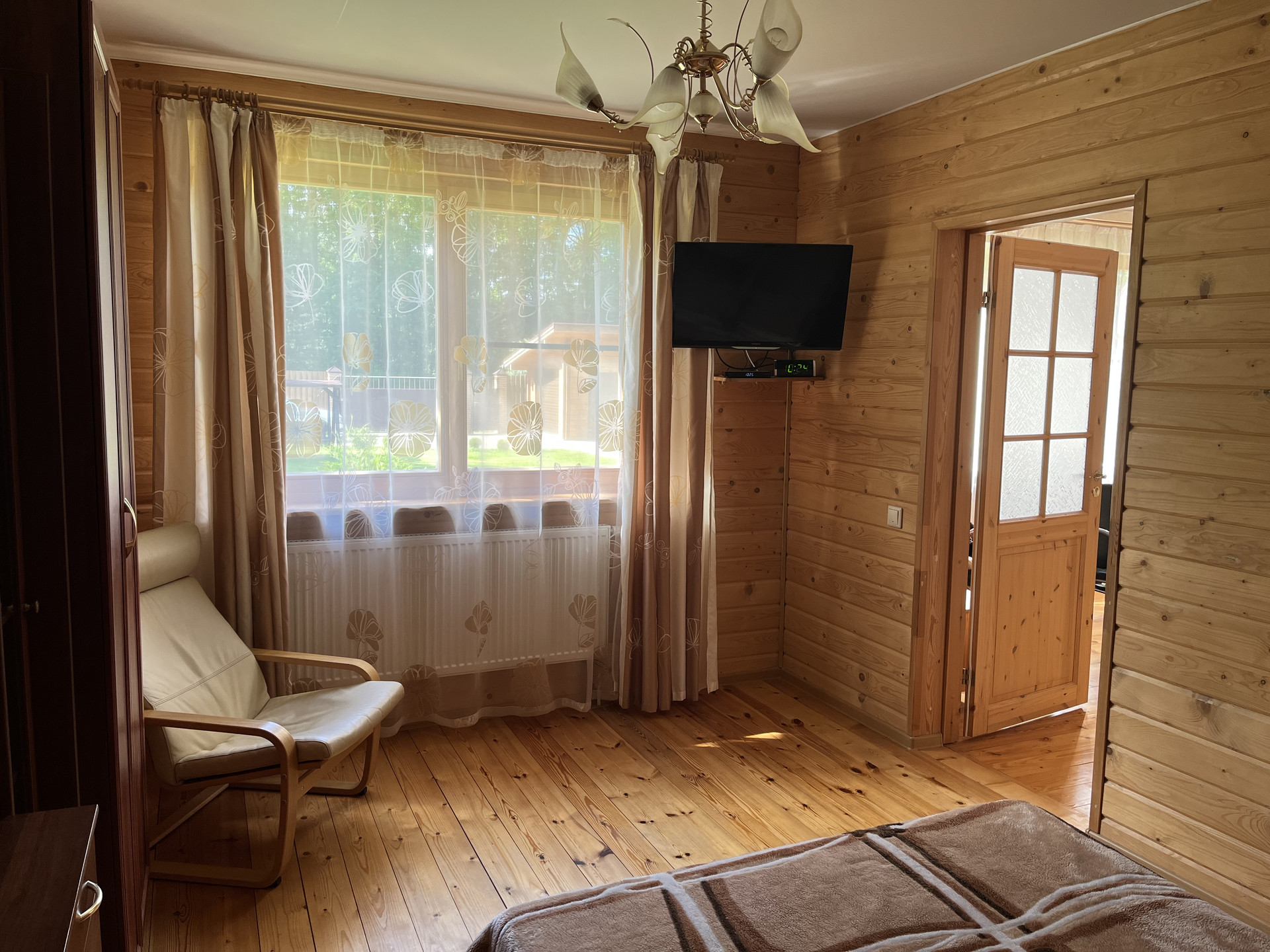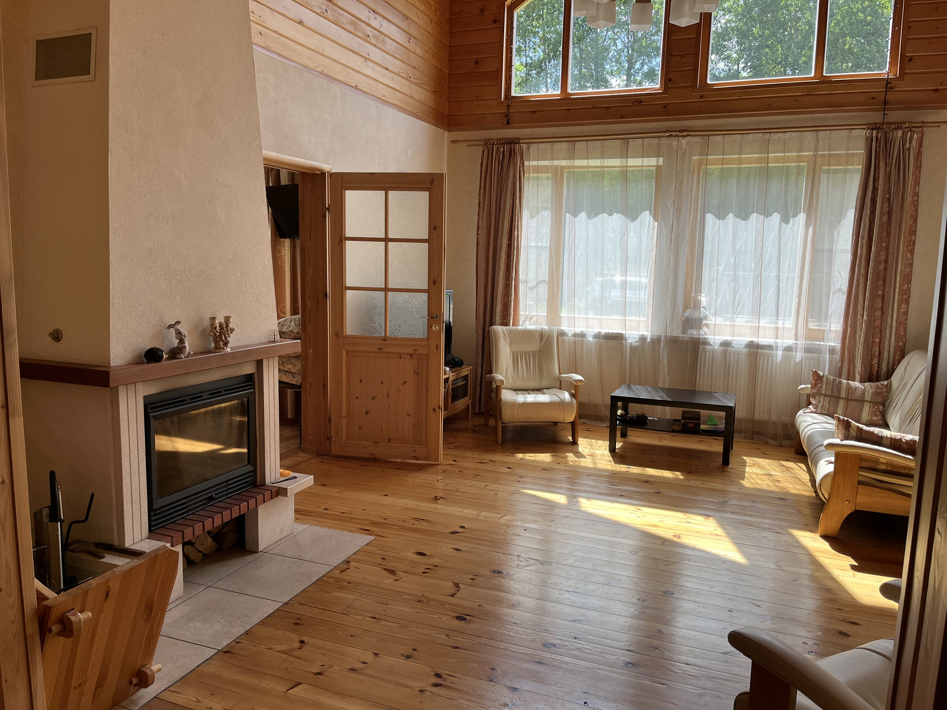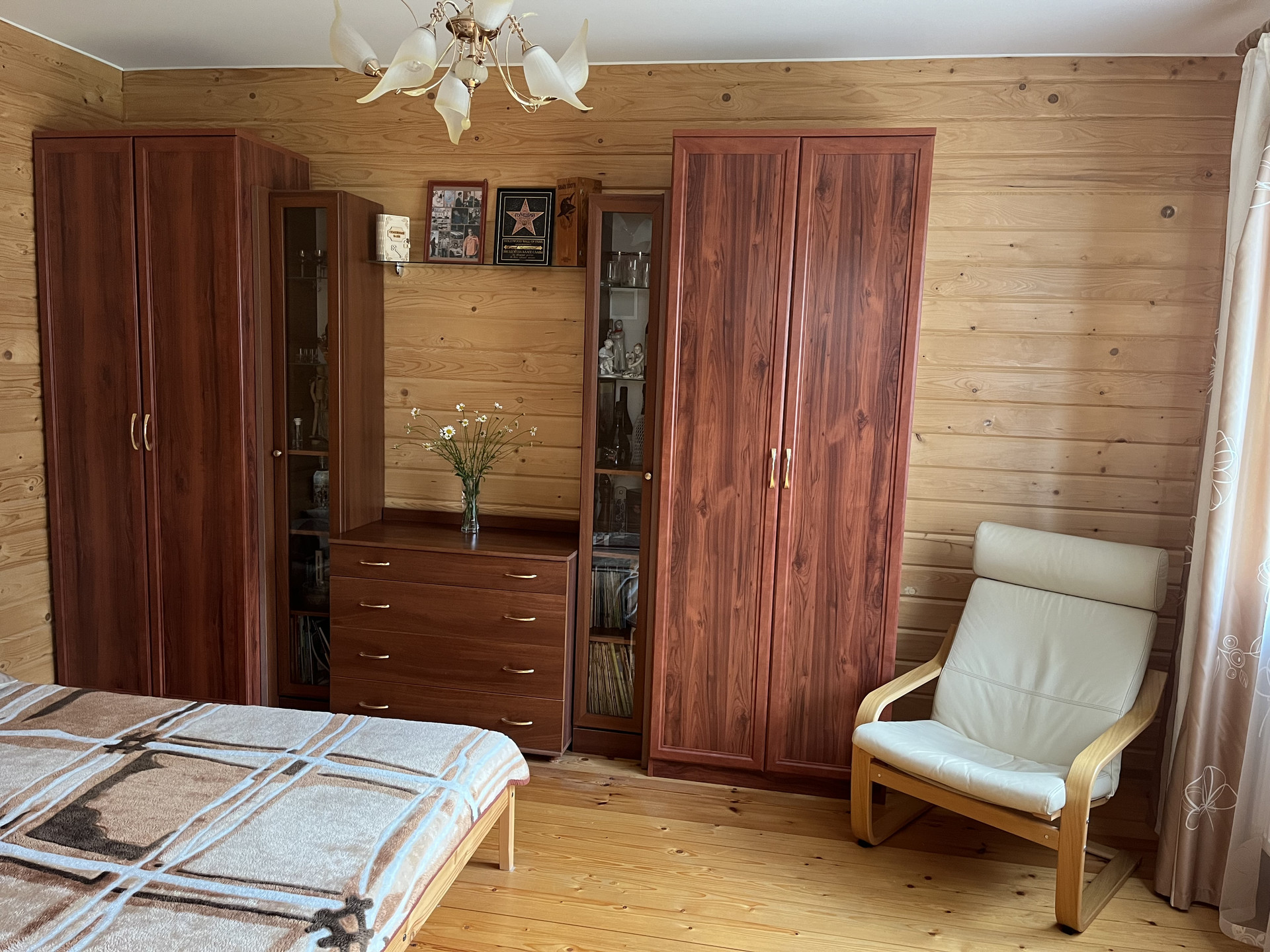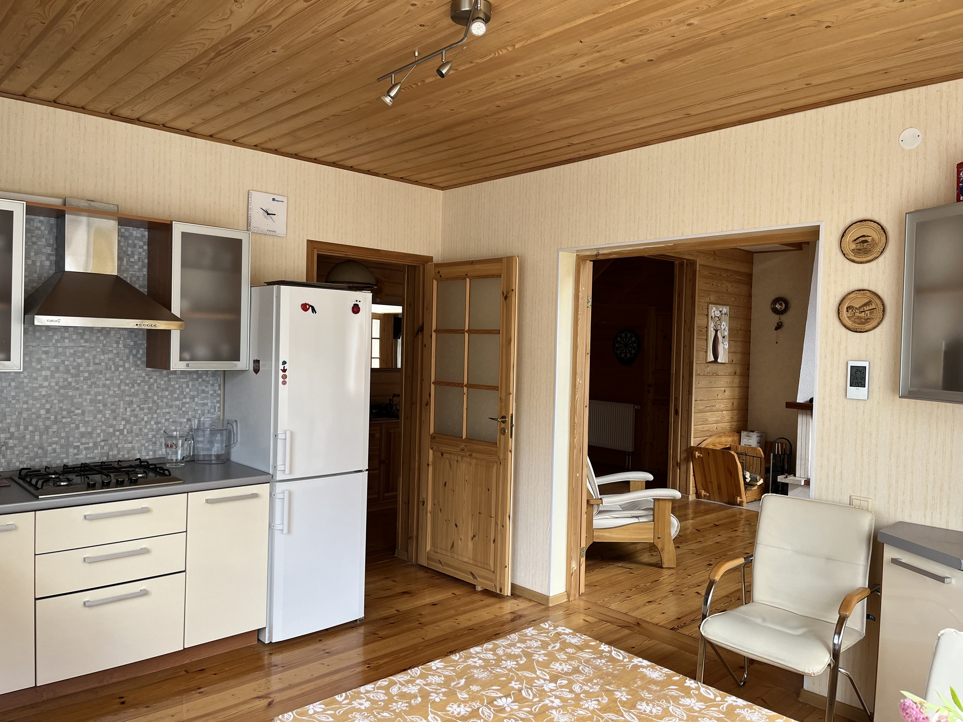 В доме отдельная кухня, гостиная со вторым светом, 2 сан. узла и 4 спальни, второй этаж -полумансардный.