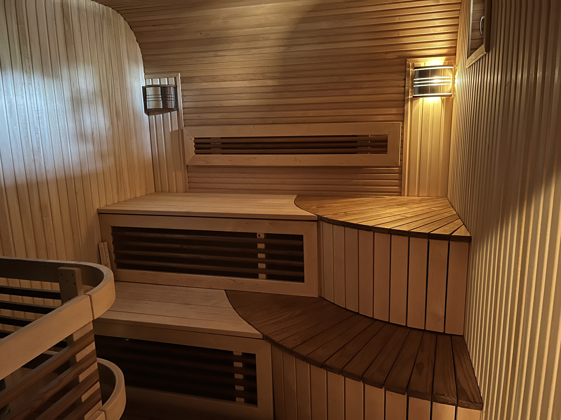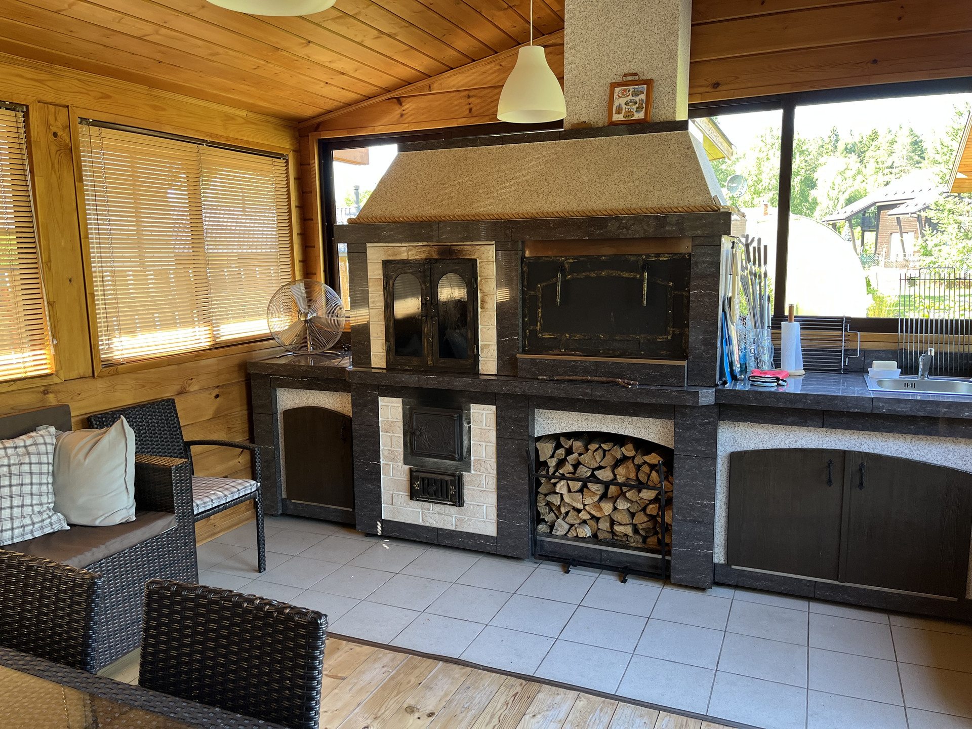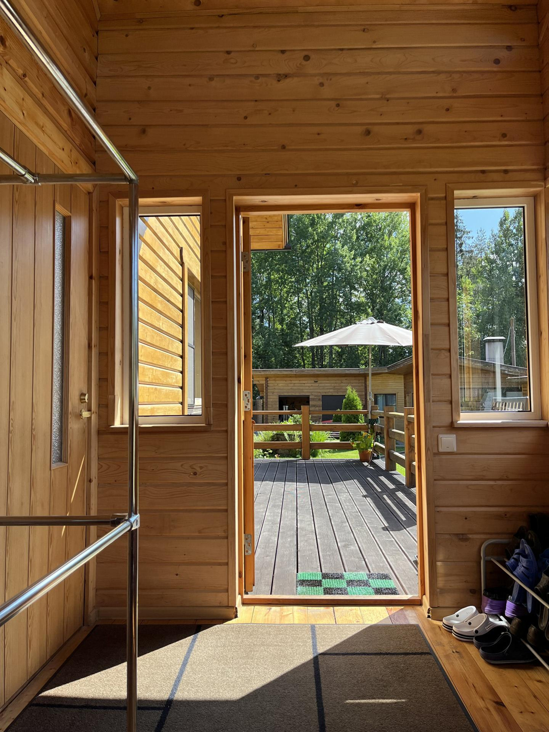 Дом и хозяйственный блок оформлен в едином стиле. Конструкция дома – каркас с утеплением эковатой, плитами IZOPLAT и обшит блок-хаусом толщиной 4,5 см, терраса целиком сделана из лиственницы, хозяйственный блок – изготовлен из клееного бруса с дополнительным утеплением эковатой в помещении бани.