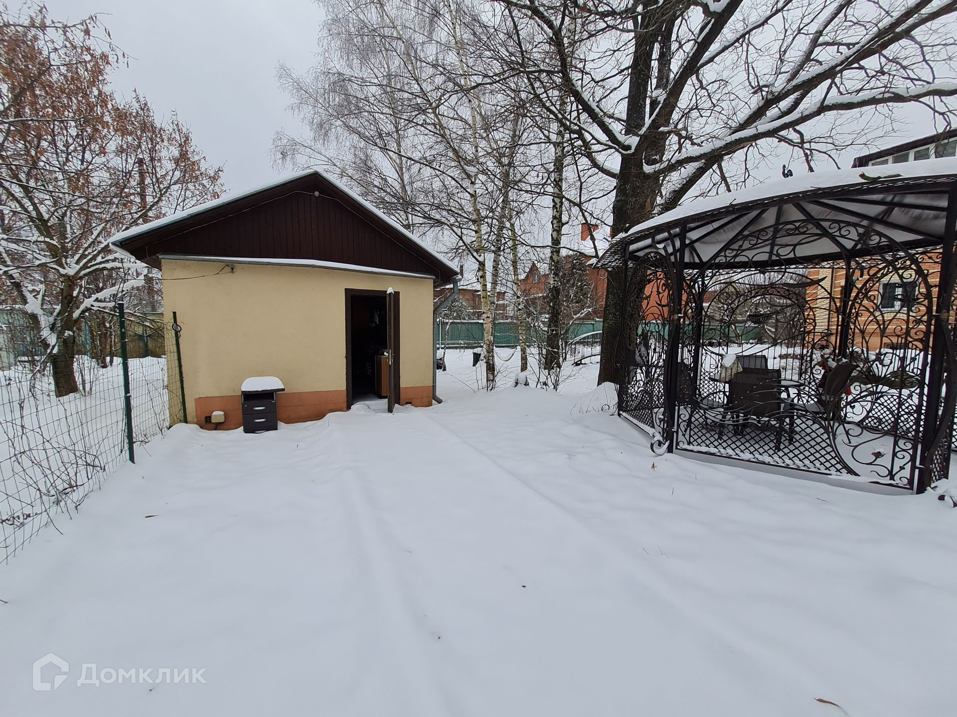 Участок прямоугольный, ухоженный с плодово-ягодными растениями. На участке хоз.постройка для хранения и отапливаемый дом-гараж, где можно разместить персонал или сделать гостевую/летнюю комнату.