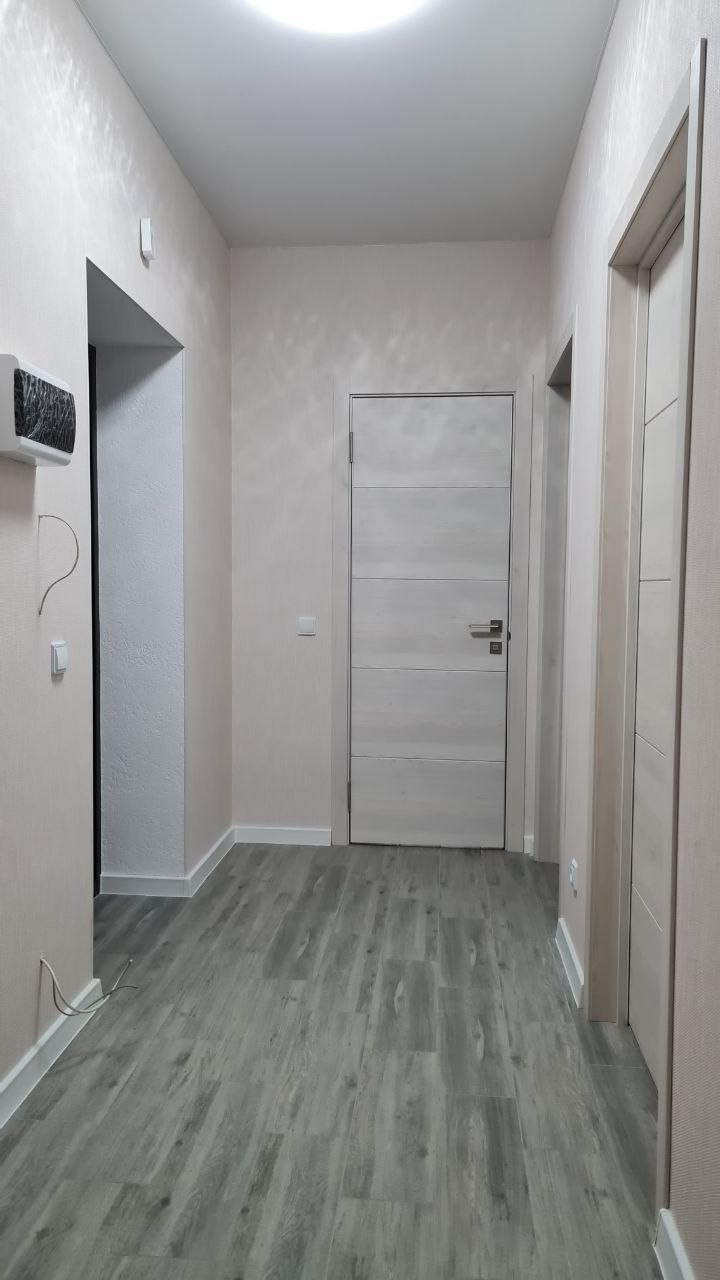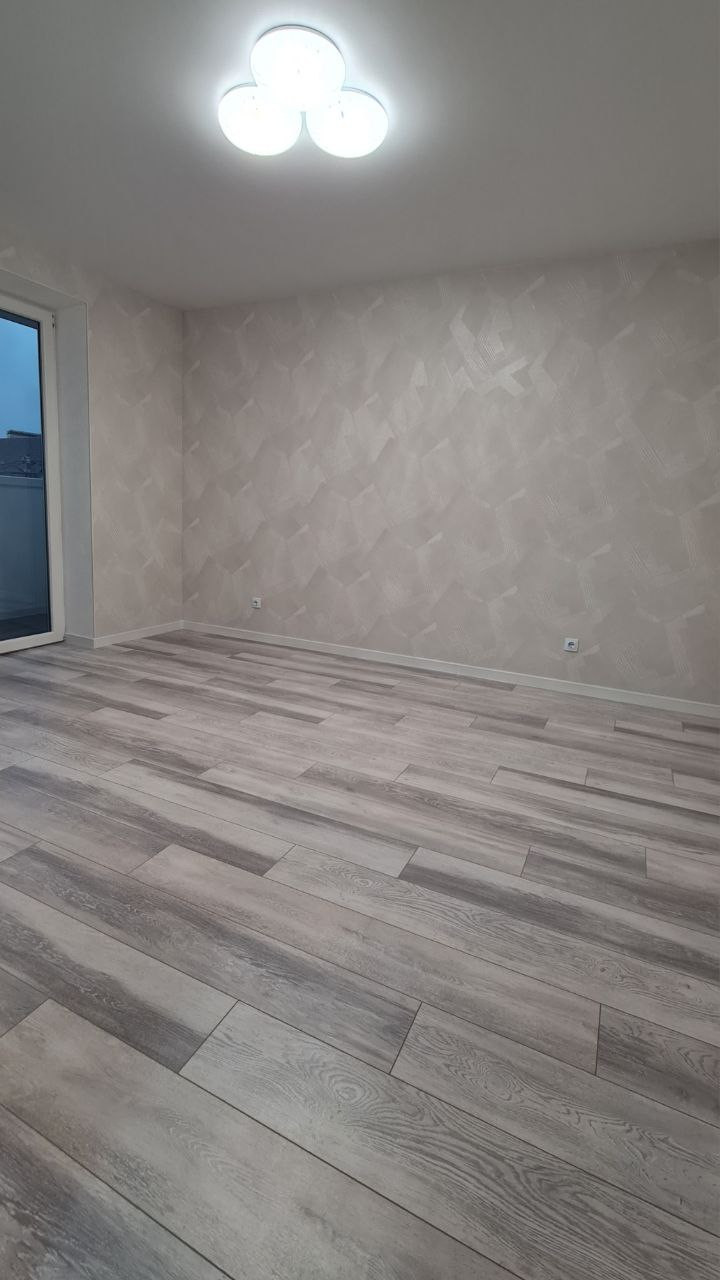 Отделка: обои, натяжной потолок, светильники, ламинат в комнатах, плитка и теплый пол в прихожей, санузле и на кухне, межкомнатные двери, качественная сантехника, зеркало с подсветкой.
