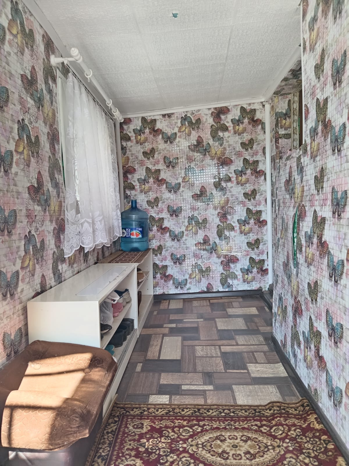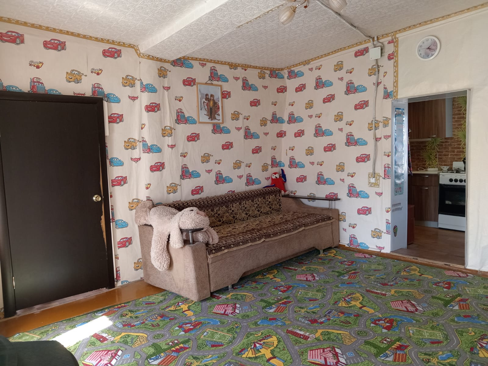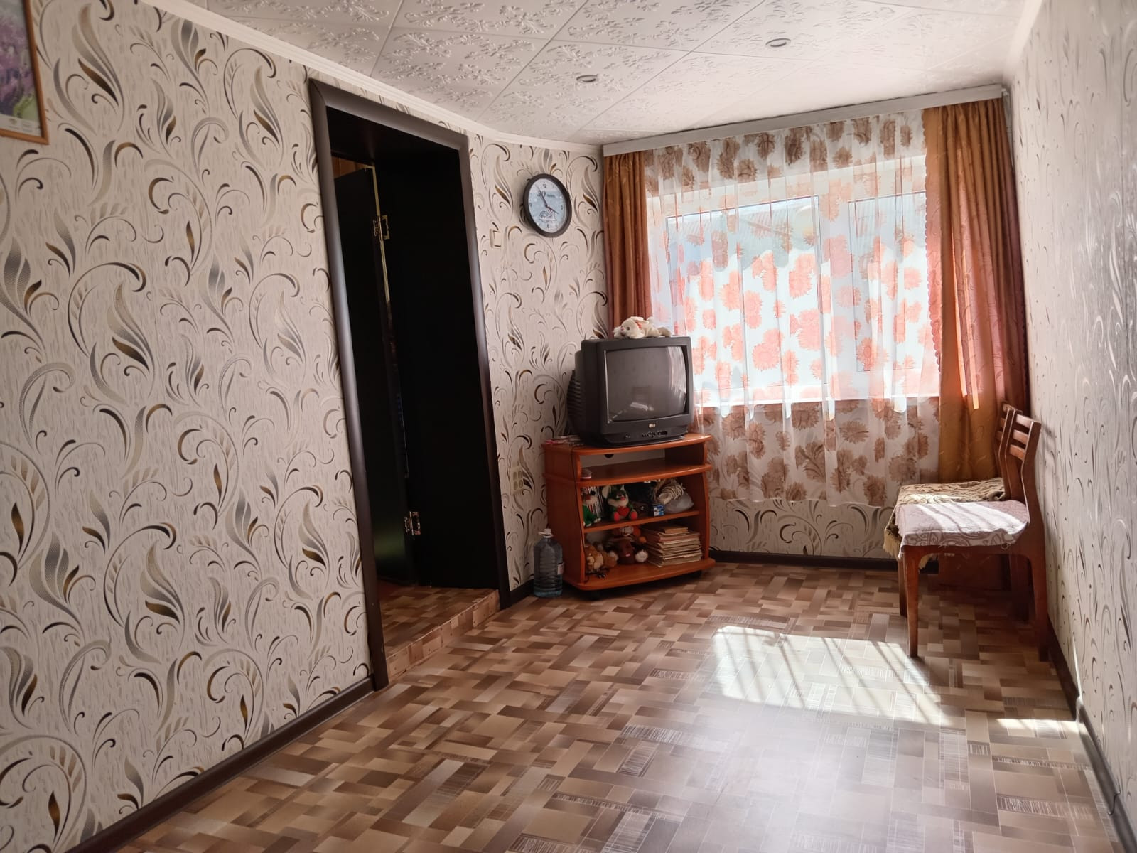 Потолки в комнате и зале оклеены потолочной плиткой ,на кухне потолок из гипсокартона со встроенными светильниками. Стены выровнены, оклеены обоями, на полу линолеум . Евроостекление во всем доме, установлена входная железная дверь.