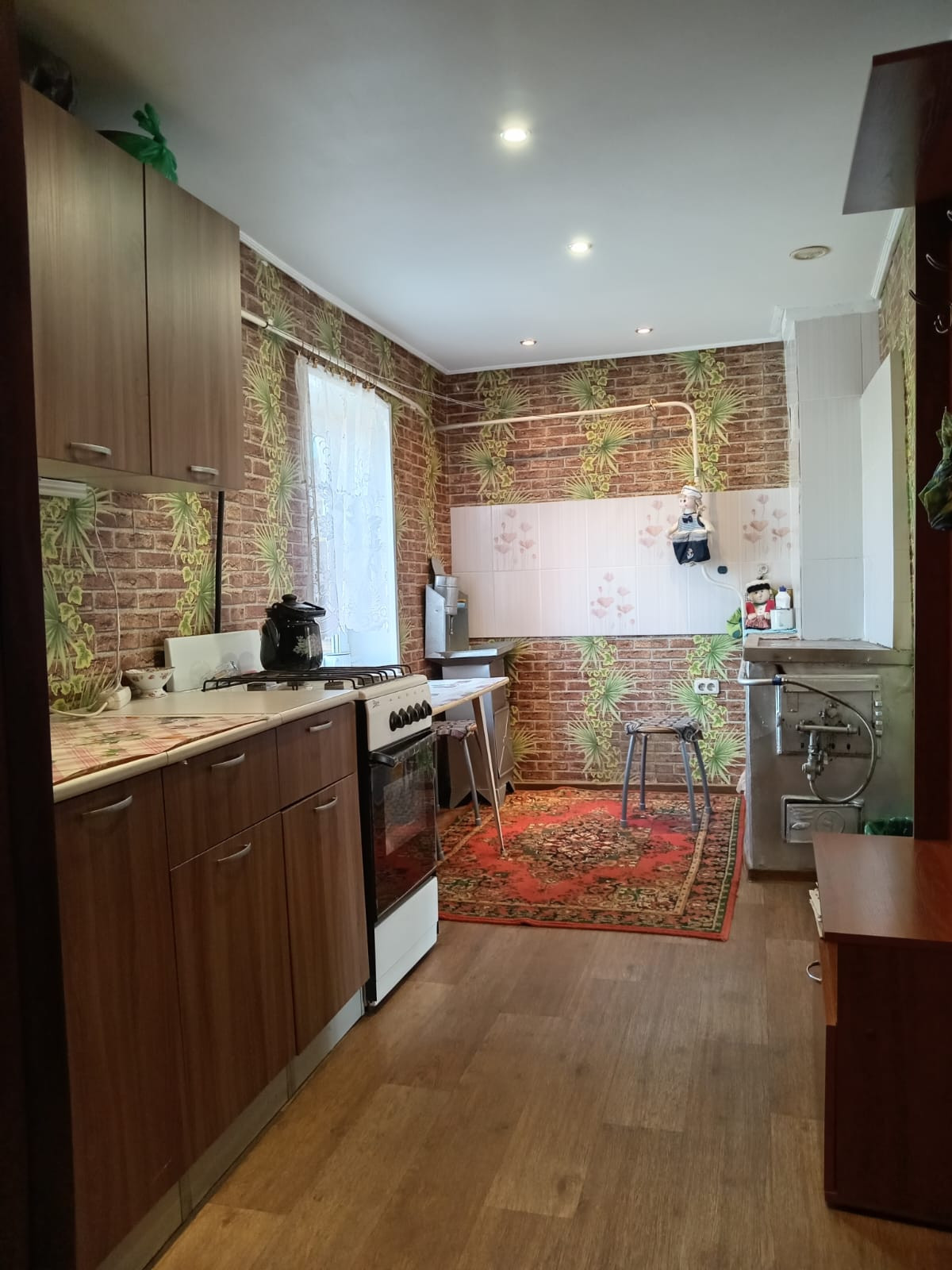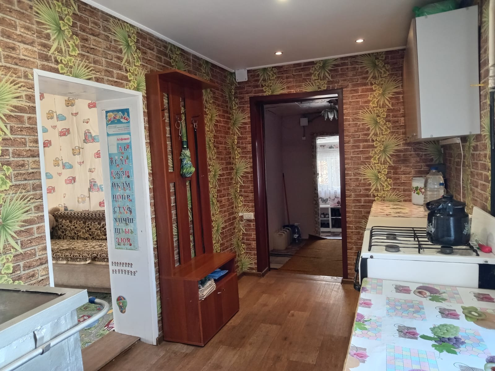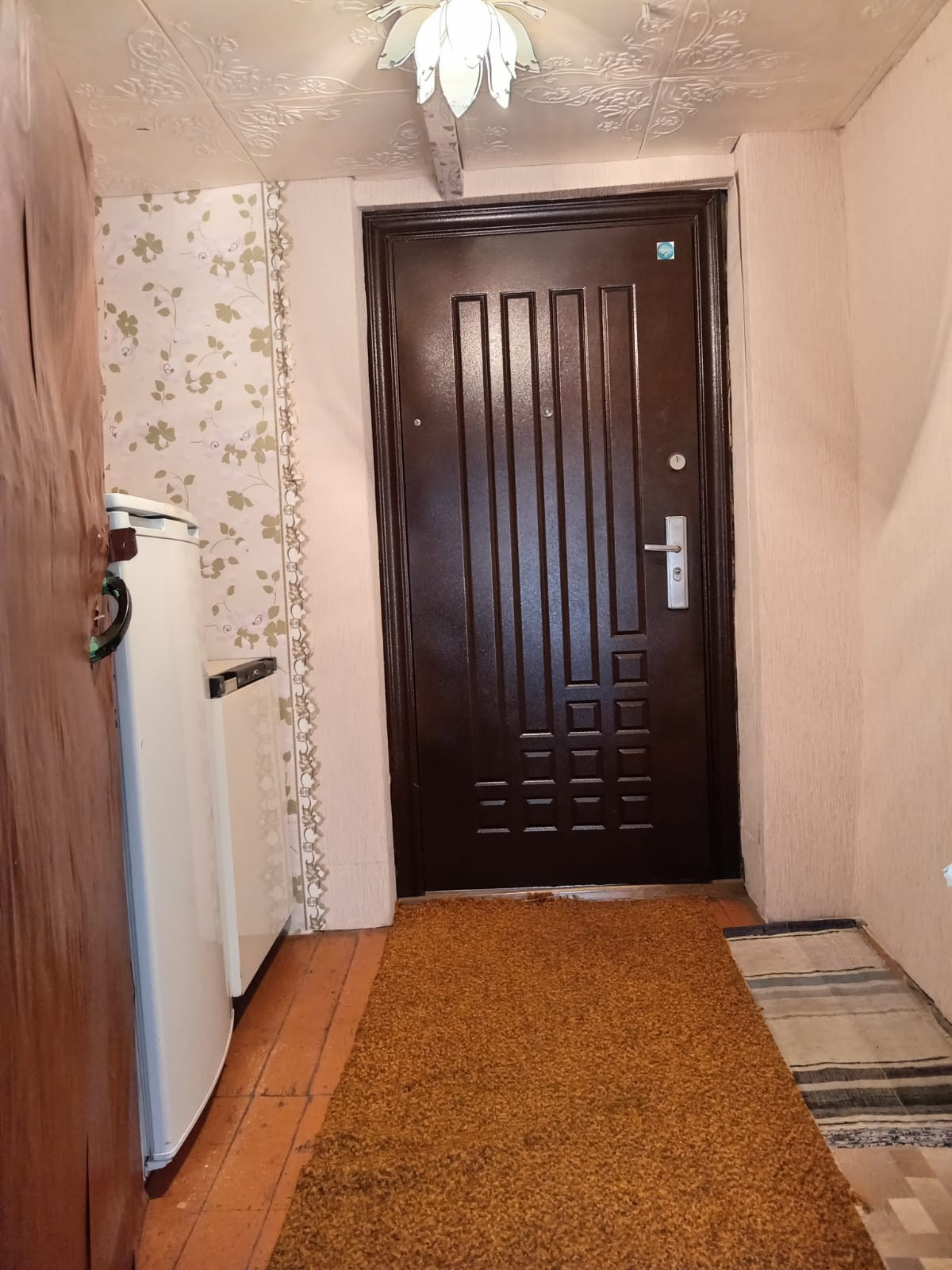 Потолки в комнате и зале оклеены потолочной плиткой ,на кухне потолок из гипсокартона со встроенными светильниками. Стены выровнены, оклеены обоями, на полу линолеум . Евроостекление во всем доме, установлена входная железная дверь.