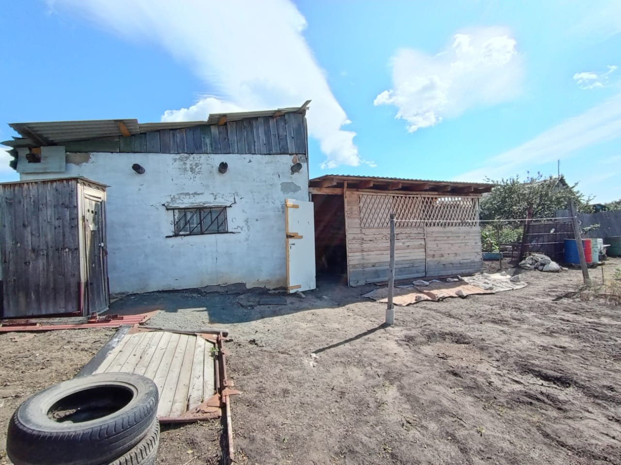 - две хоз.постройки (одна из шлакоблока, крыша-шифер; вторая из дерева с овощной ямой, крыша-профнастил);