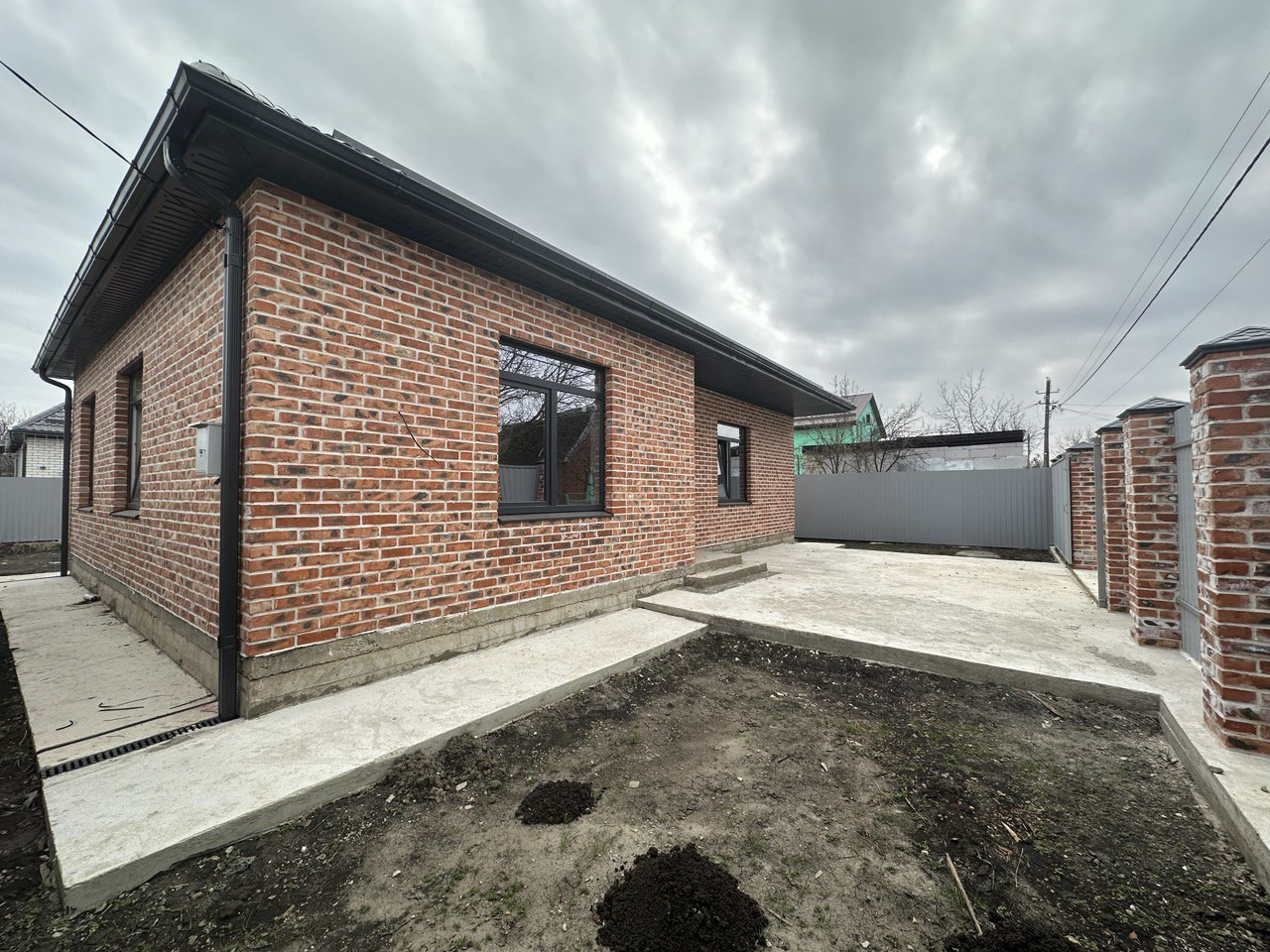 Дом сдается в предчистовой отделке( вытянуты стены (штукатурка, шпатлевка), стяжка пола, полипропиленовые трубы, развод сантехники, радиаторы),теплый пол, разводка электрики, установлен двухконтурный котел. Территория огорожена кирпичным забором, двор отсыпан щебнем, установлены откатные ворота, калитка.
