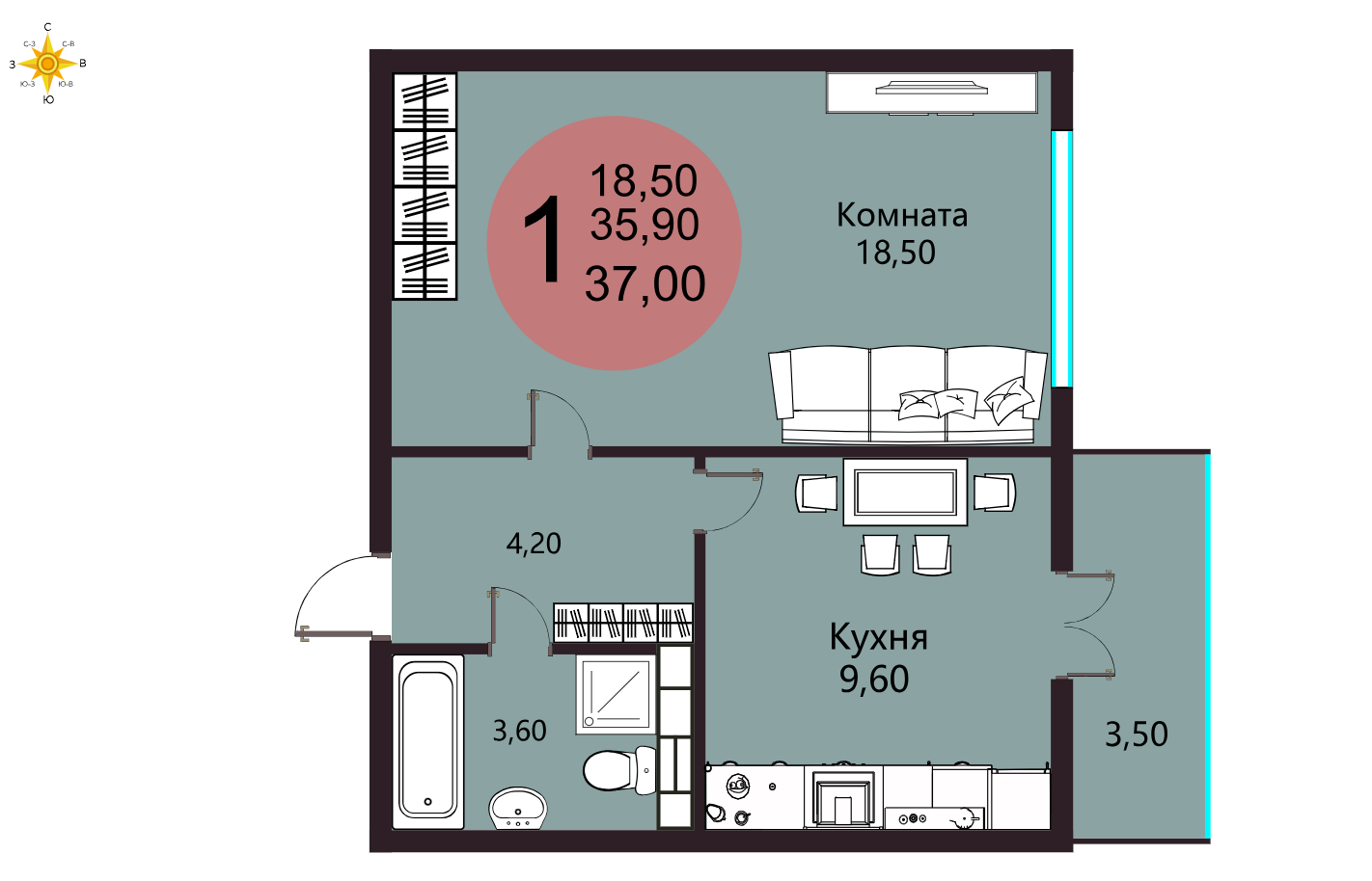 Общая площадь 37 м2