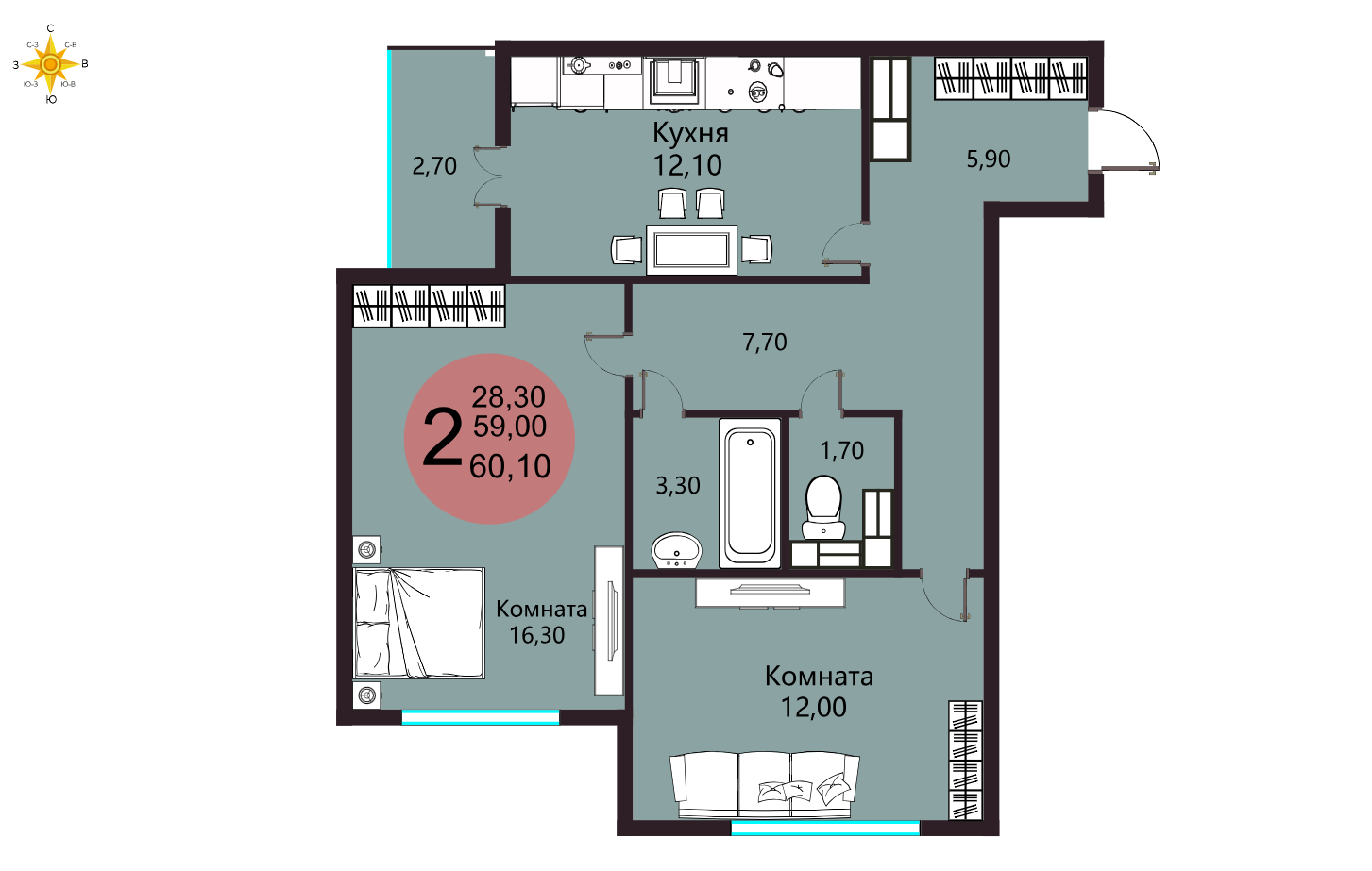 Общая площадь 60.1 м2