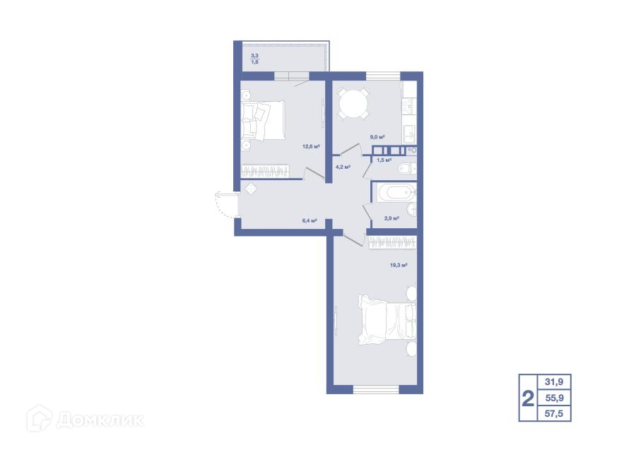 Общая площадь 57.5 м2