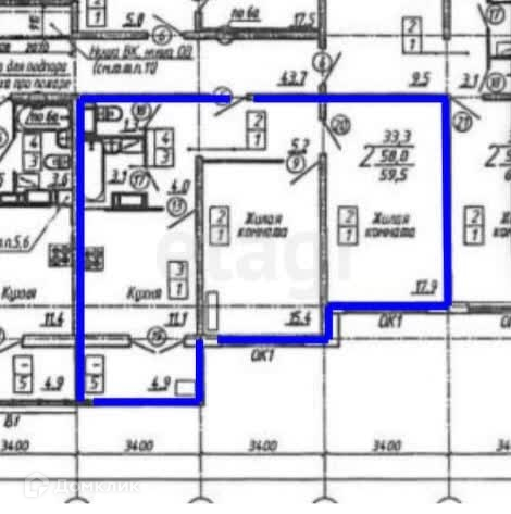 Площадь квартиры 59 квадратных метров, жилая площадь 33,3 квадратных метров, кухня 11,1 квадратный метр, балкон 4,9 квадратных метров. Санузел раздельный.