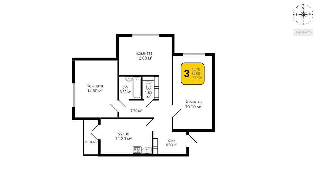 Общая площадь 77.4 м2