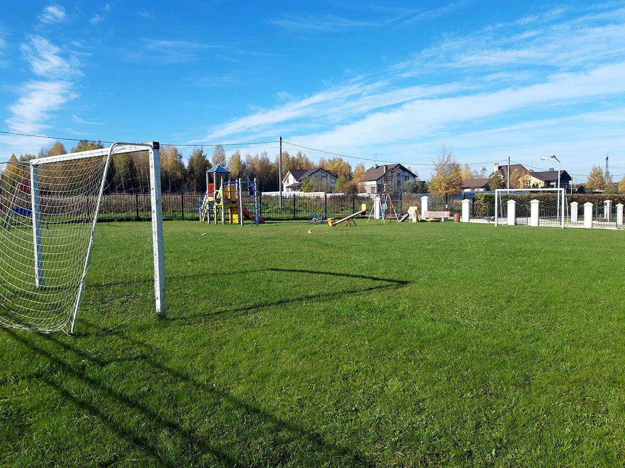 В поселке имеется уже оборудованная детская площадка, футбольное поле, административное здание. Освещение улиц и асфальтированная дорога проходит по всему поселку которые всегда находятся в чистоте и порядке. Территория полностью огорожена и находится под круглосуточным видеонаблюдением, проехать на территорию можно только по электронной системе.