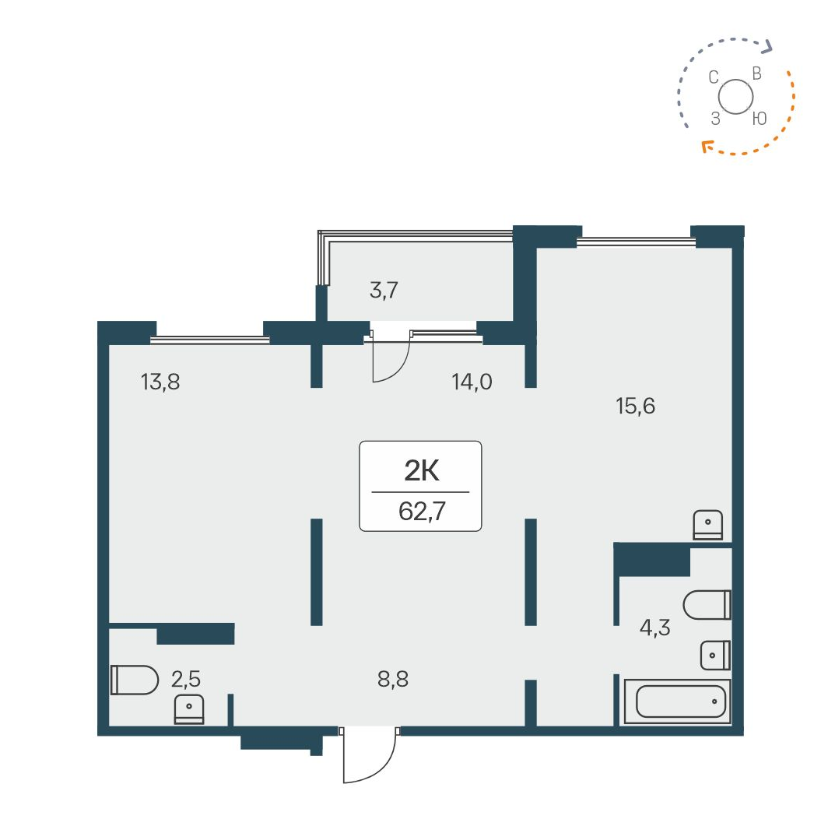 Общая площадь 62.7 м2