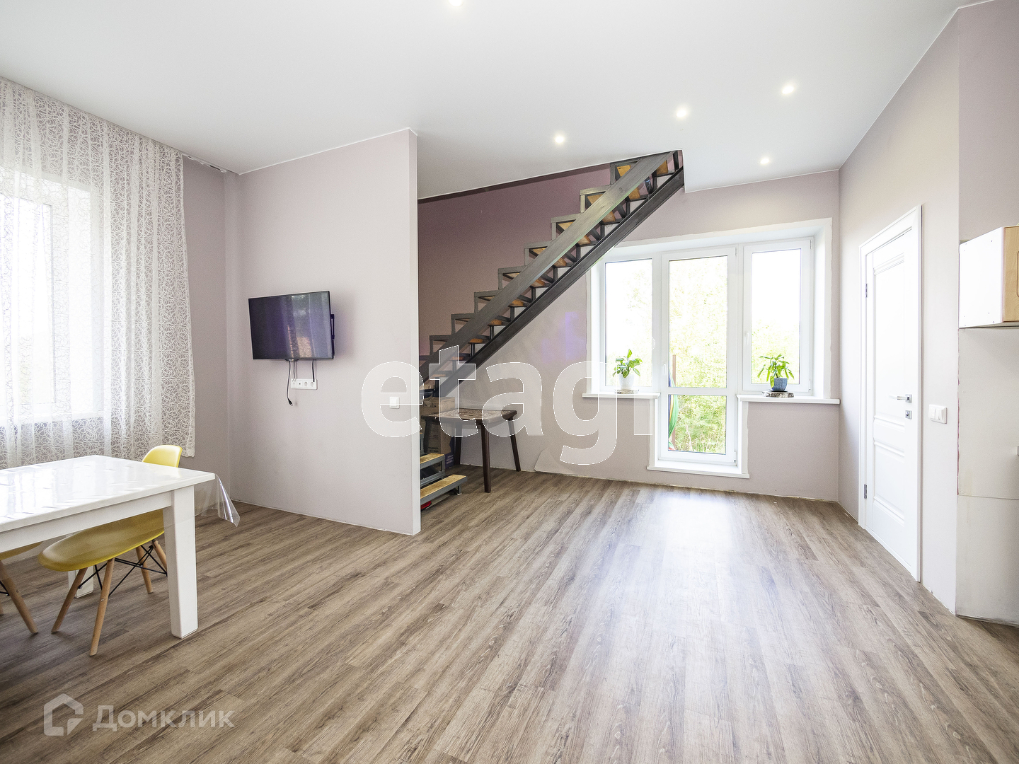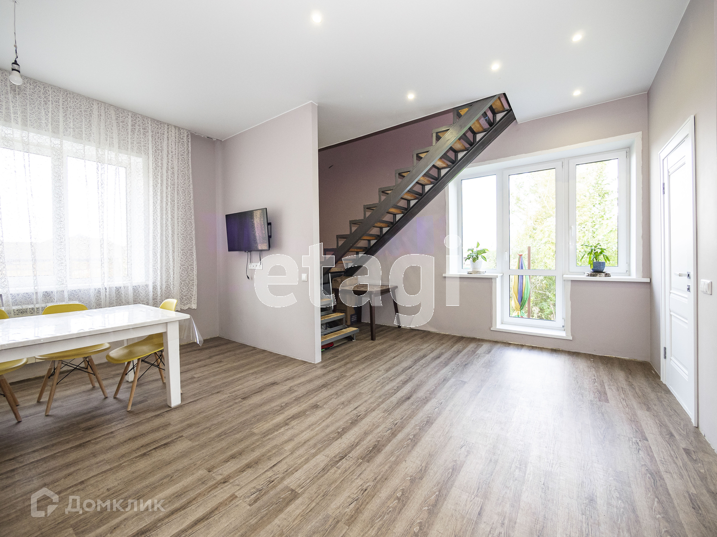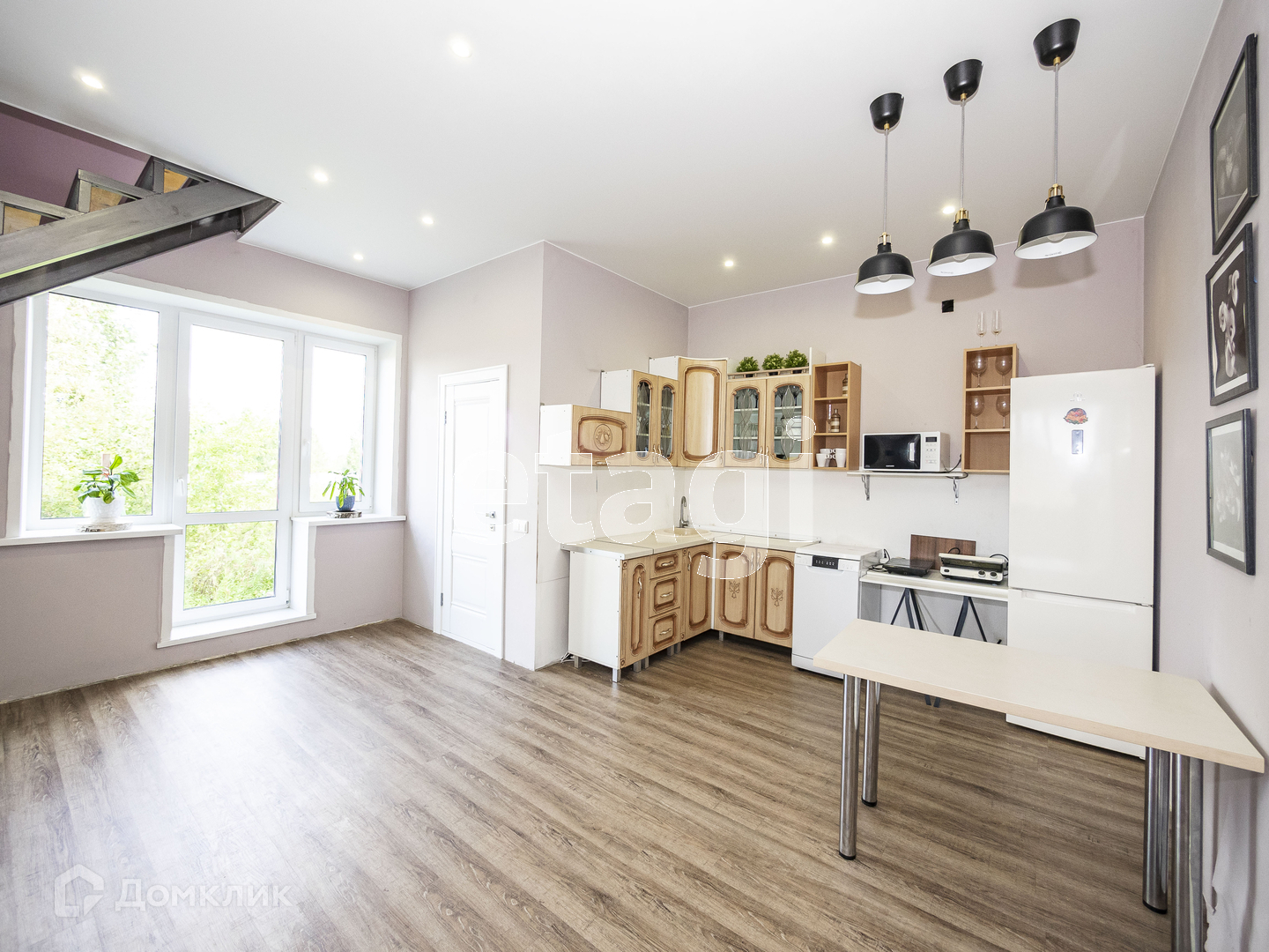 На первом этаже мы видим просторную и светлую кухню-гостинную (37 кв.м.) , площадь позволяет собираться большой компанией на семейные праздники или приглашать друзей на выходные. Интерьер выполнен в современном стиле. Продумано все до мелочей. Для комфортного проживания на первом этаже сделан теплый пол и положена кварцвиниловая плитка. Стены ровные и покрашены в приятный светлый оттенок. На потолках натяжной потолок с точечными светильниками, свет зонирован и предусмотрены переходные выключатели. На первом этаже гостевой туалет и душевая (4.7 кв.м.) . С первого на второй этаж поднимаемся по комфотной лестнице, под ней организовано пространство для хранения вещей. Лестница освещается и установлены переходные выключатели.